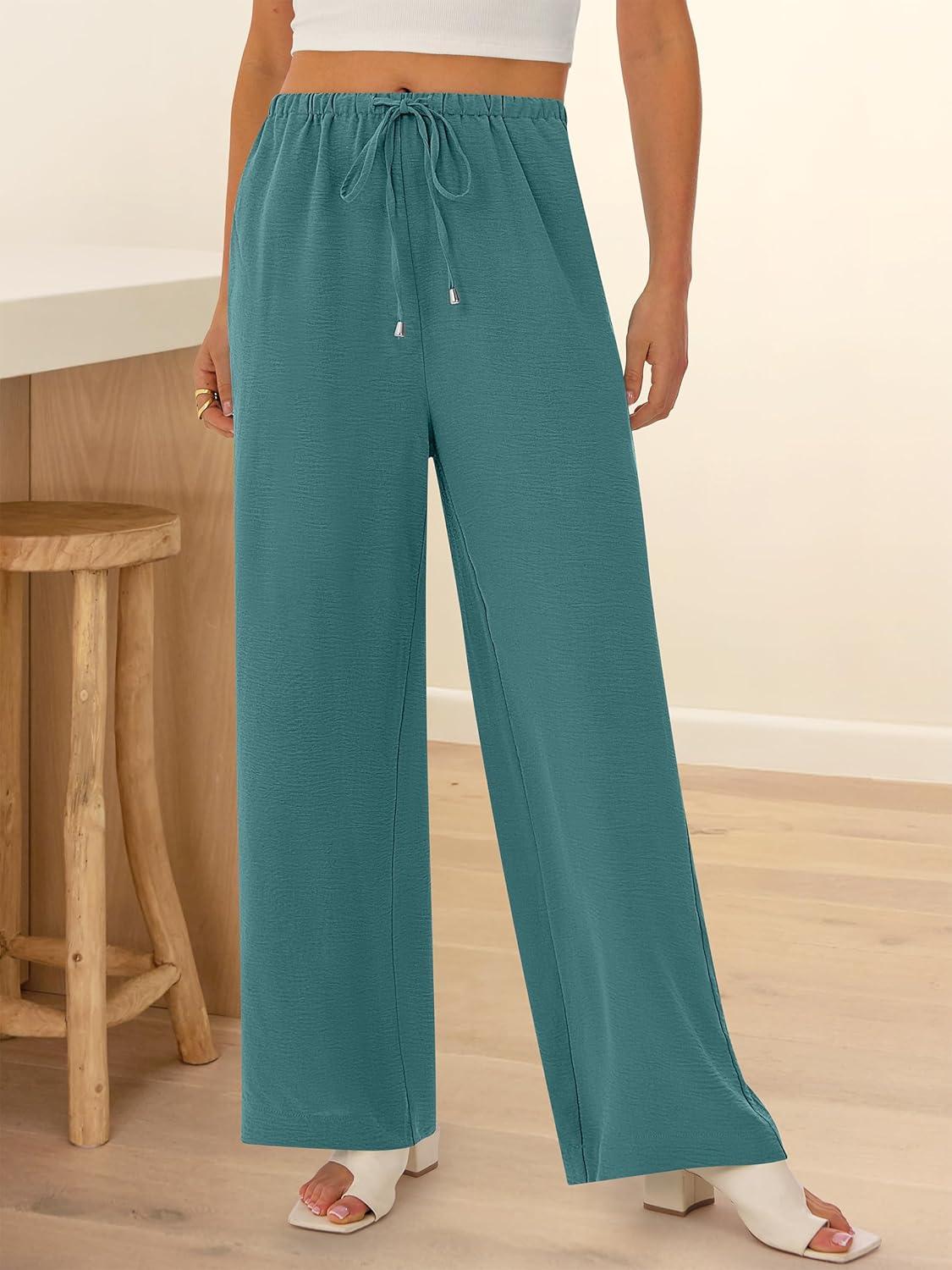 ABRABESS Womens Palazzo Pants Wide Leg Flowy Drawstring High Waisted Casual Trousers 2026 Summer Beach Vacation Clothes(Lake)
