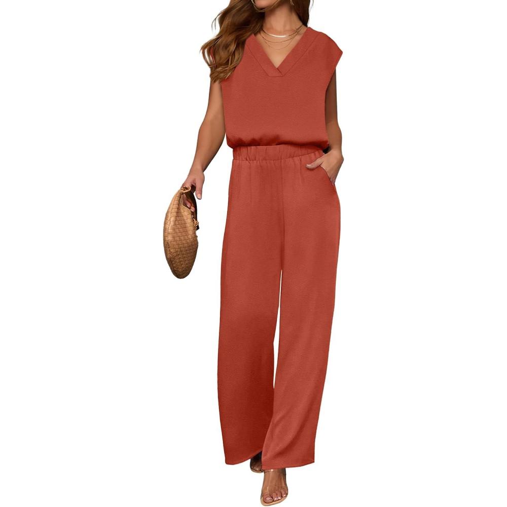 imageANRABESS 2 Piece Sets for Women Lounge Outfits Summer V Neck Cap Sleeve Top Wide Leg Pants Vacation Beach Travel SetOrange Red