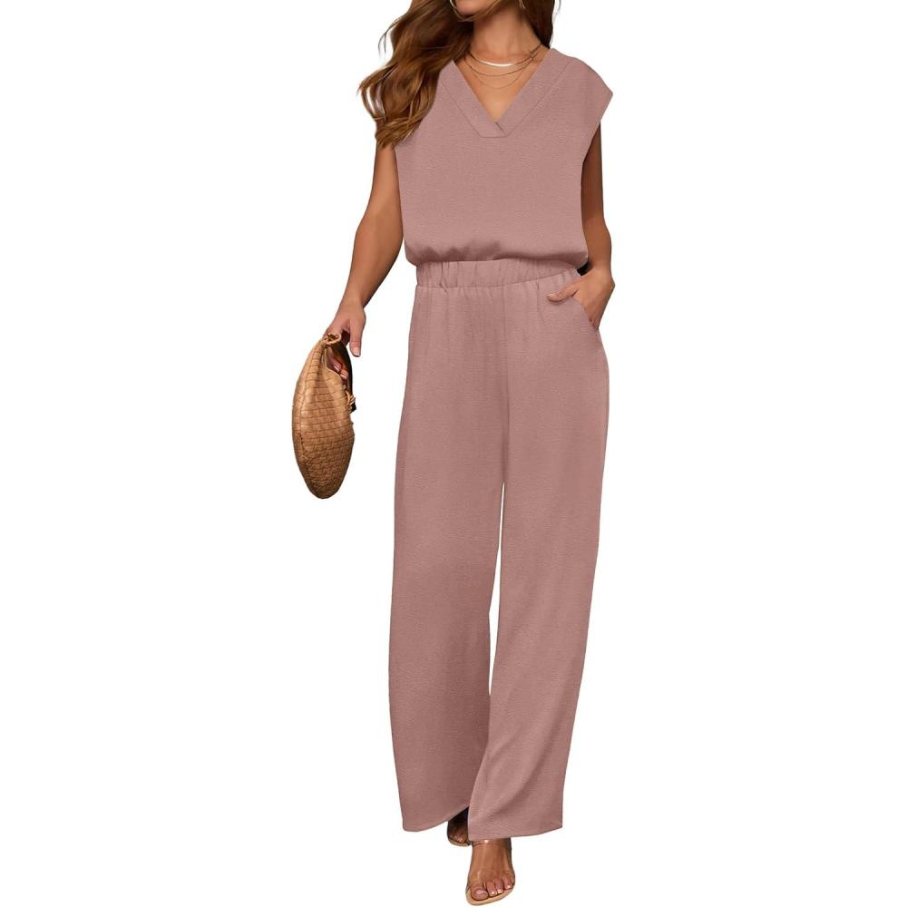 imageANRABESS 2 Piece Sets for Women Lounge Outfits Summer V Neck Cap Sleeve Top Wide Leg Pants Vacation Beach Travel SetPink
