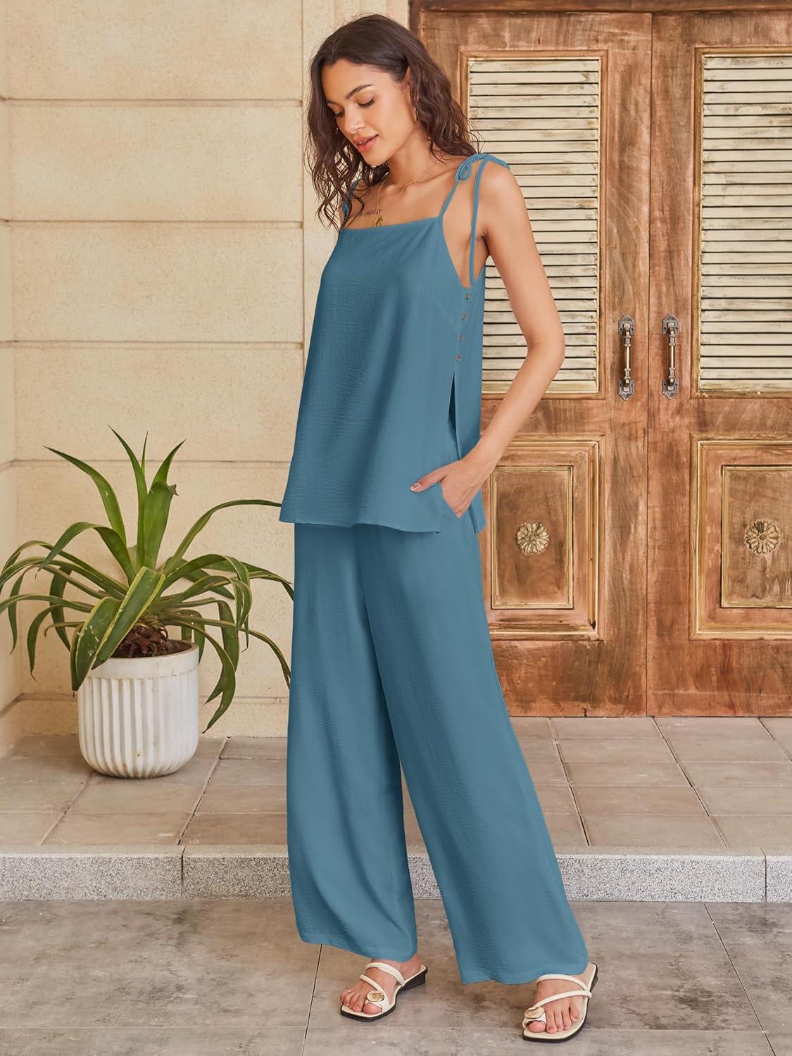 ANRABESS 2 Piece Sets for Women Summer Casual Lounge Spaghetti Strap Top Wide Leg Pants Set Vacation Beach Travel Outfits(Lake)