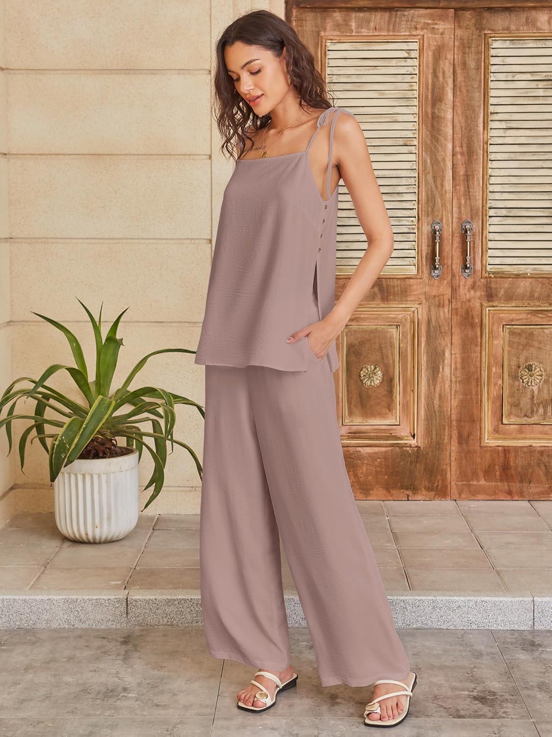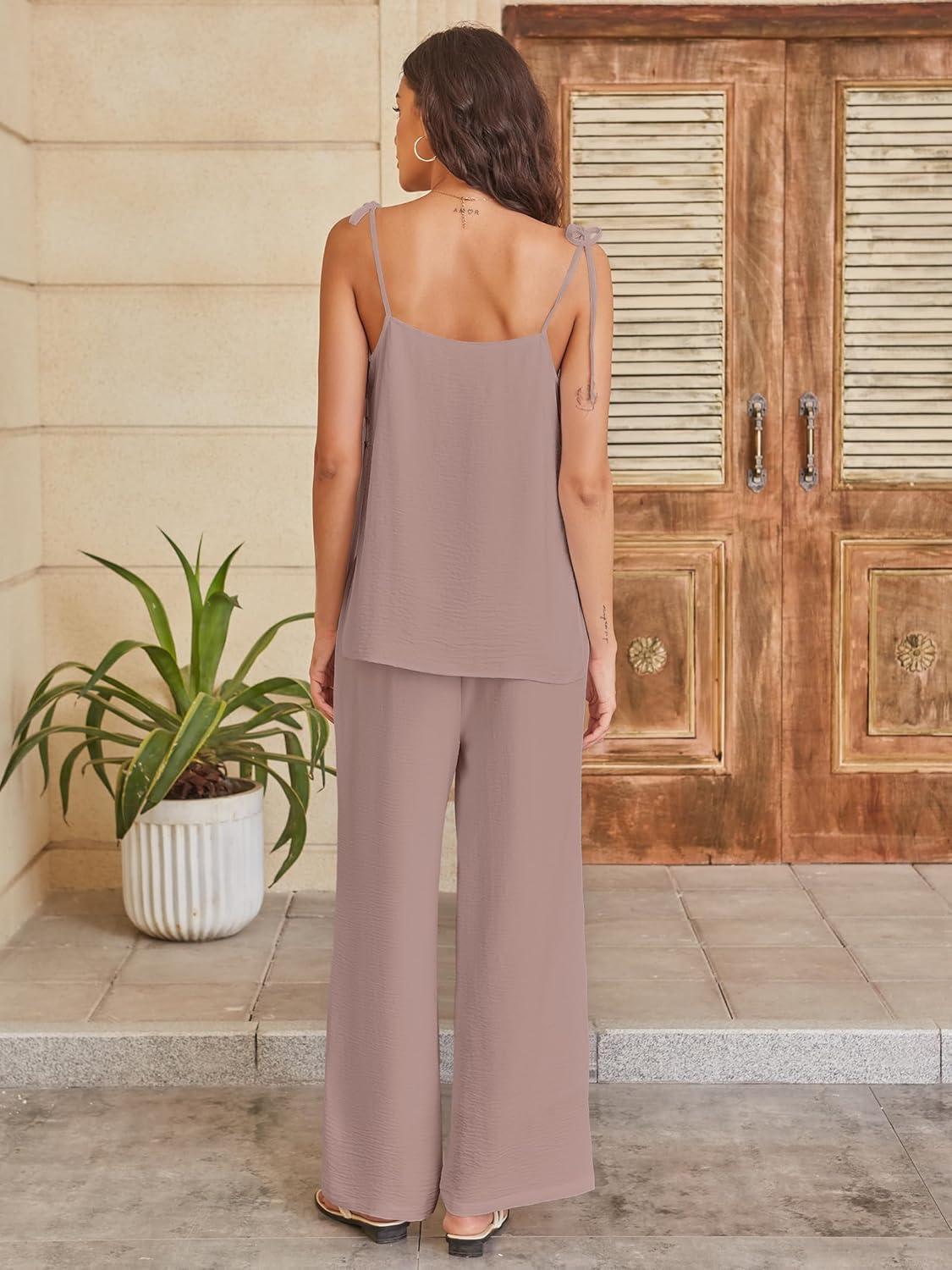 ANRABESS 2 Piece Sets for Women Summer Casual Lounge Spaghetti Strap Top Wide Leg Pants Set Vacation Beach Travel Outfits(Light Camel)