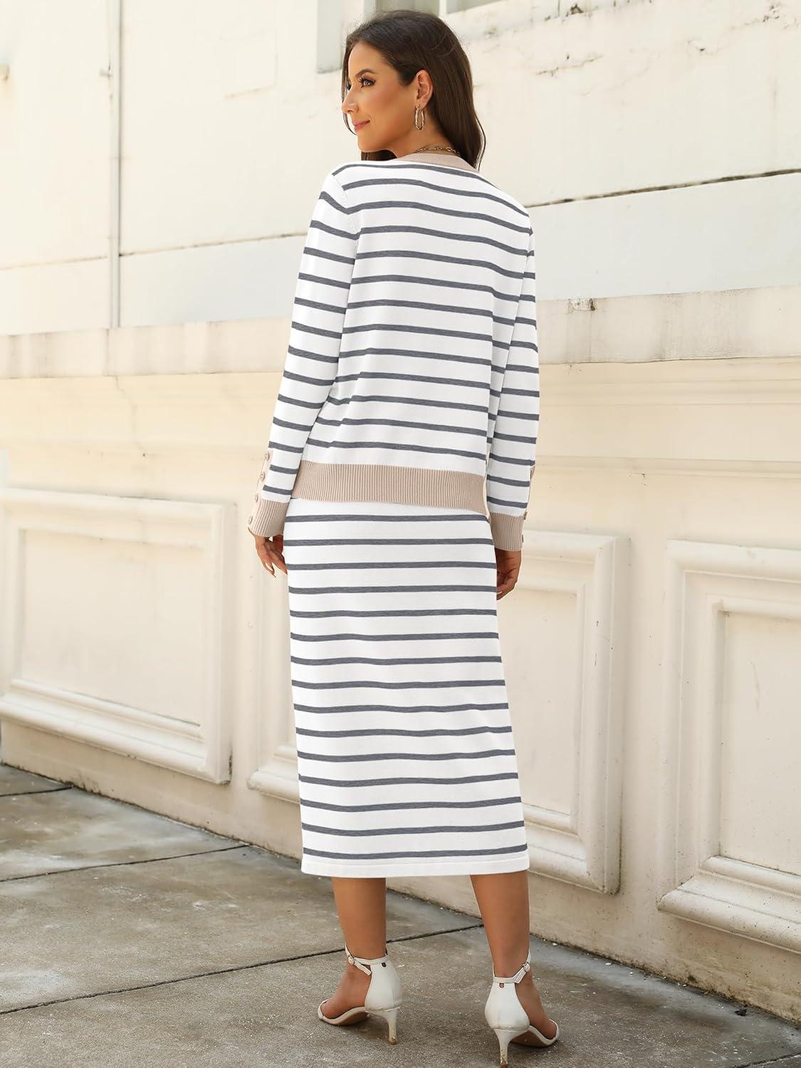 ANRABESS 2 Piece Skirts Sets For Women Fall Fashion 2025 Striped Sweater Midi Dress Knit Lounge Travel Outfits Winter Clothes(White Grey Beige)