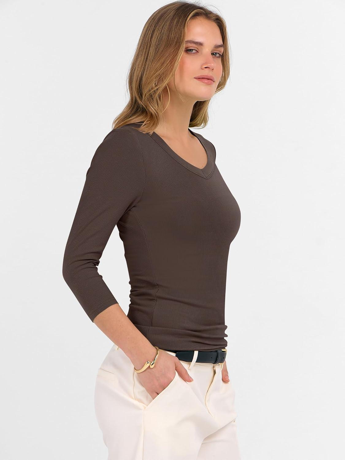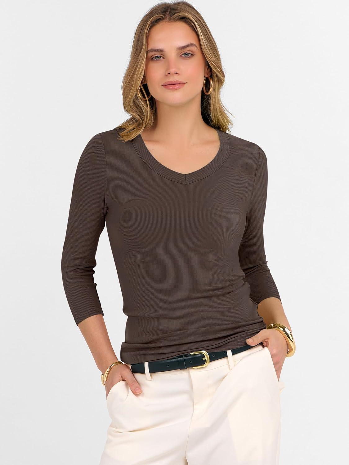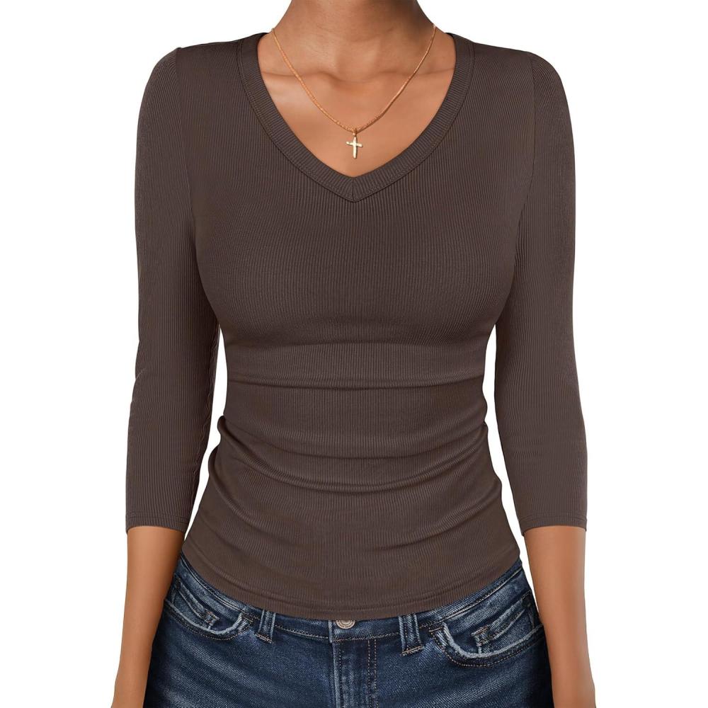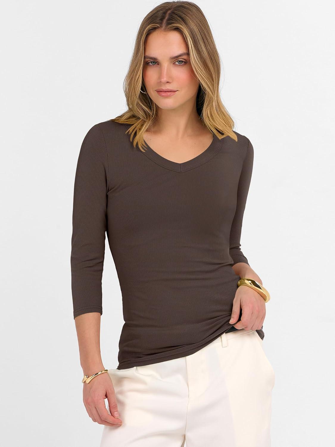 ANRABESS 3/4 Sleeve Shirts for Women V Neck Ribbed Knit Slim Fitted Tops Basic Tshirt 2026 Summer Casual Tees Trendy Outfits(Coffee)