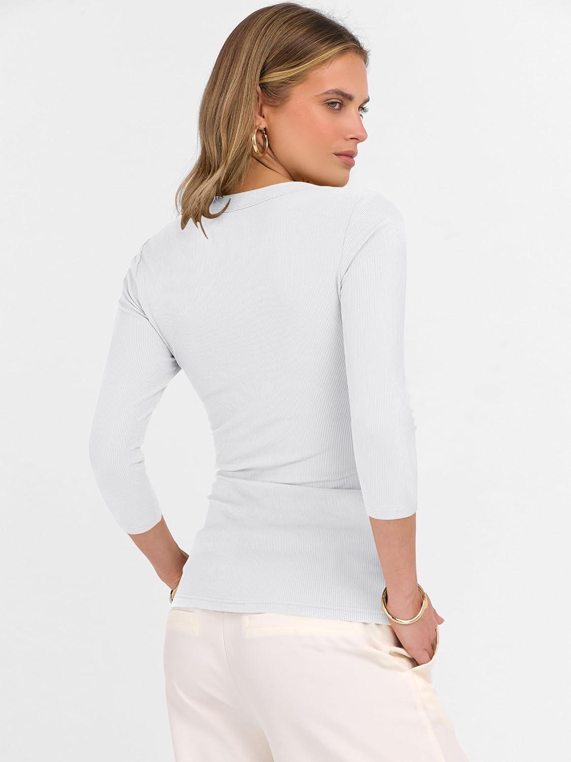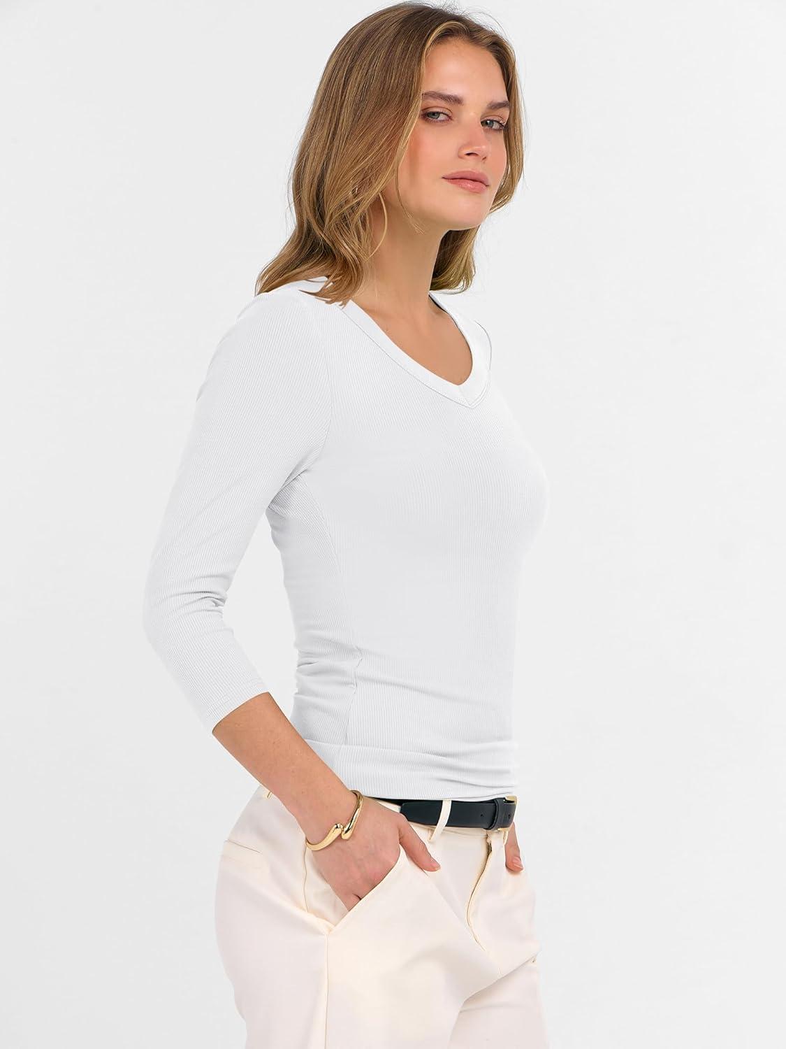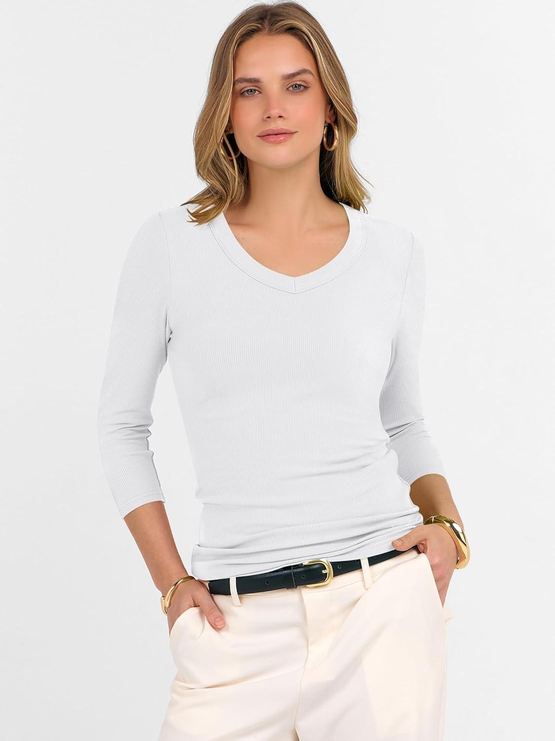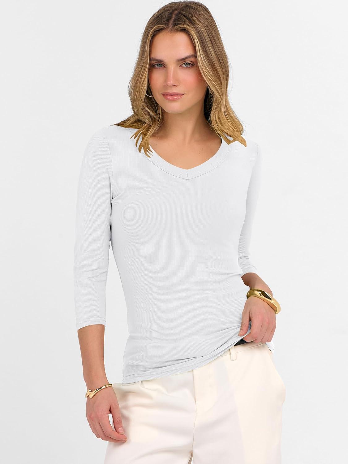ANRABESS 3/4 Sleeve Shirts for Women V Neck Ribbed Knit Slim Fitted Tops Basic Tshirt 2026 Summer Casual Tees Trendy Outfits(White)