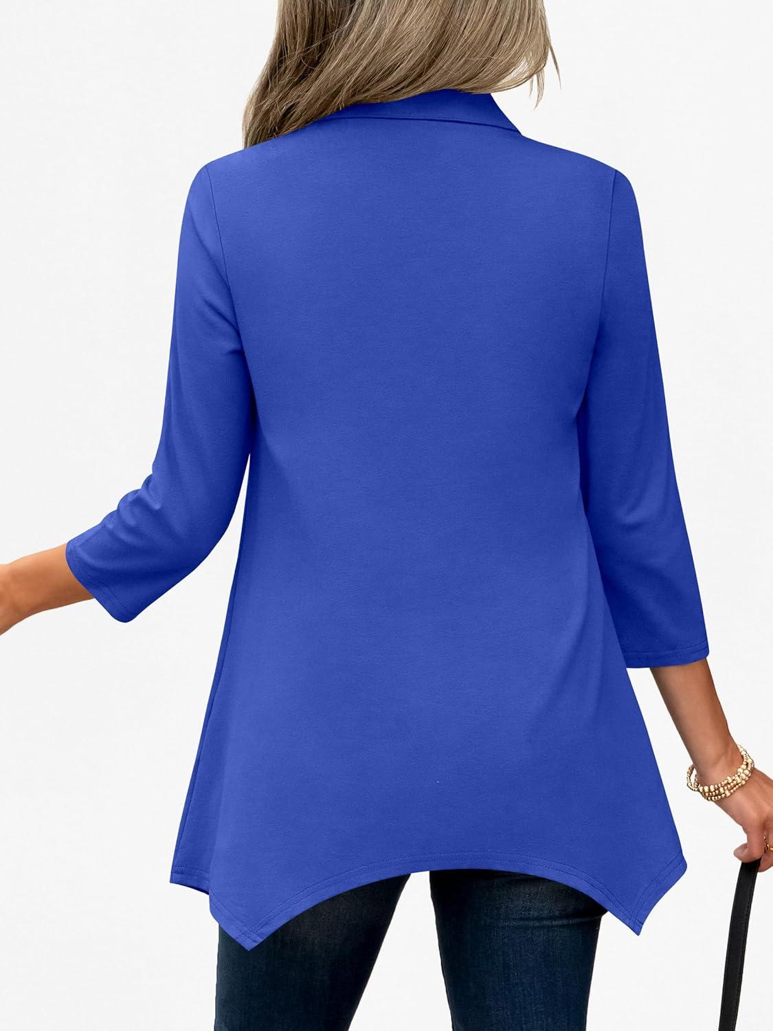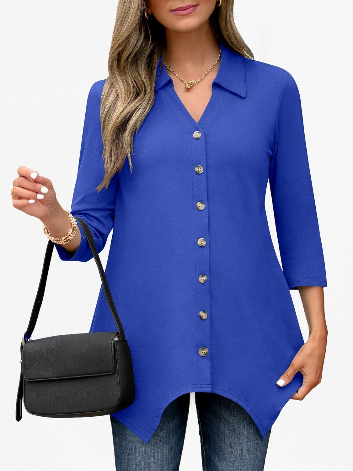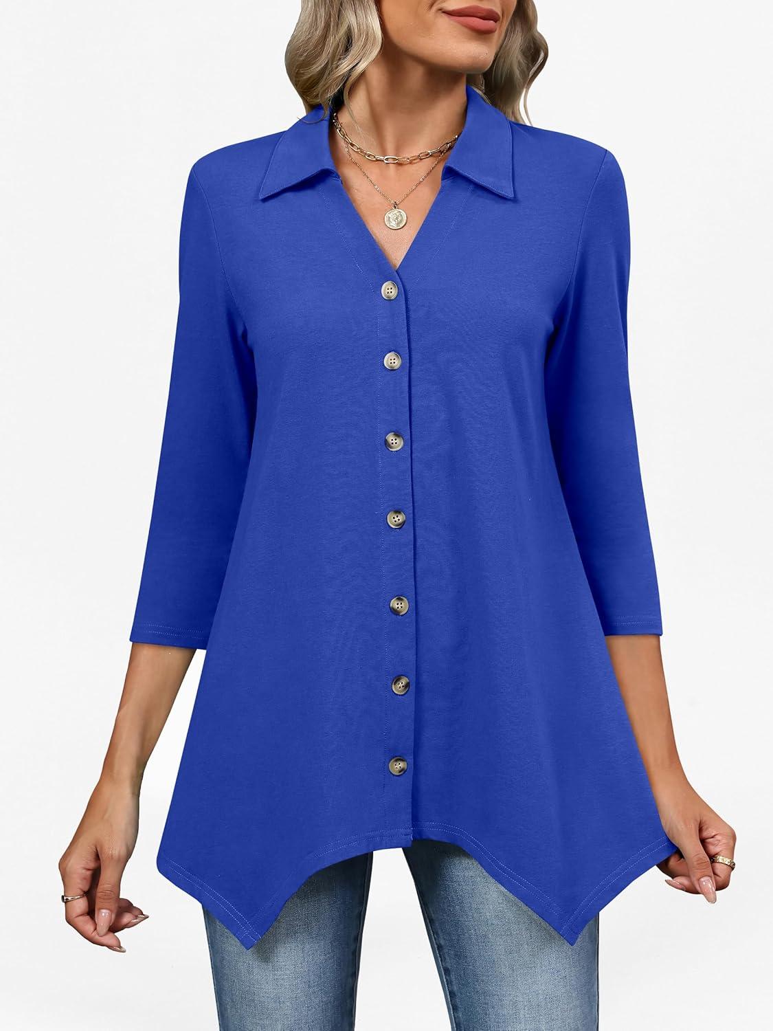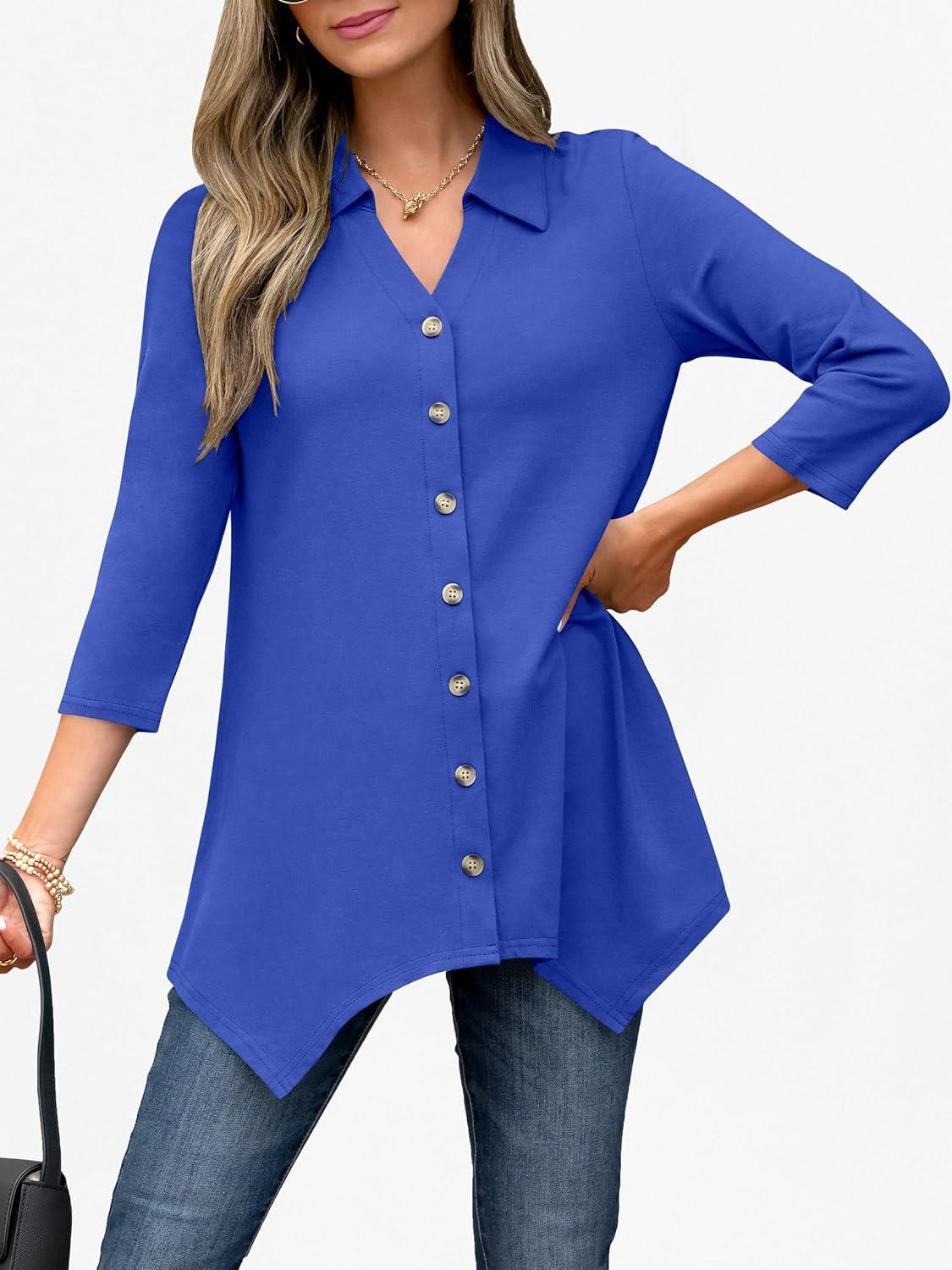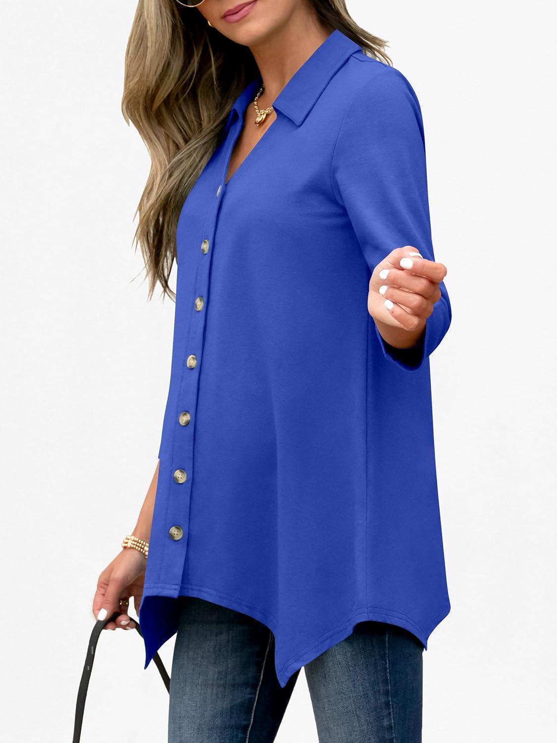 ANRABESS 3/4 Sleeve Tunic Tops for Women Lapel V Neck Button Down Shirts Business Dressy Casual Blouse with Asymmetrical Hem(Royal Blue)
