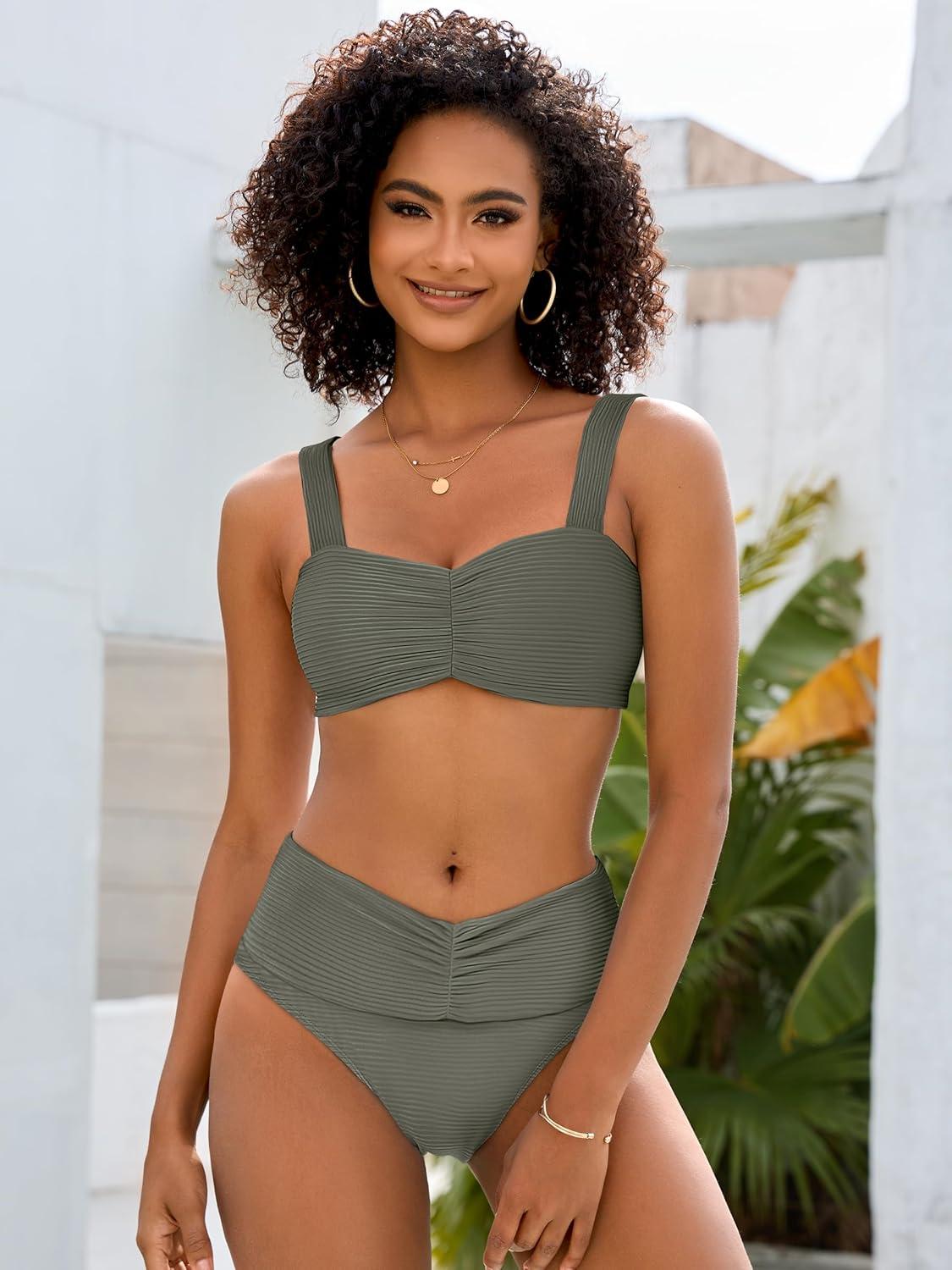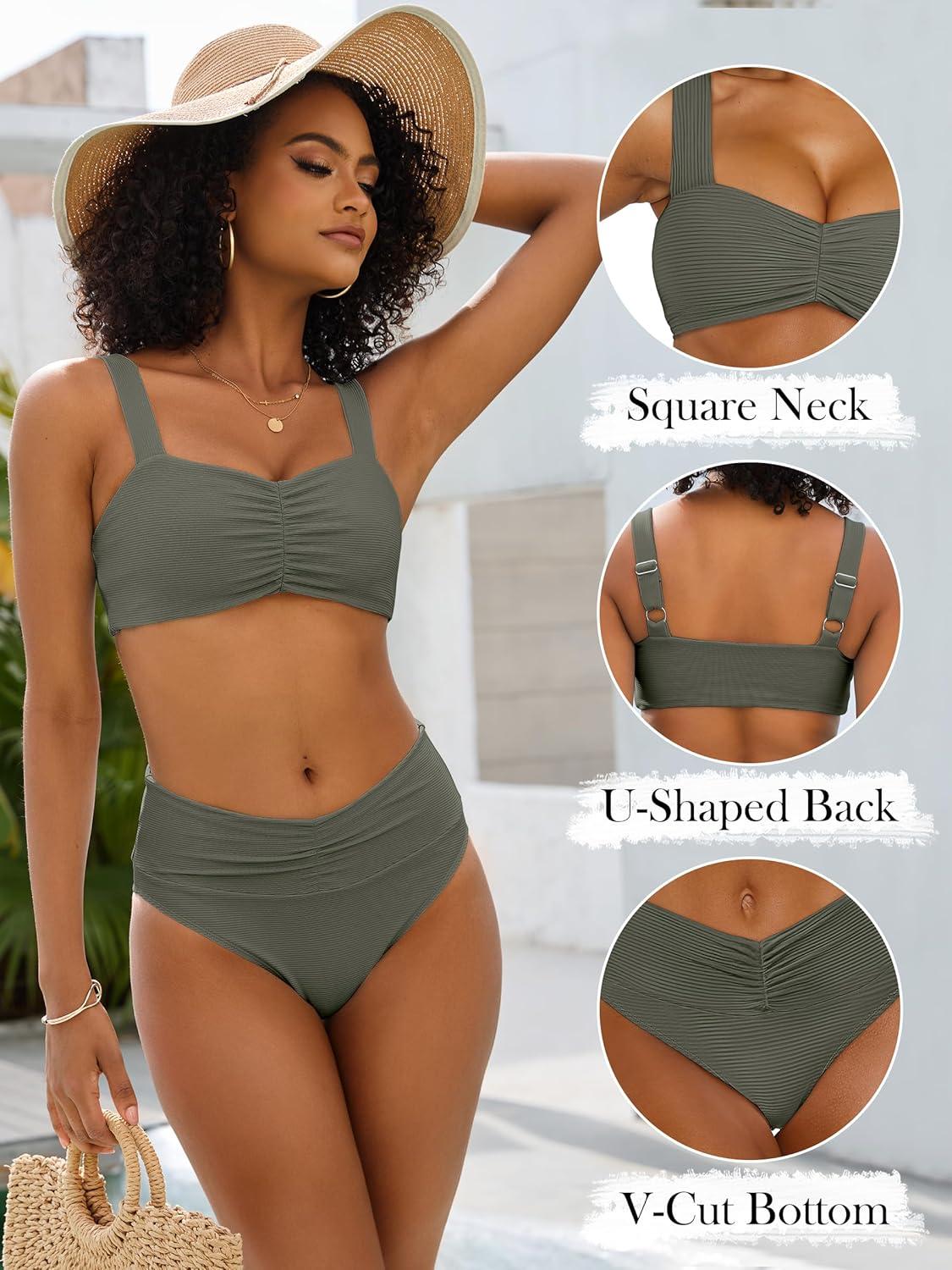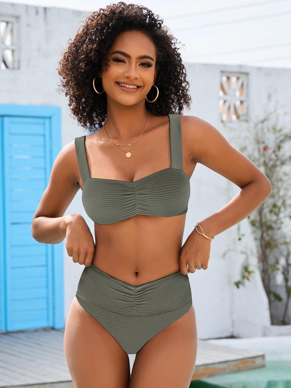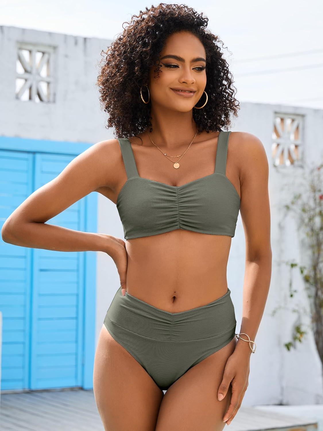 ANRABESS Bathing Suit for Women Tummy Control Bikini Set 2026 Beach Front Ruched Mid Waist Swimsuit with Adjustable Straps(Army Green)