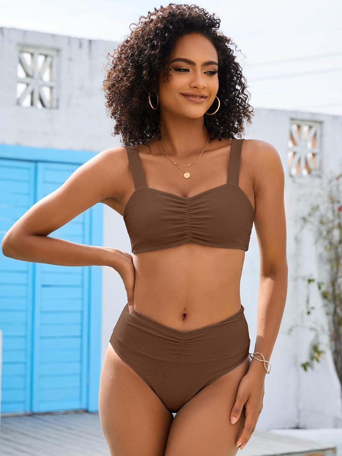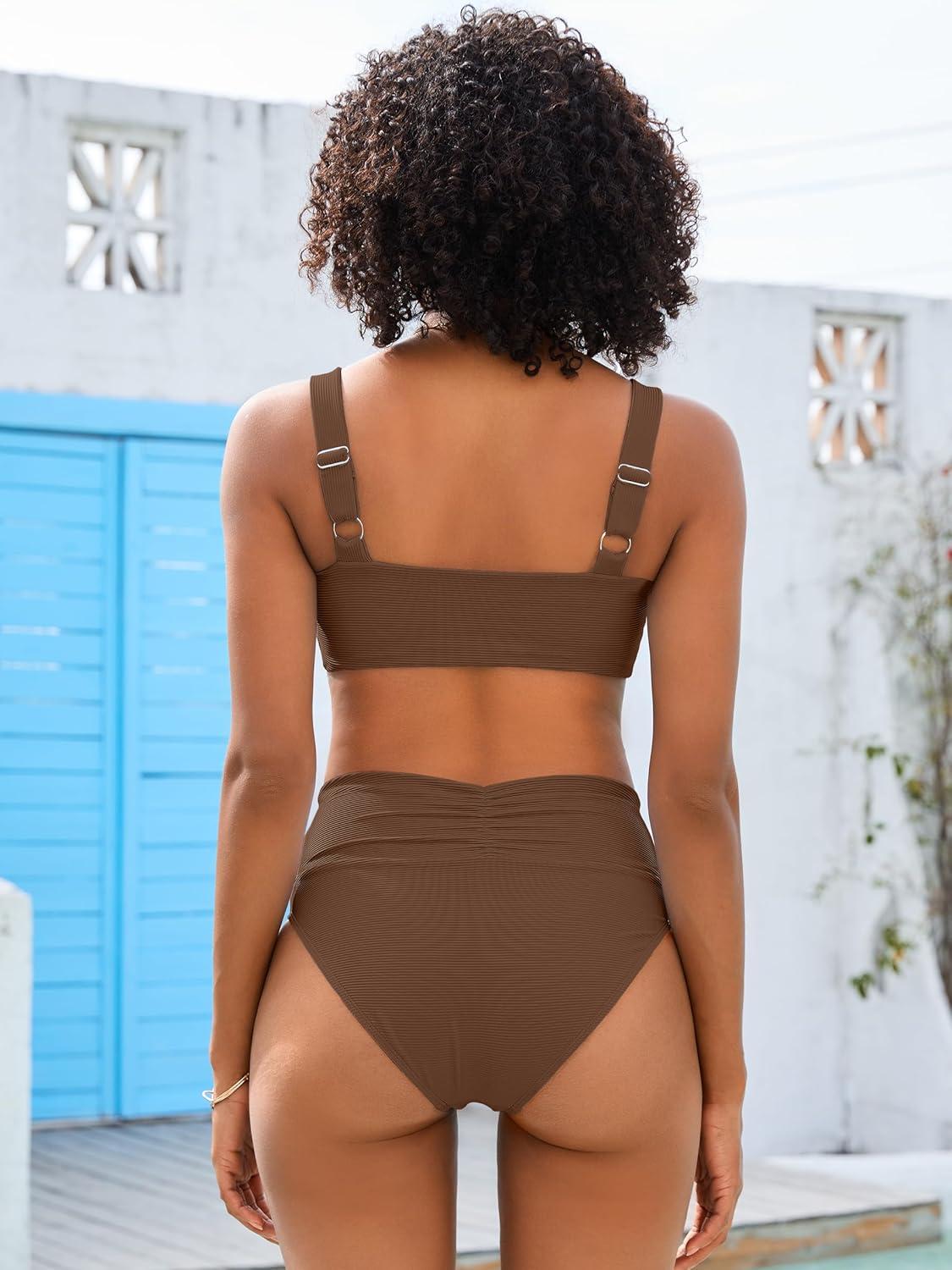 ANRABESS Bathing Suit for Women Tummy Control Bikini Set 2026 Beach Front Ruched Mid Waist Swimsuit with Adjustable Straps(Brown)