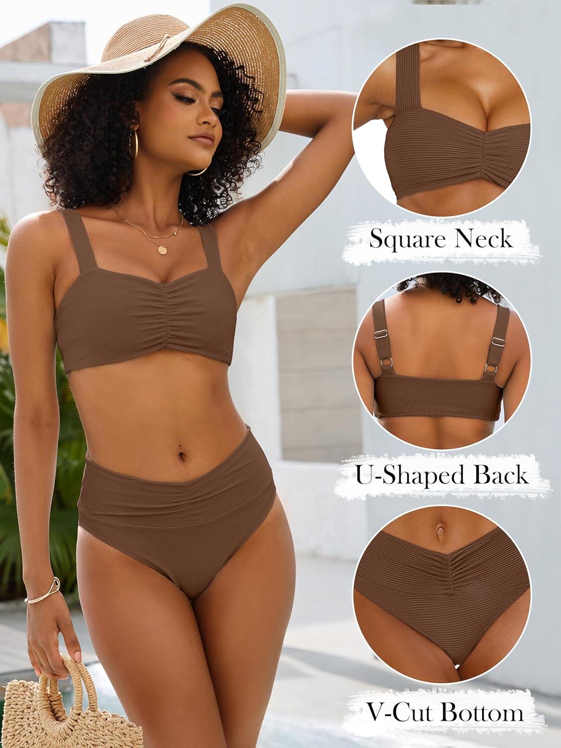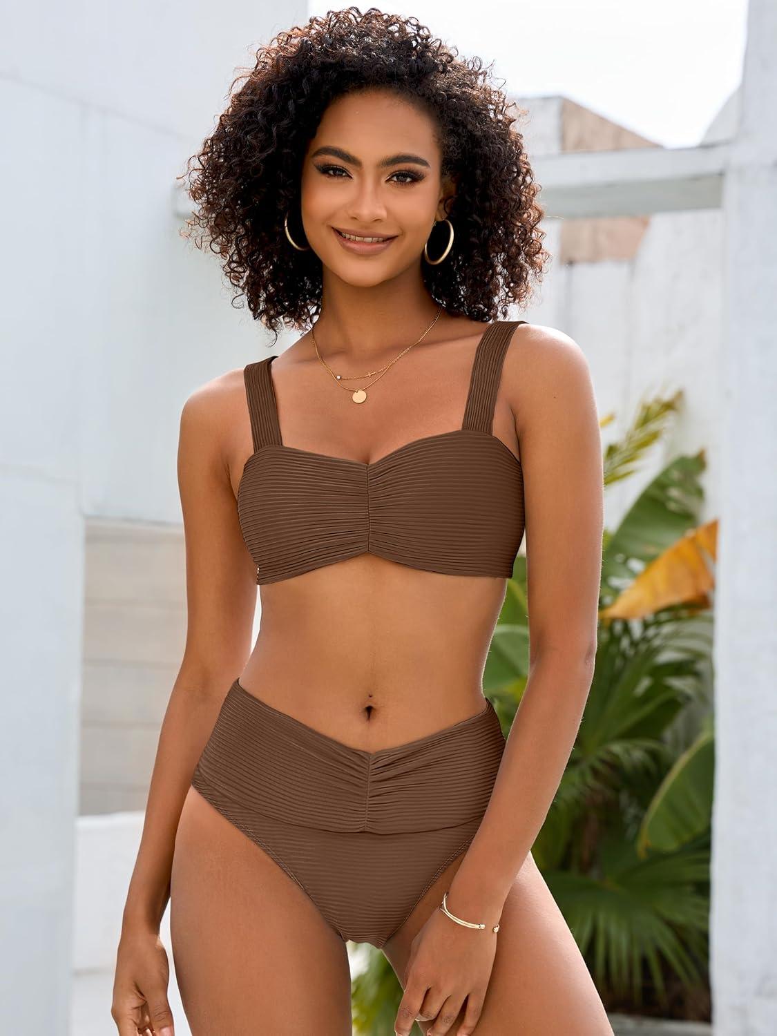 ANRABESS Bathing Suit for Women Tummy Control Bikini Set 2026 Beach Front Ruched Mid Waist Swimsuit with Adjustable Straps(Coffee)