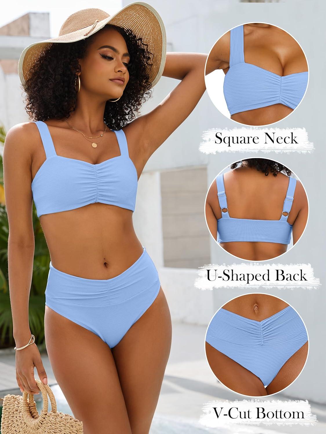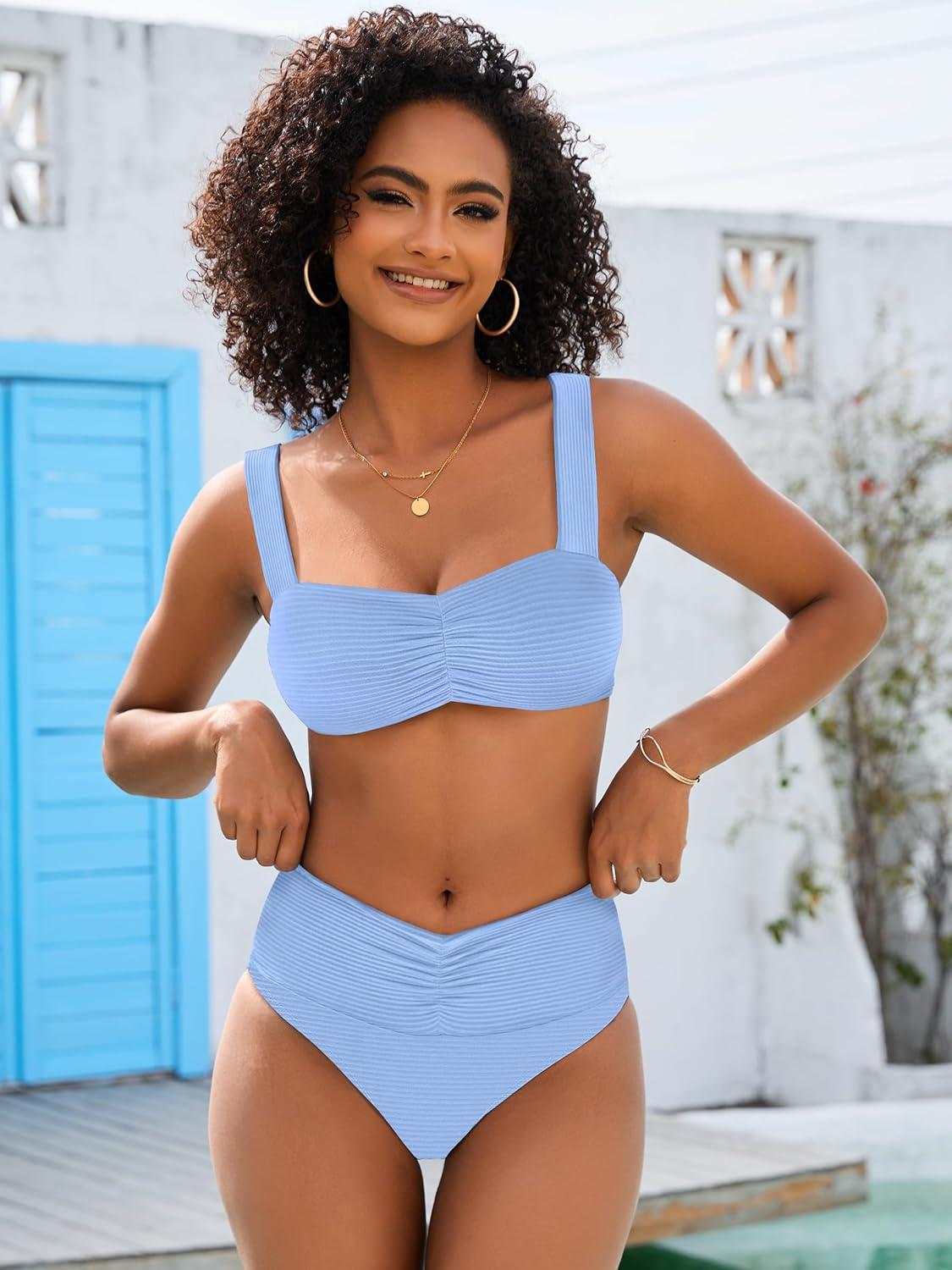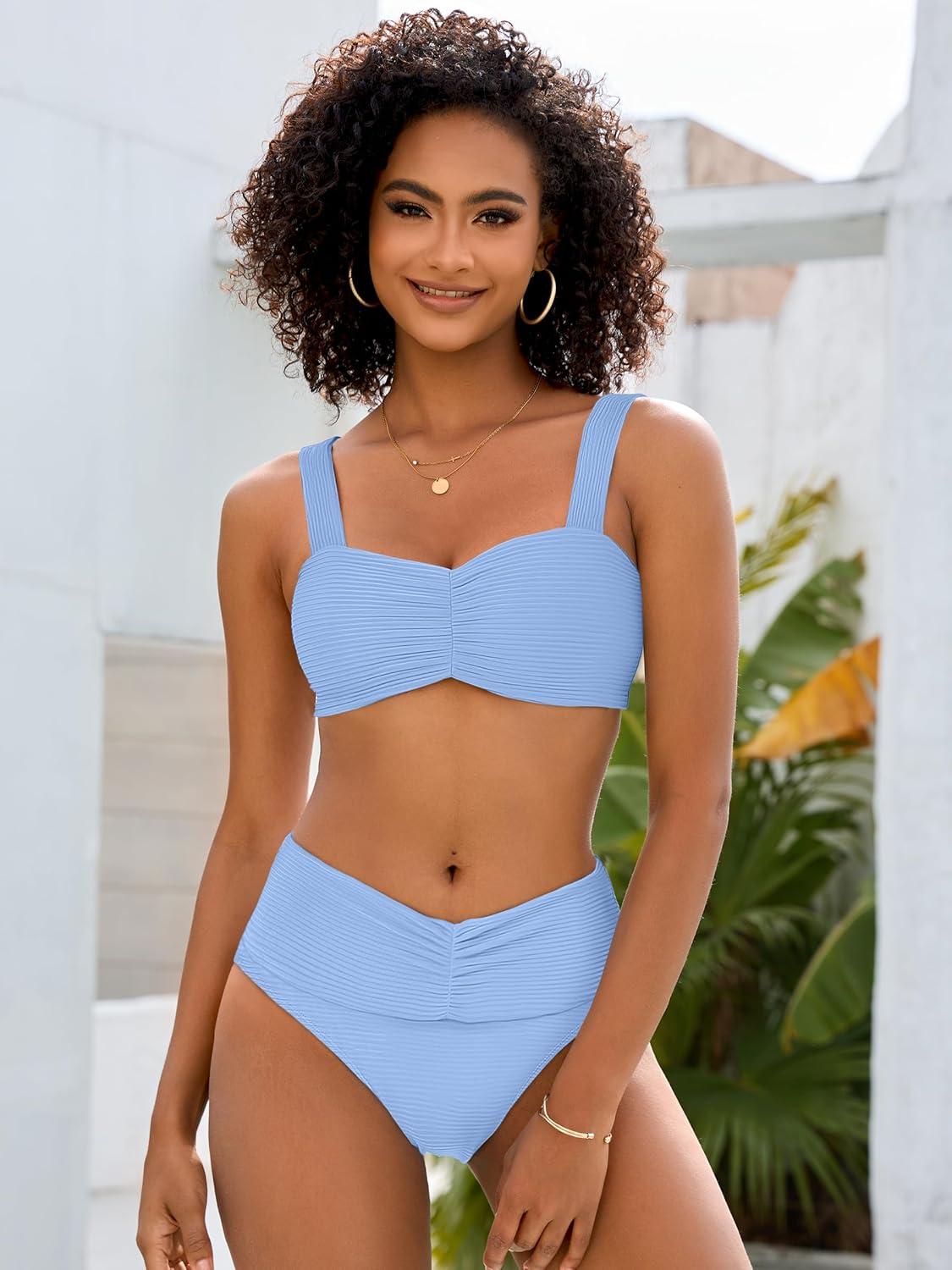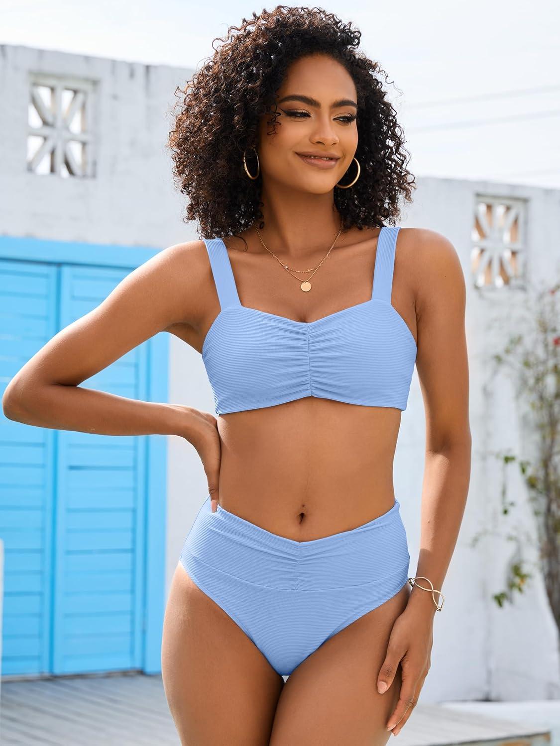 ANRABESS Bathing Suit for Women Tummy Control Bikini Set 2026 Beach Front Ruched Mid Waist Swimsuit with Adjustable Straps(Light Blue)