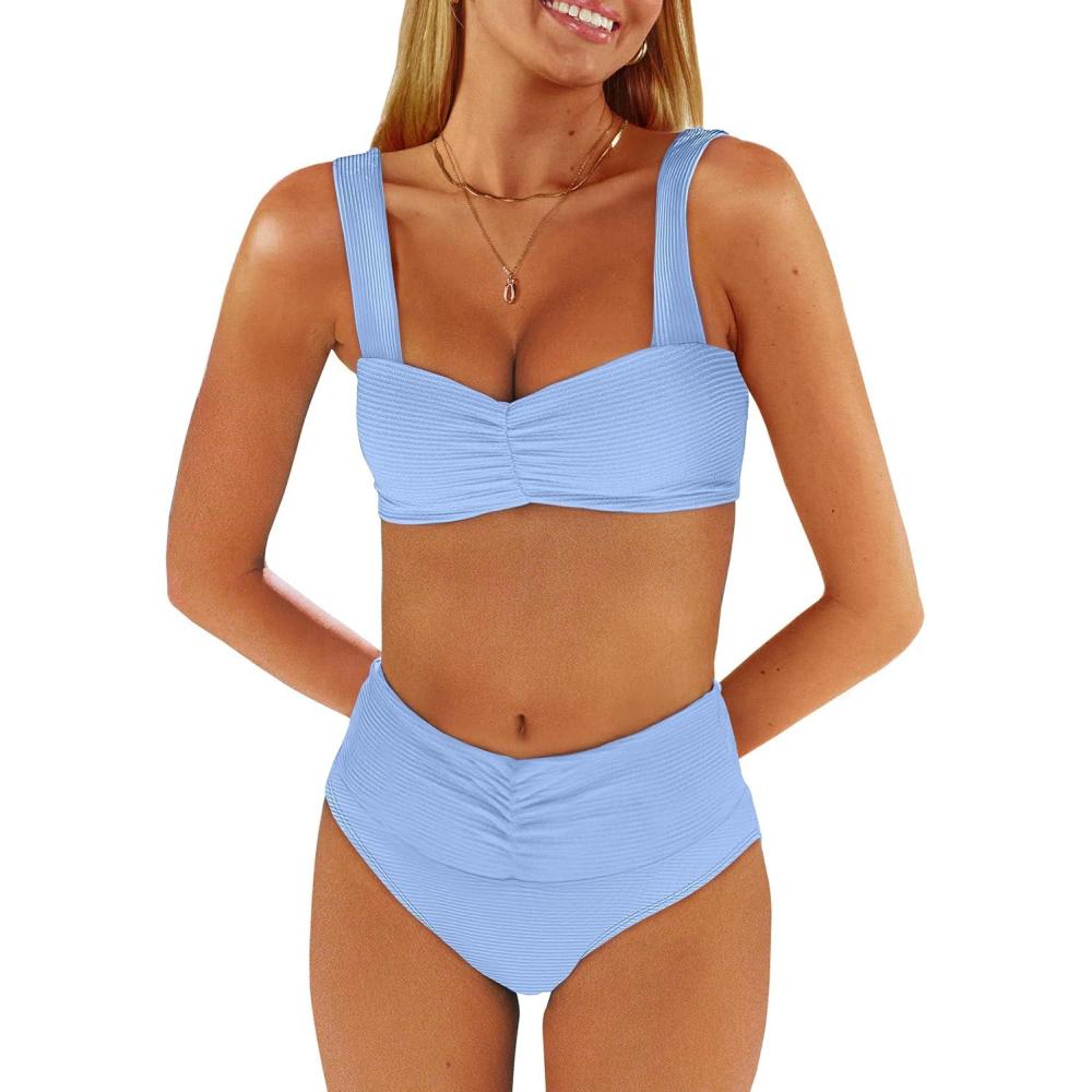 imageANRABESS Bathing Suit for Women Tummy Control Bikini Set 2026 Beach Front Ruched Mid Waist Swimsuit with Adjustable StrapsLight Blue