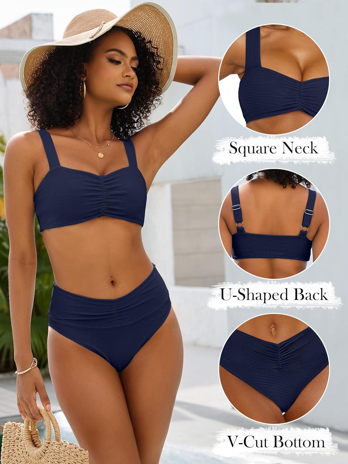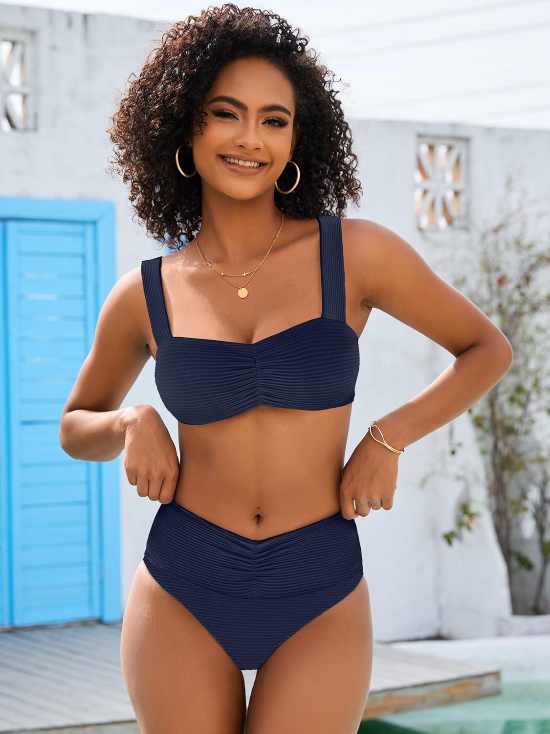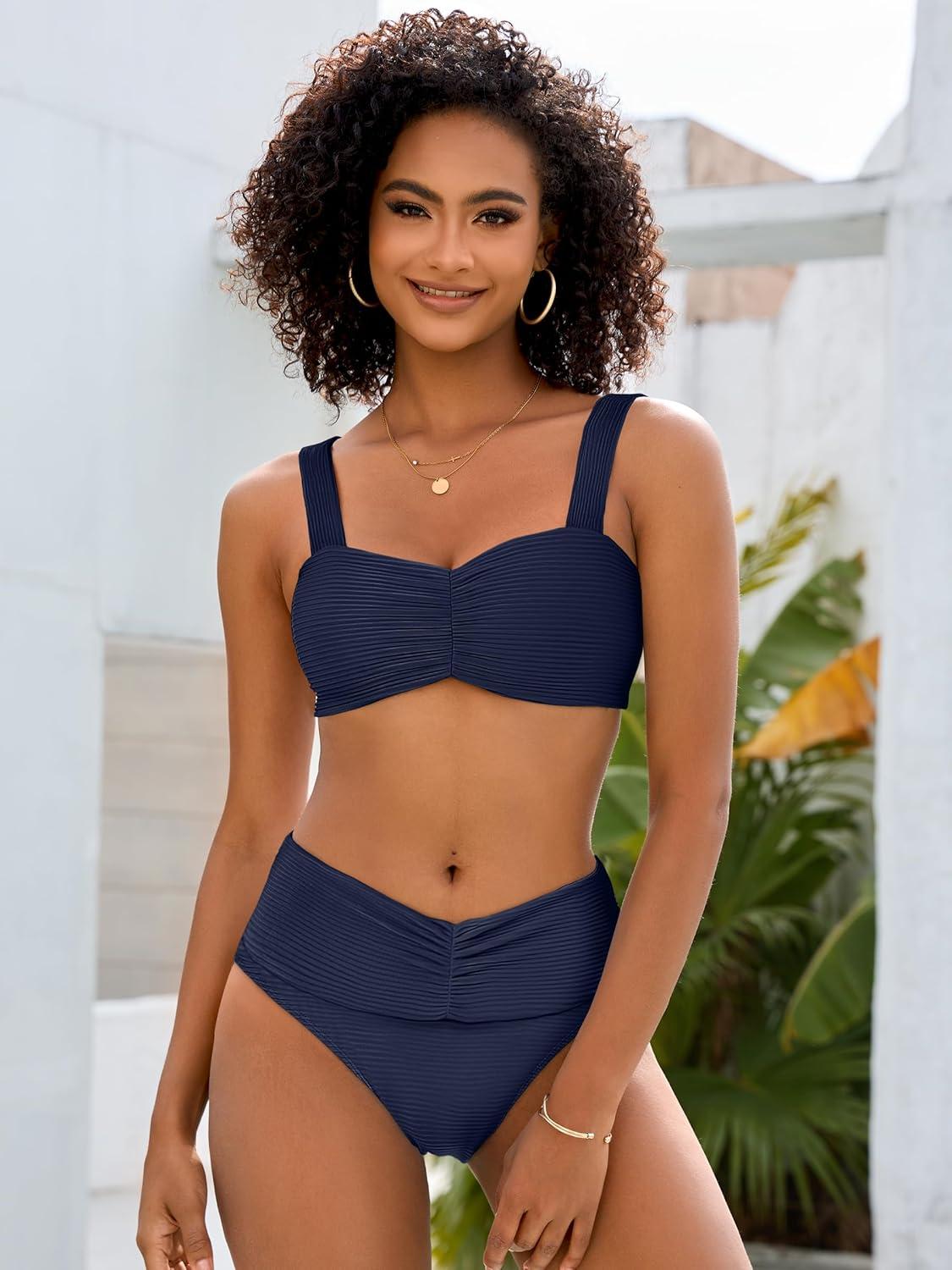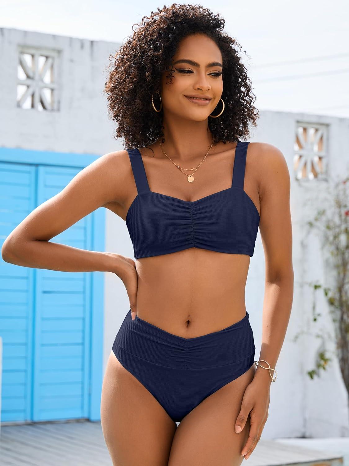 ANRABESS Bathing Suit for Women Tummy Control Bikini Set 2026 Beach Front Ruched Mid Waist Swimsuit with Adjustable Straps(Navy Blue)