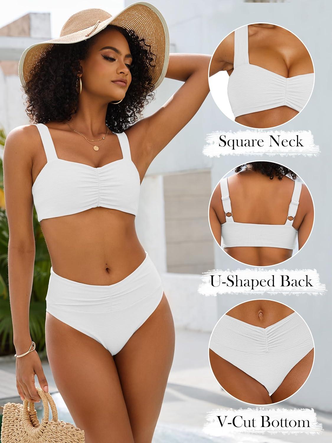 ANRABESS Bathing Suit for Women Tummy Control Bikini Set 2026 Beach Front Ruched Mid Waist Swimsuit with Adjustable Straps(White)
