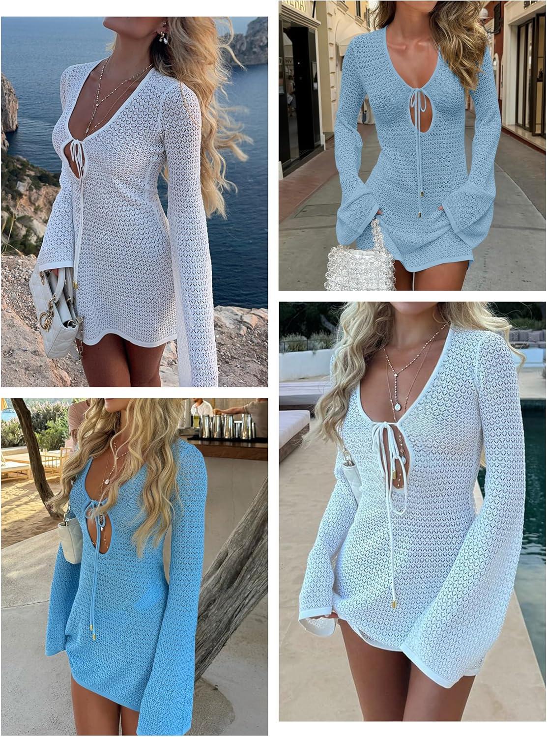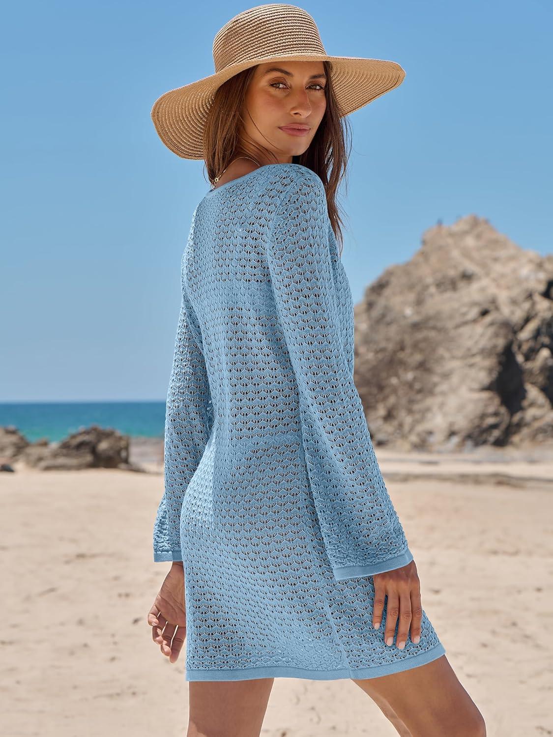 ANRABESS Beach Cover Ups for Women Crochet Swimsuit Bathing Suit Swimwear Bikini Mesh Knit Dress 2025 Summer Vacation Outfits(Sky)