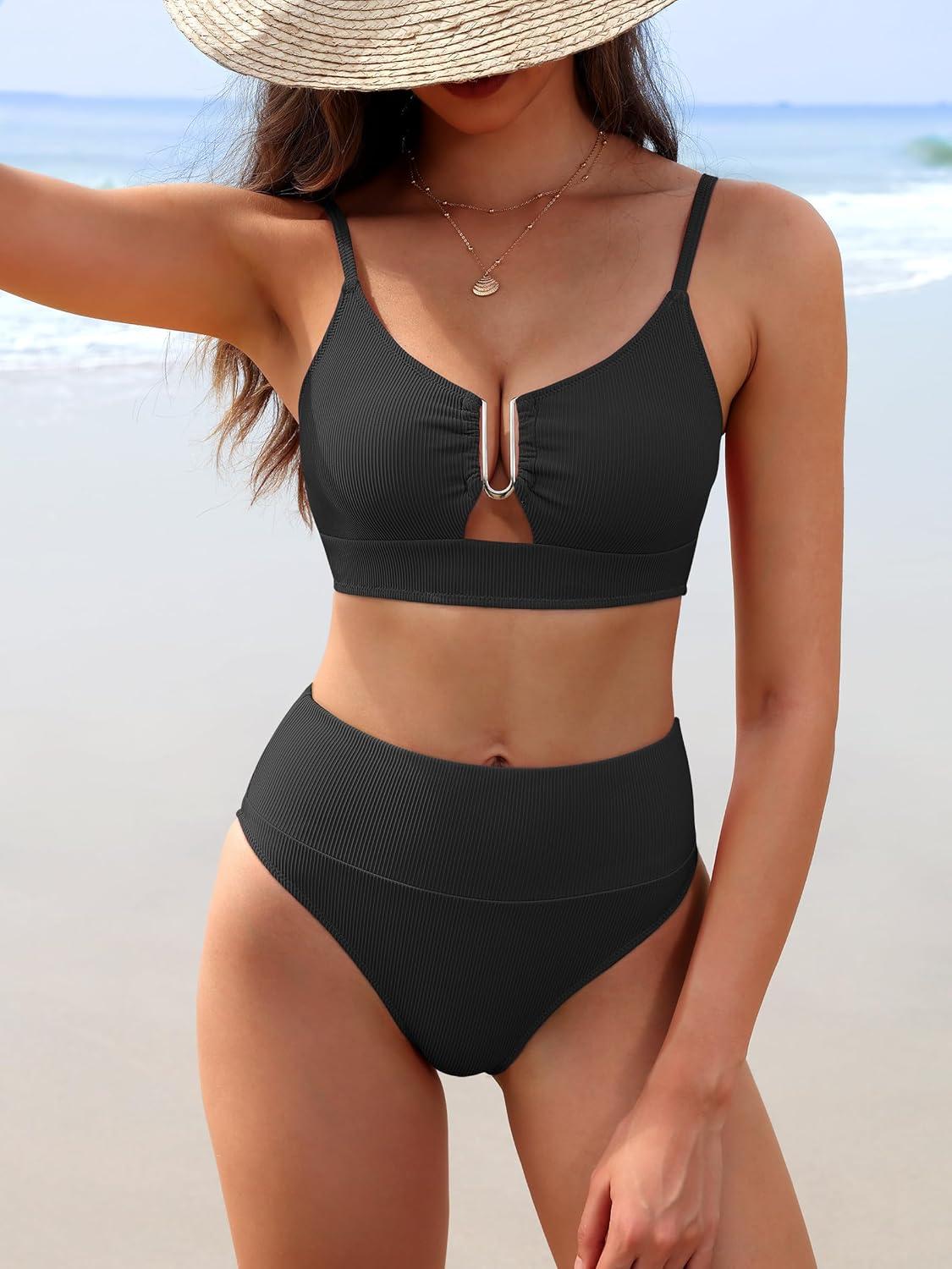 ANRABESS Bikini Sets for Women Summer High Waisted 2 Piece Bathing Suit Ribbed U-Wire Cutout Swimsuit Beach Vacation 2026(Black)