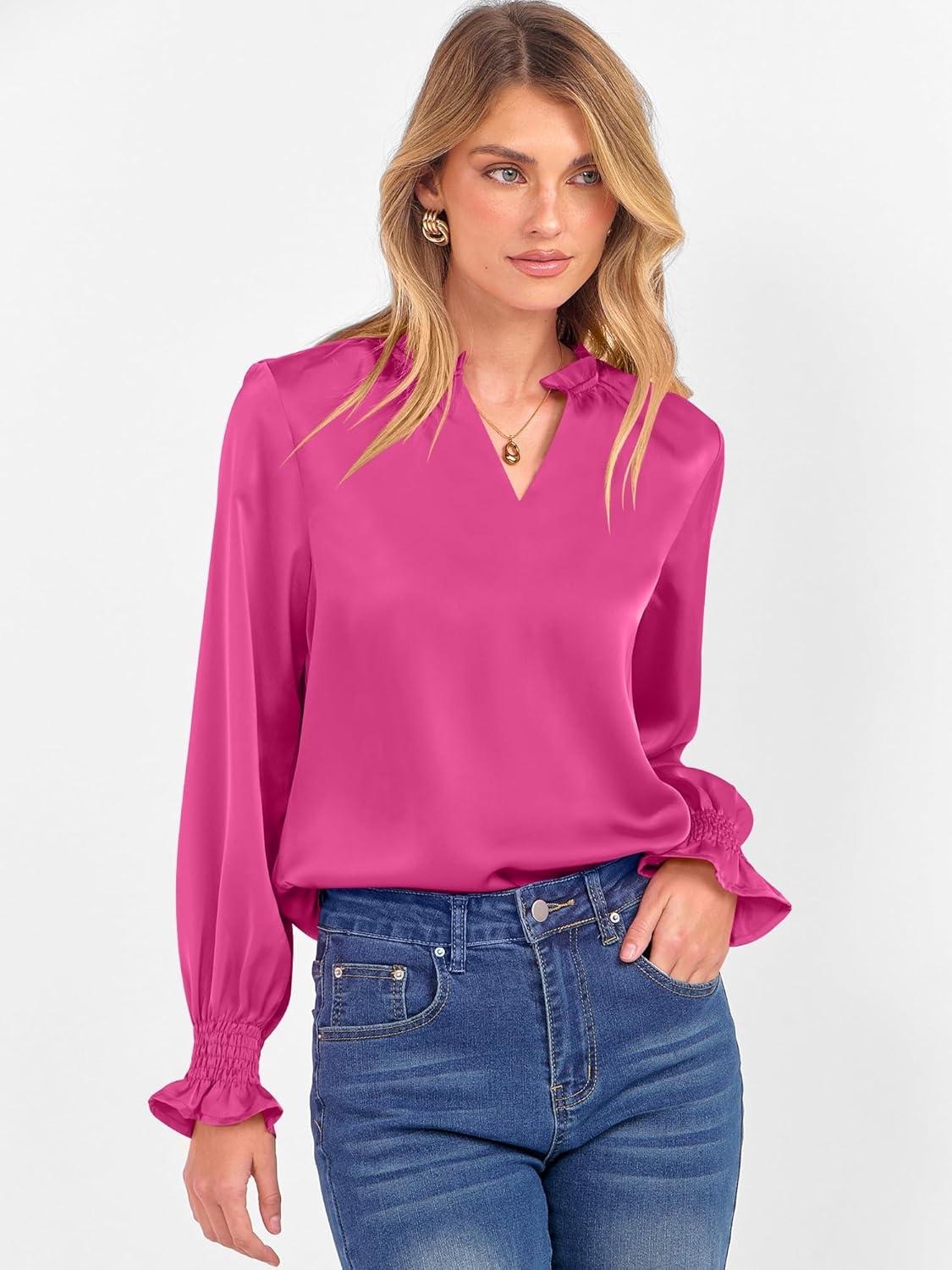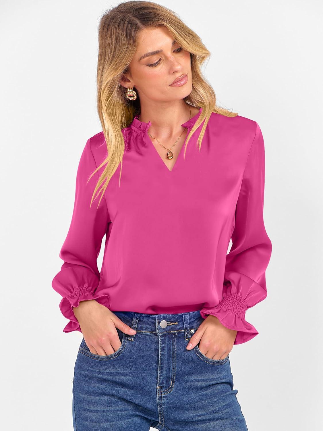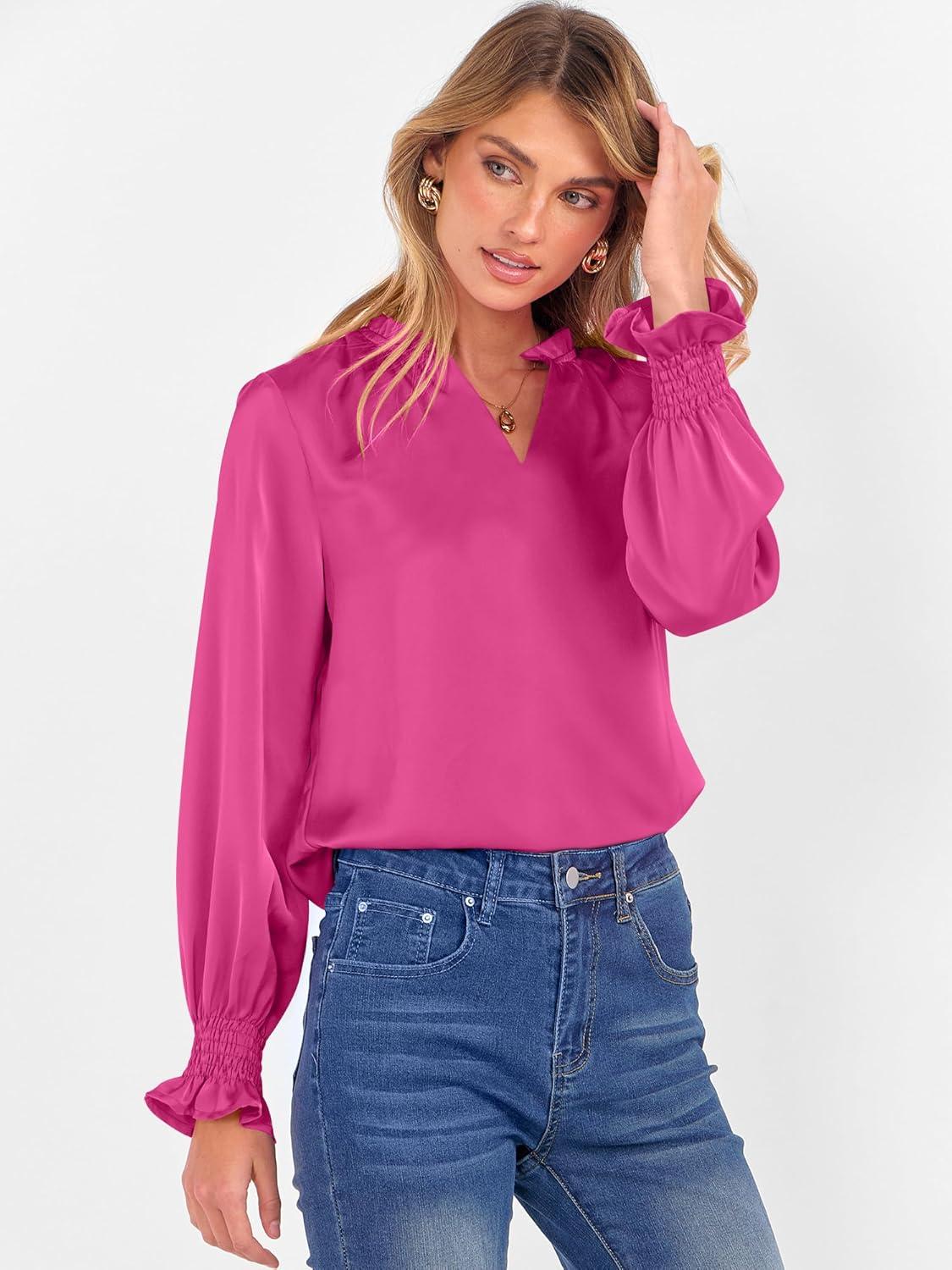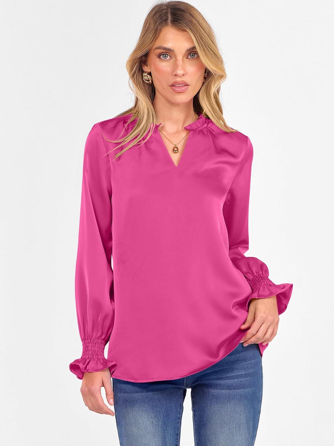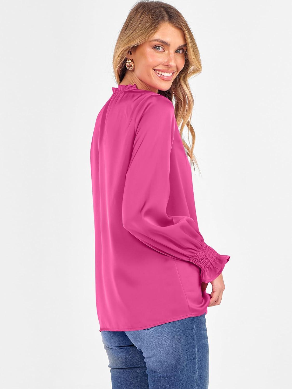 ANRABESS Blouse for Women Dressy Casual Puff Long Sleeve Shirts V Neck Satin Business Casual Work Tops 2025 Fall Outfits(Hot Pink)