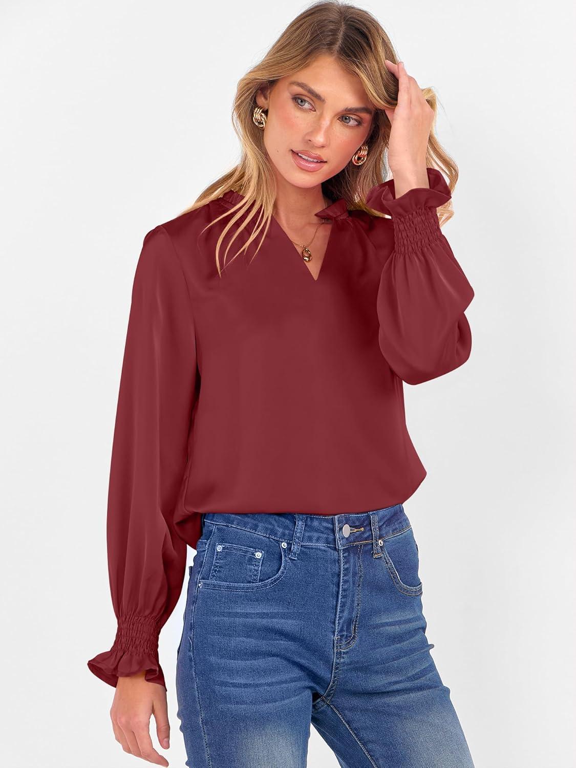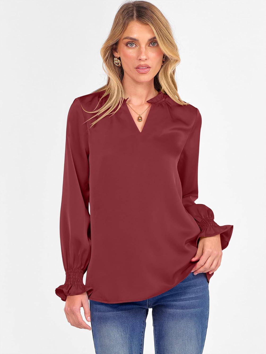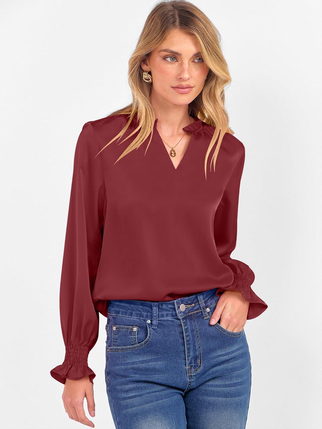 ANRABESS Blouse for Women Dressy Casual Puff Long Sleeve Shirts V Neck Satin Business Casual Work Tops 2025 Fall Outfits(Wine Red)