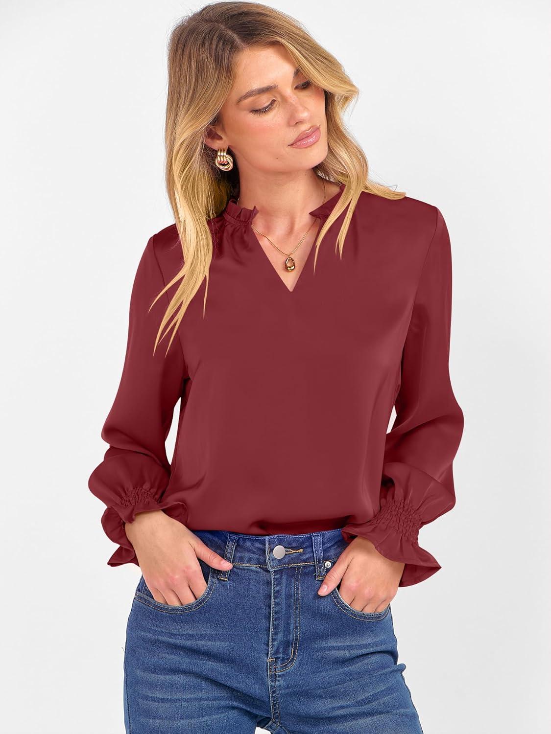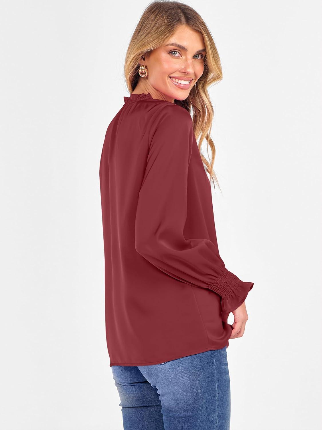 imageANRABESS Blouse for Women Dressy Casual Puff Long Sleeve Shirts V Neck Satin Business Casual Work Tops 2025 Fall OutfitsWine Red