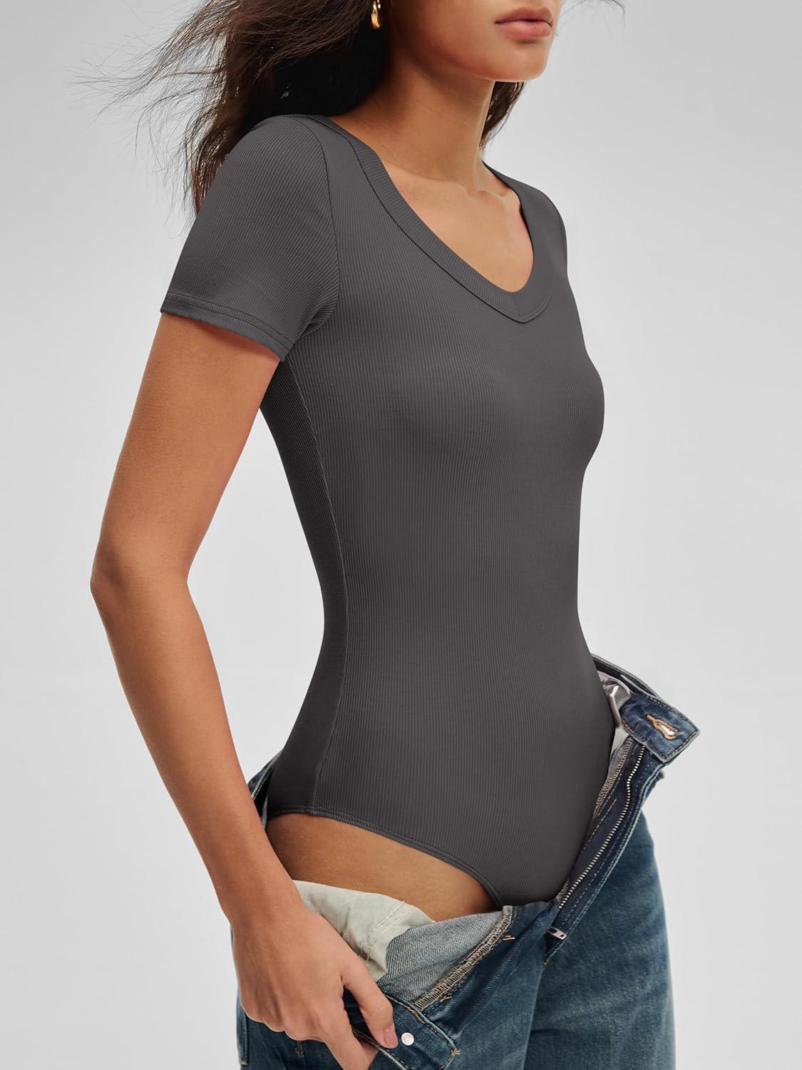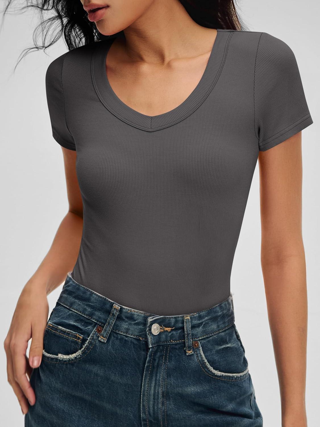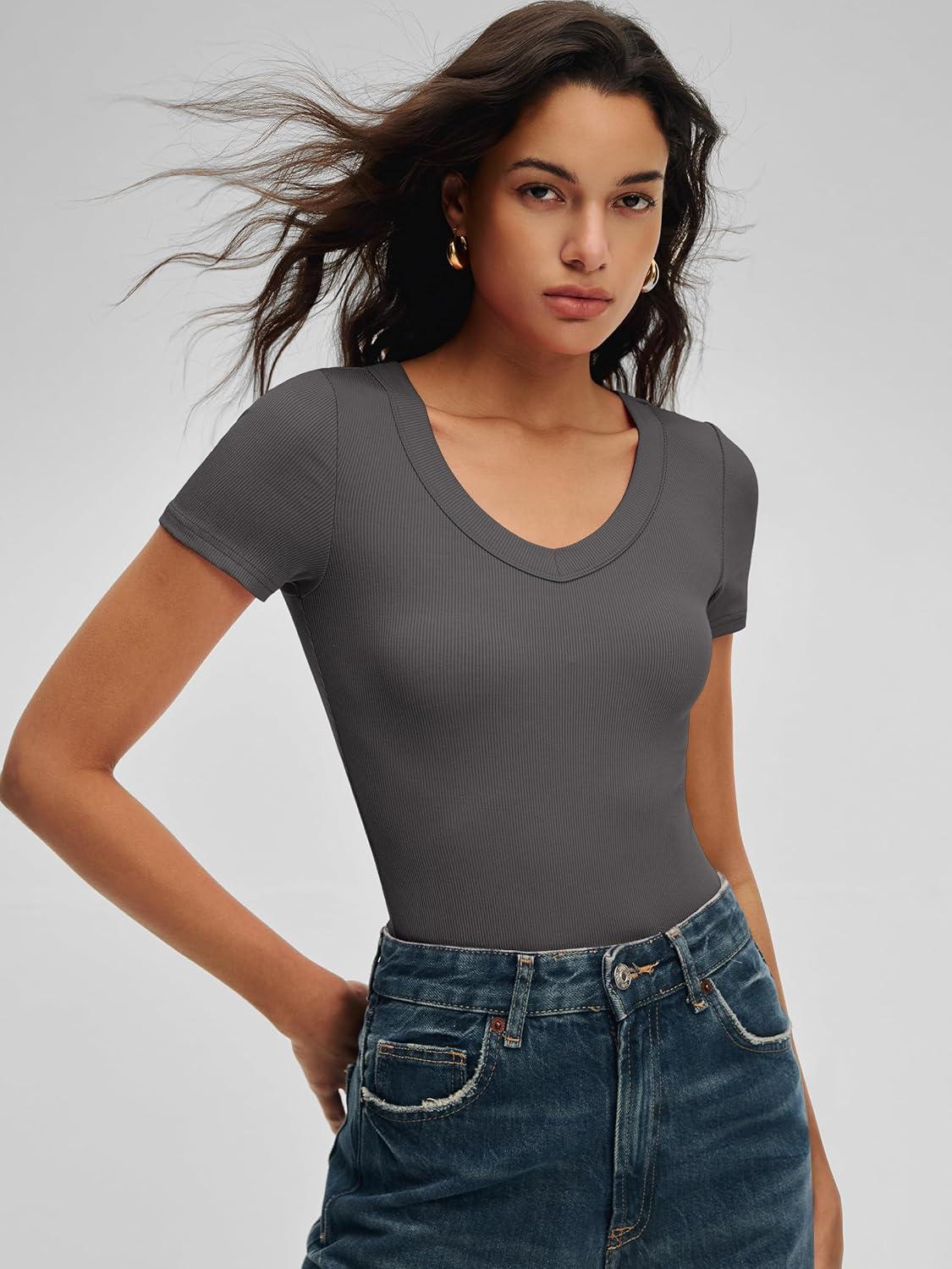ANRABESS Bodysuits for Women V Neck Short Sleeve Body Suit Tops Slim Fit Ribbed Knit Soft Basic T-Shirts 2026 Summer Outfits(Charcoal)
