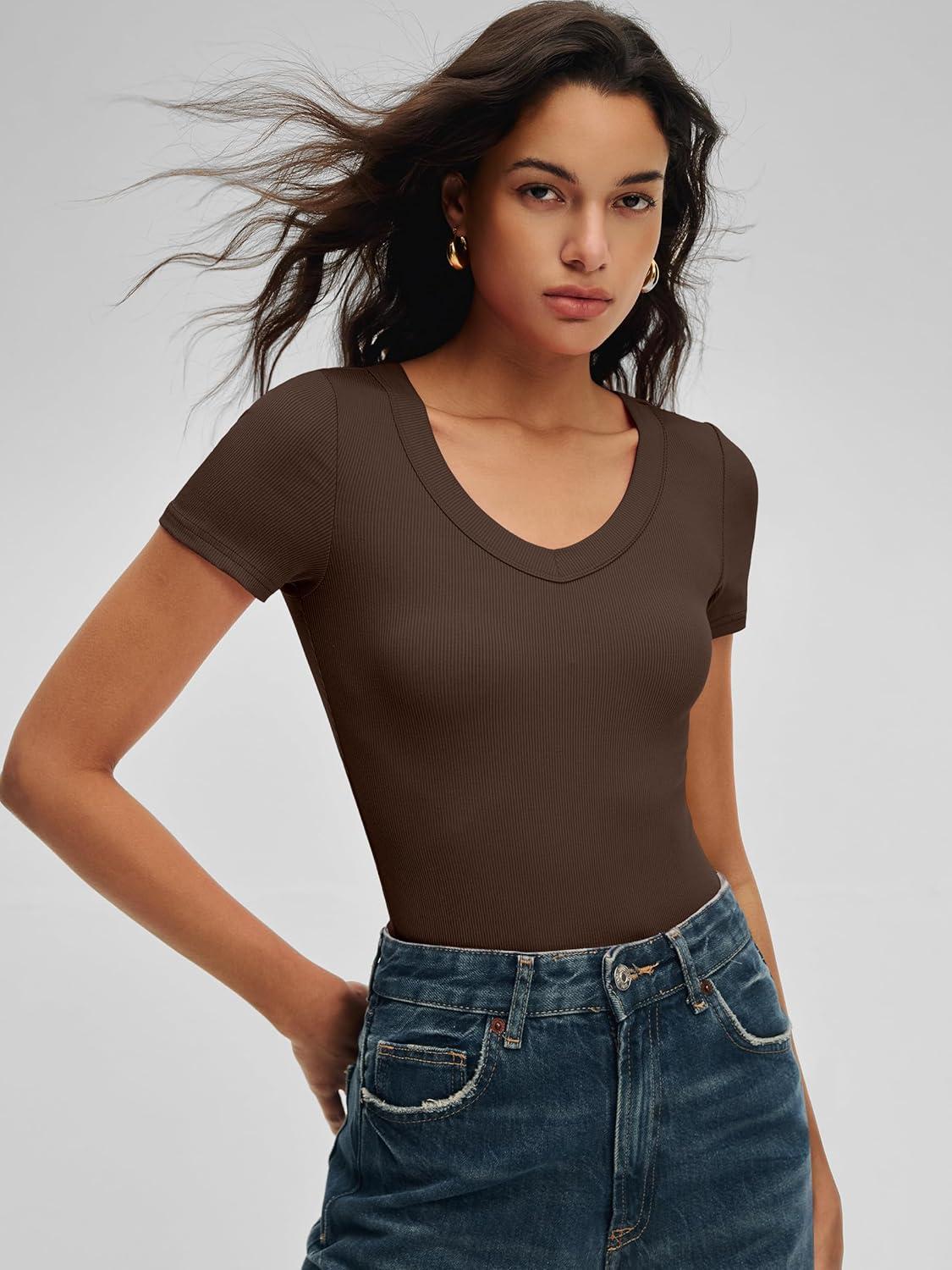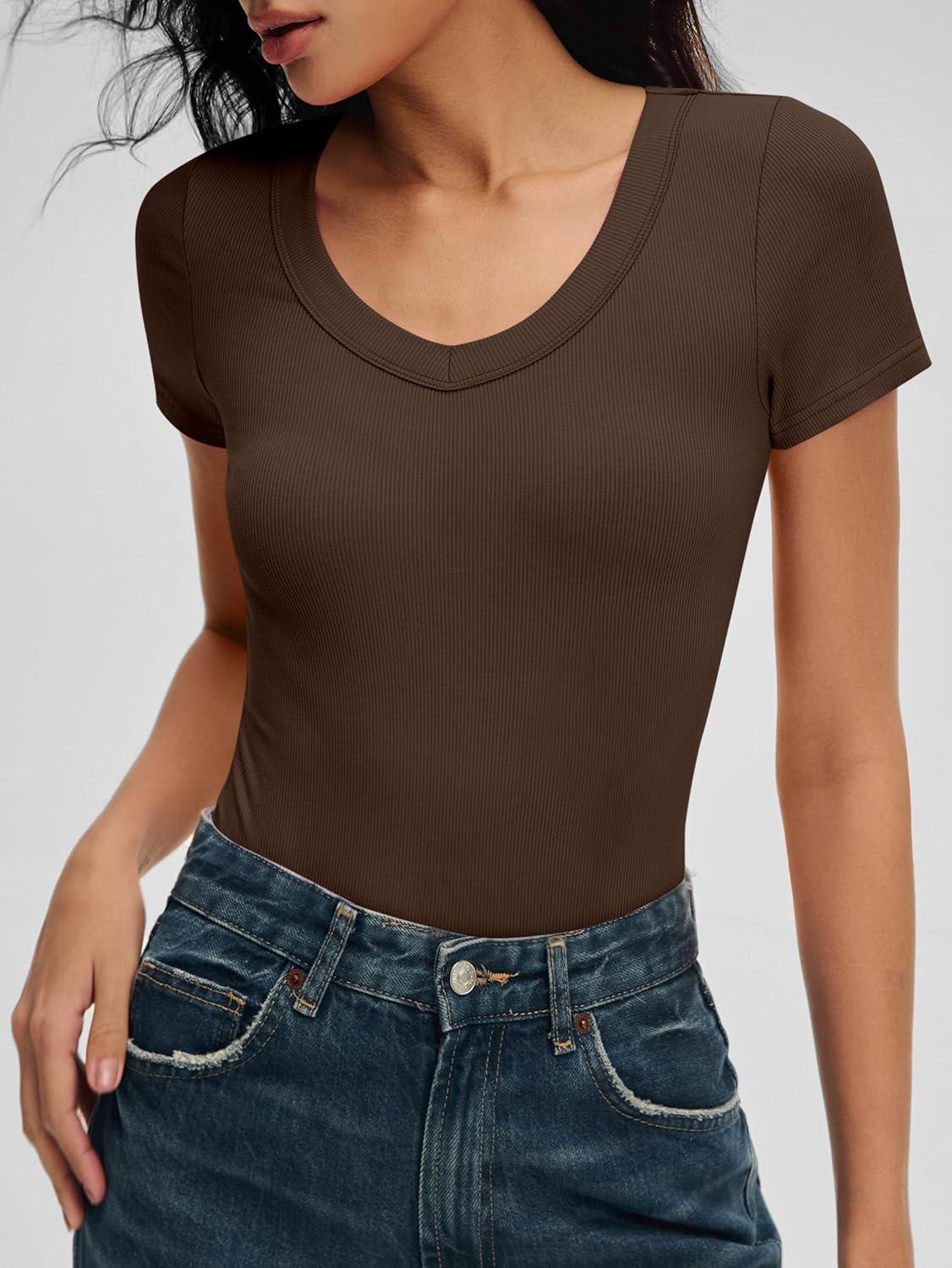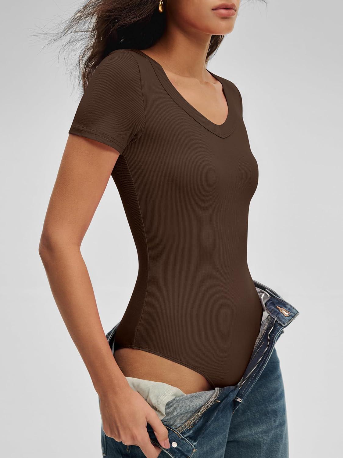 ANRABESS Bodysuits for Women V Neck Short Sleeve Body Suit Tops Slim Fit Ribbed Knit Soft Basic T-Shirts 2026 Summer Outfits(Coffee)