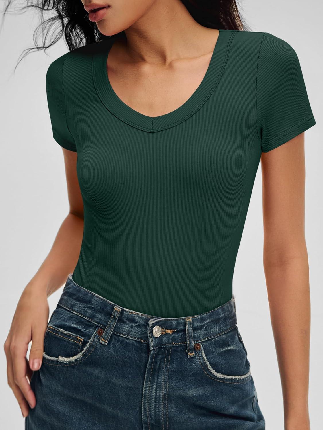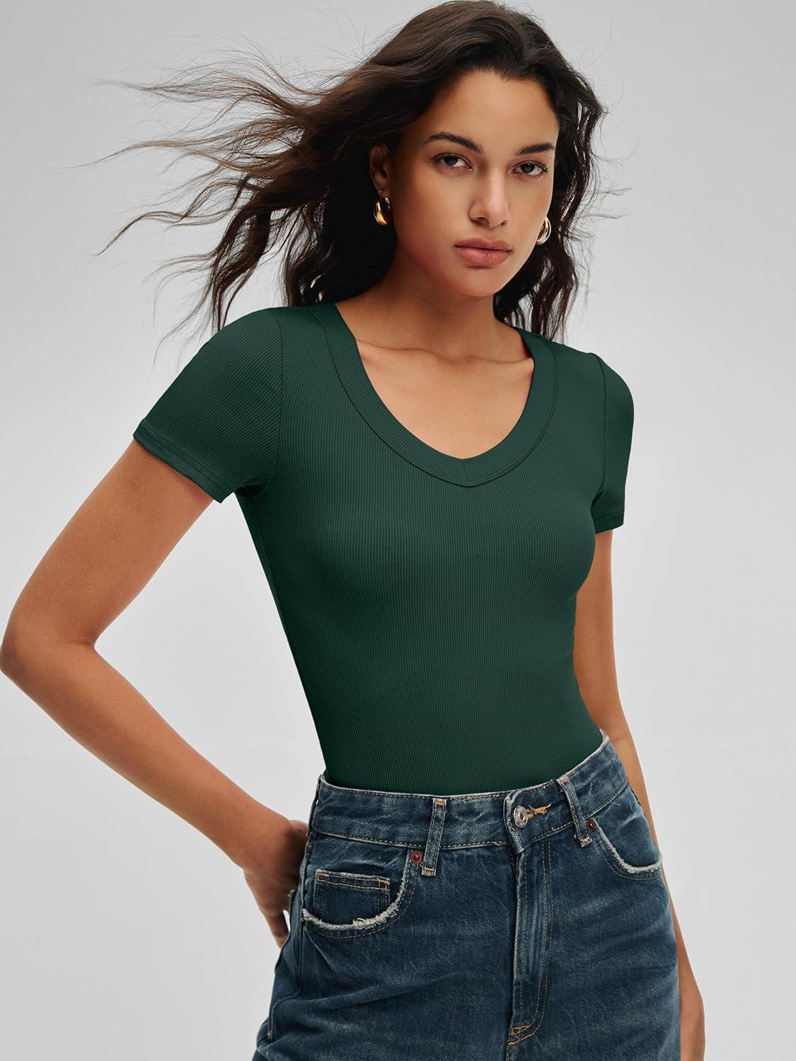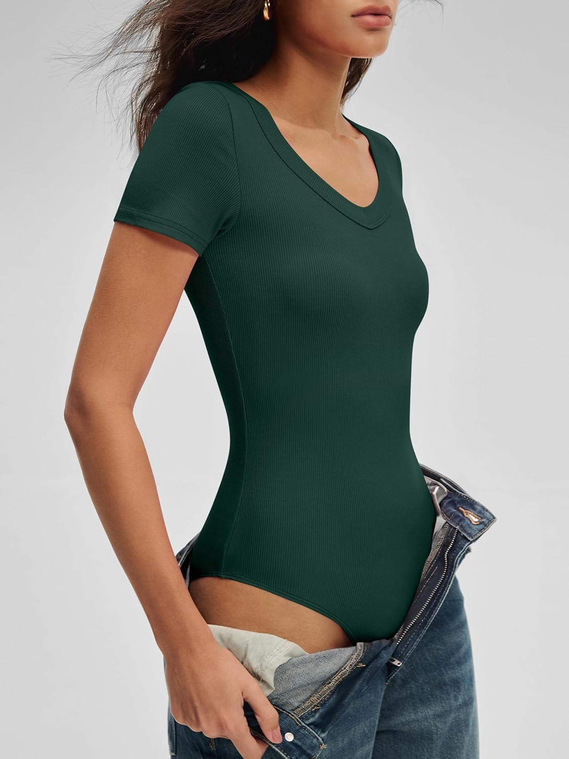 ANRABESS Bodysuits for Women V Neck Short Sleeve Body Suit Tops Slim Fit Ribbed Knit Soft Basic T-Shirts 2026 Summer Outfits(Deep Green)