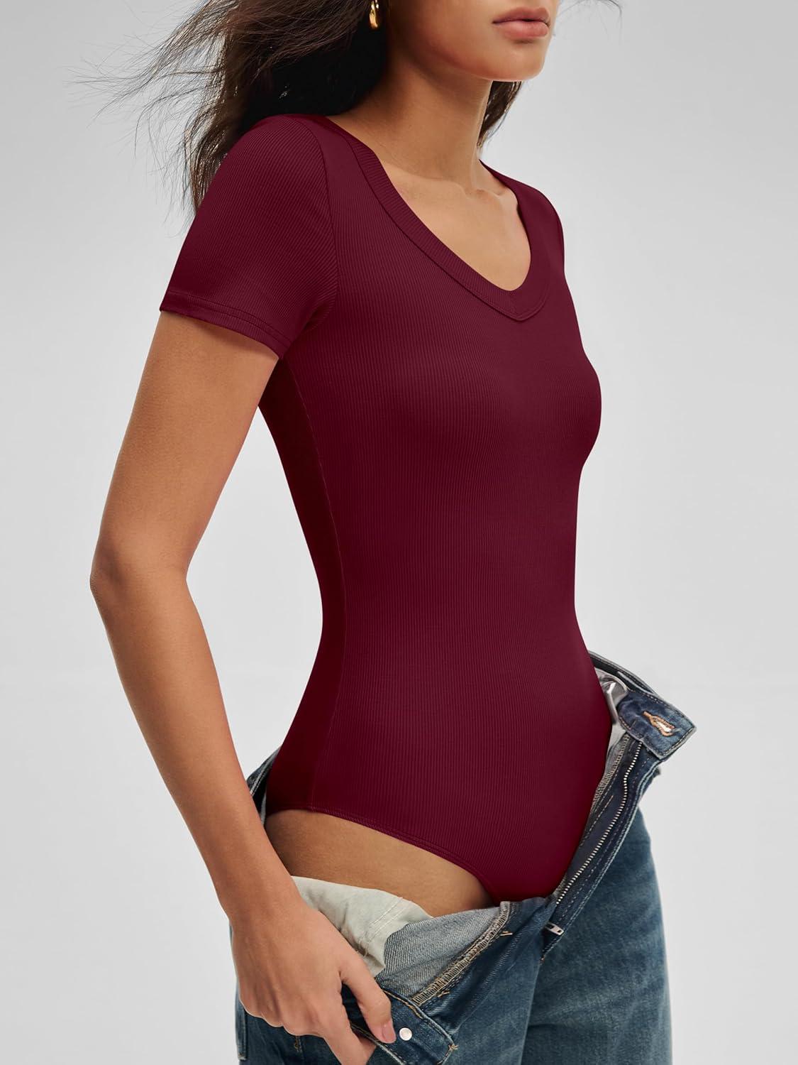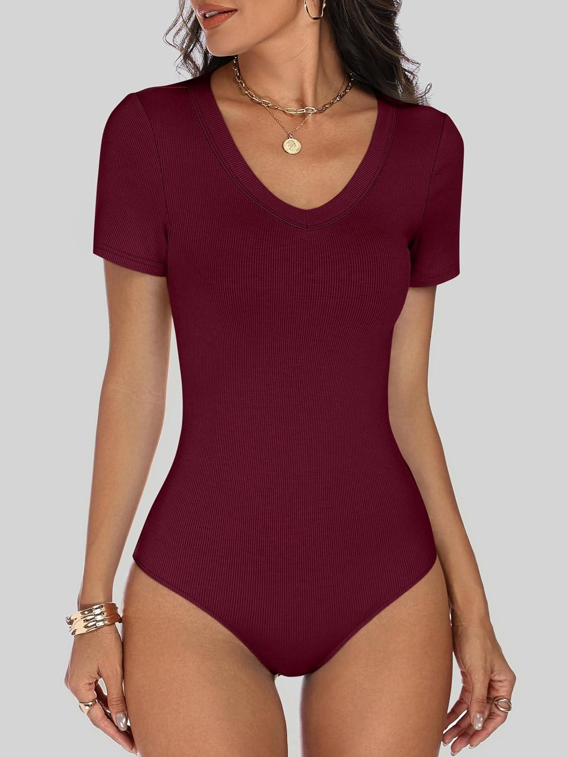 imageANRABESS Bodysuits for Women V Neck Short Sleeve Body Suit Tops Slim Fit Ribbed Knit Soft Basic TShirts 2026 Summer OutfitsDeep Red