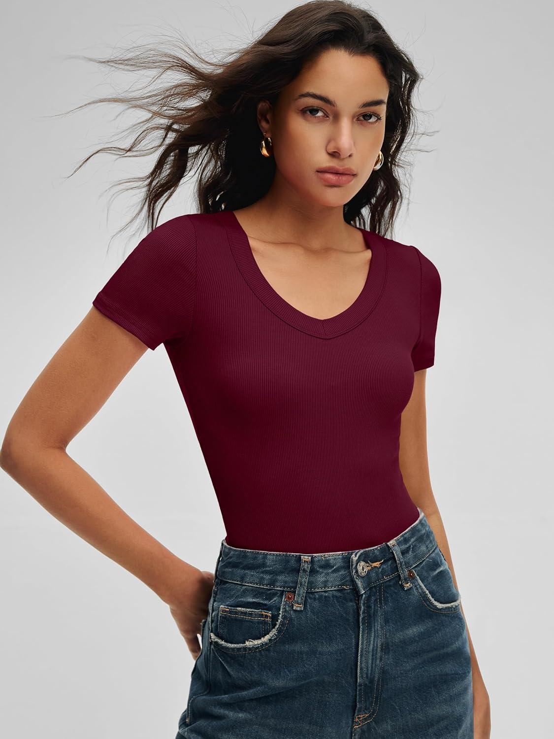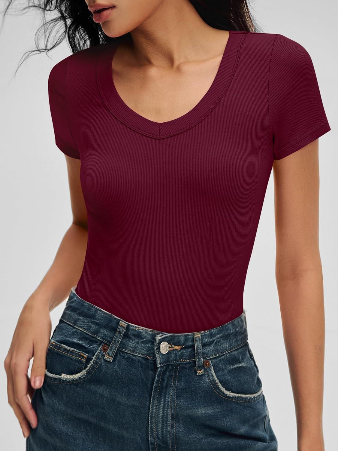 ANRABESS Bodysuits for Women V Neck Short Sleeve Body Suit Tops Slim Fit Ribbed Knit Soft Basic T-Shirts 2026 Summer Outfits(Deep Red)