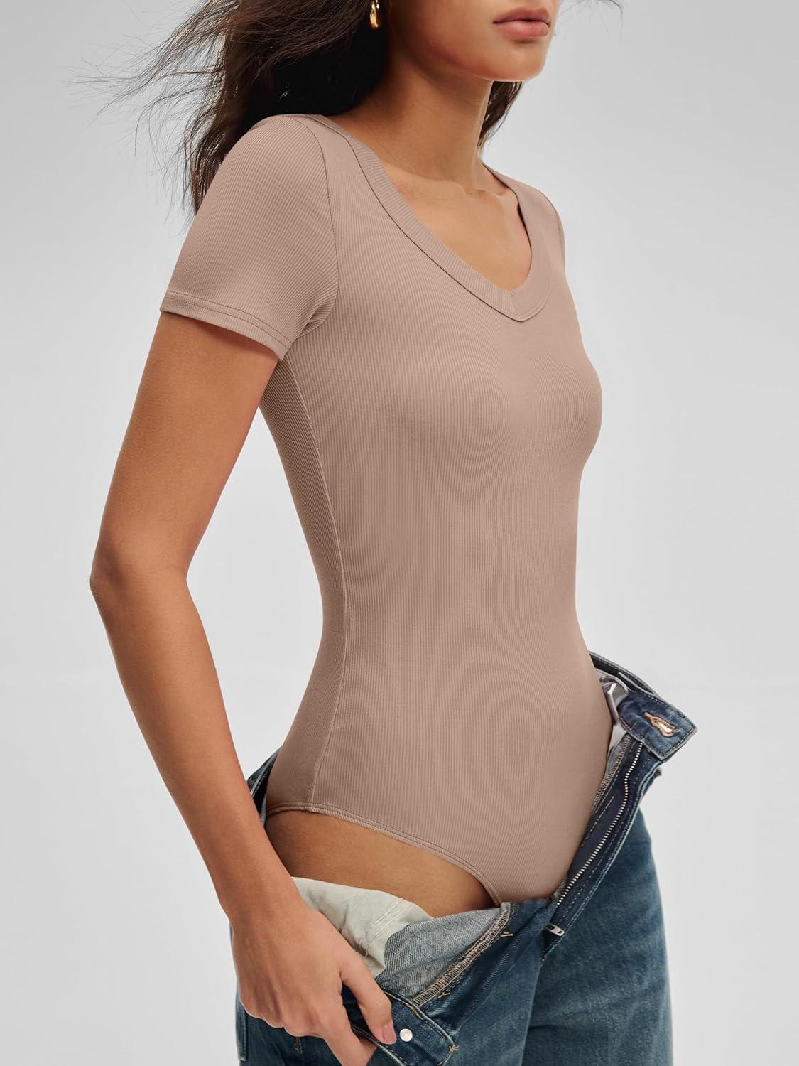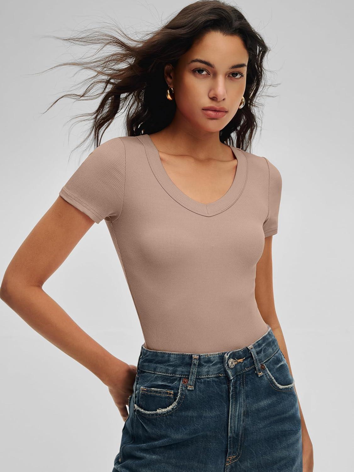 ANRABESS Bodysuits for Women V Neck Short Sleeve Body Suit Tops Slim Fit Ribbed Knit Soft Basic T-Shirts 2026 Summer Outfits(Light Khaki)