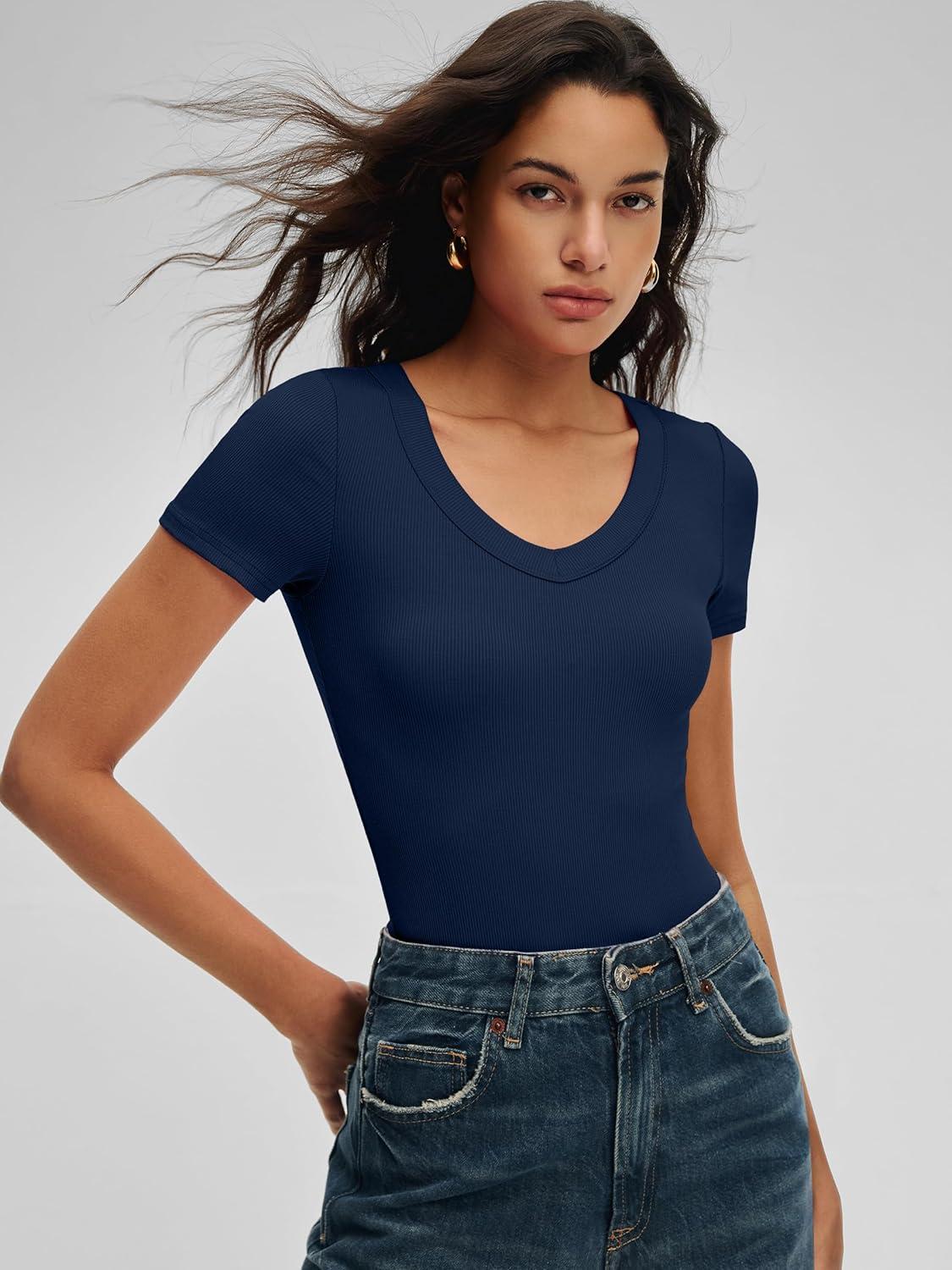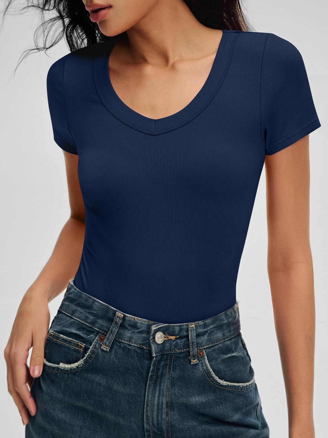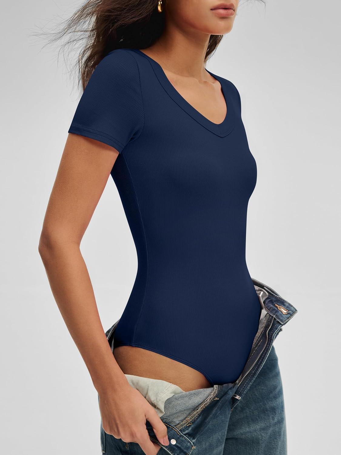ANRABESS Bodysuits for Women V Neck Short Sleeve Body Suit Tops Slim Fit Ribbed Knit Soft Basic T-Shirts 2026 Summer Outfits(Navy Blue)