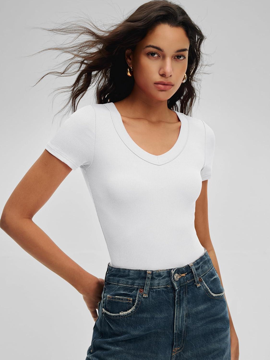 ANRABESS Bodysuits for Women V Neck Short Sleeve Body Suit Tops Slim Fit Ribbed Knit Soft Basic T-Shirts 2026 Summer Outfits(White)