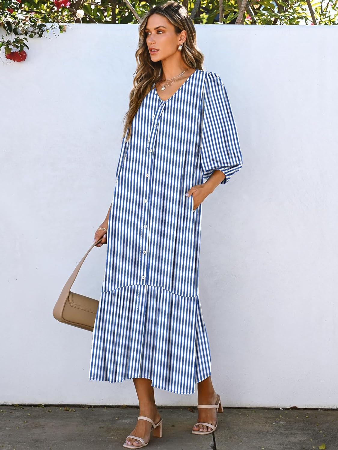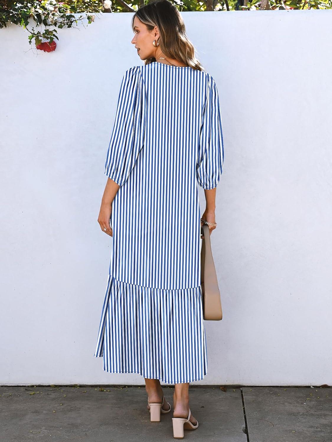ANRABESS Boho Maxi Dresses for Women Summer Puff Sleeve V Neck Flowy Long Casual Dress with Pockets 2025 Vacation Outfits(Striped Blue)