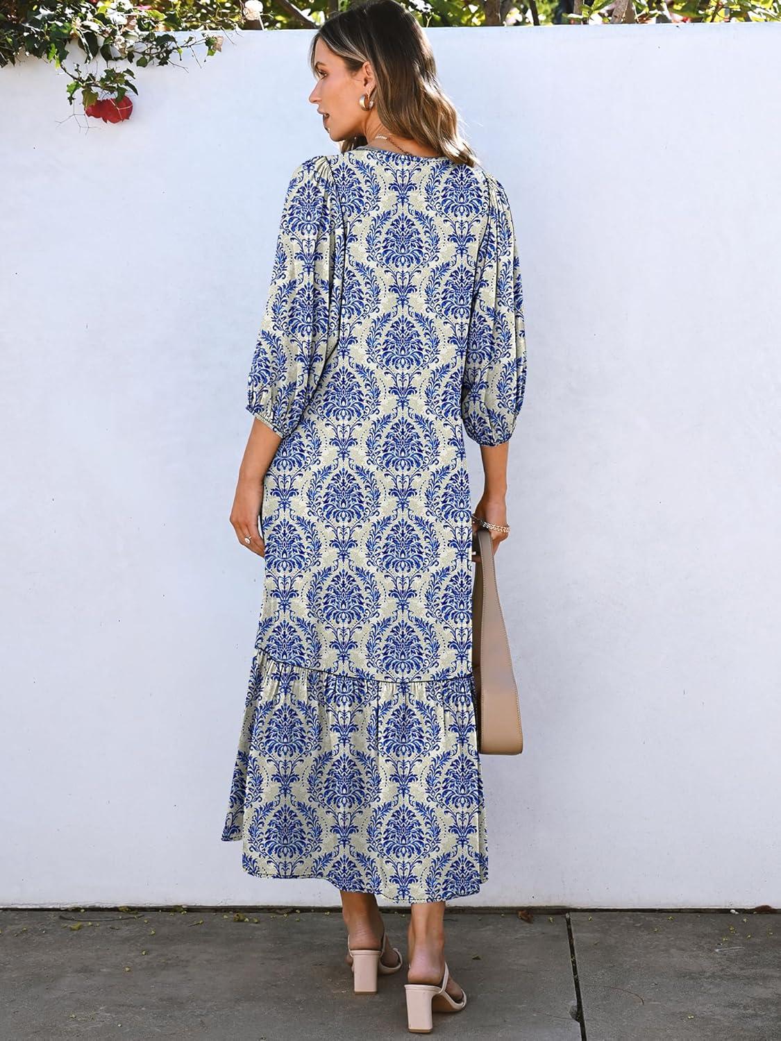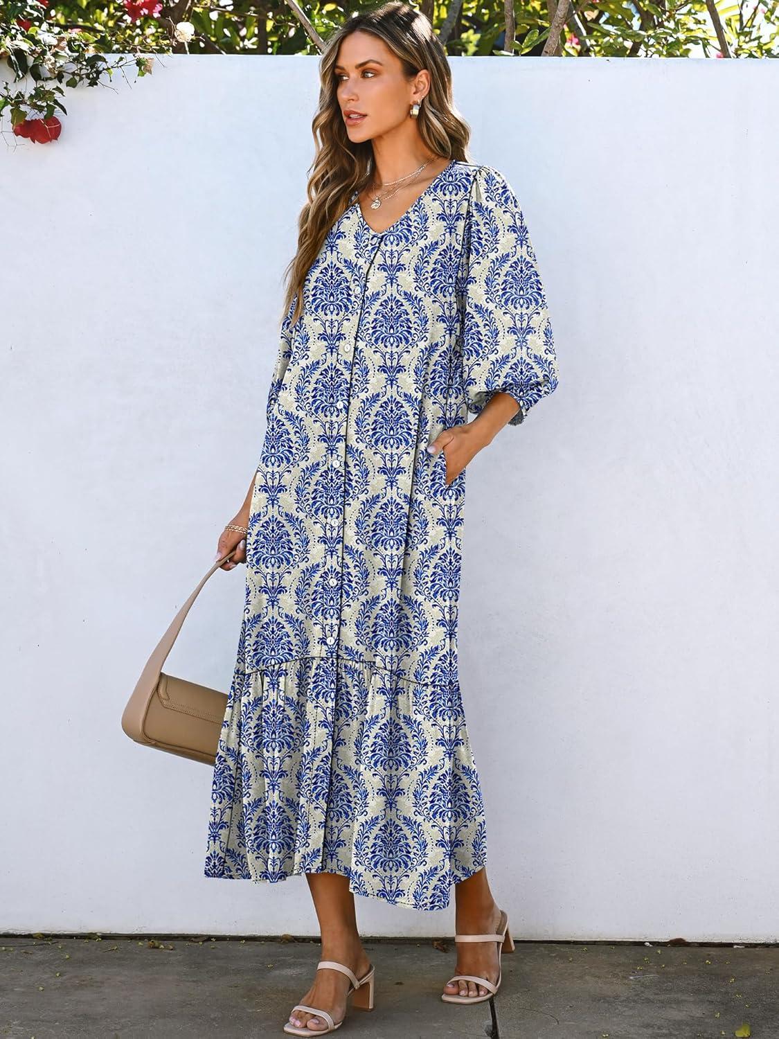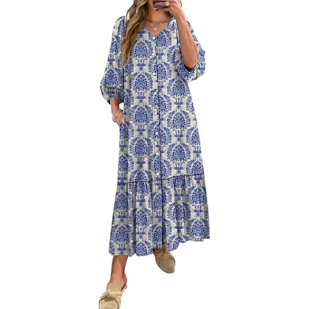 ANRABESS Boho Maxi Dresses for Women Summer Puff Sleeve V Neck Flowy Long Casual Dress with Pockets 2026 Vacation Clothes(Floral Blue Khaki)