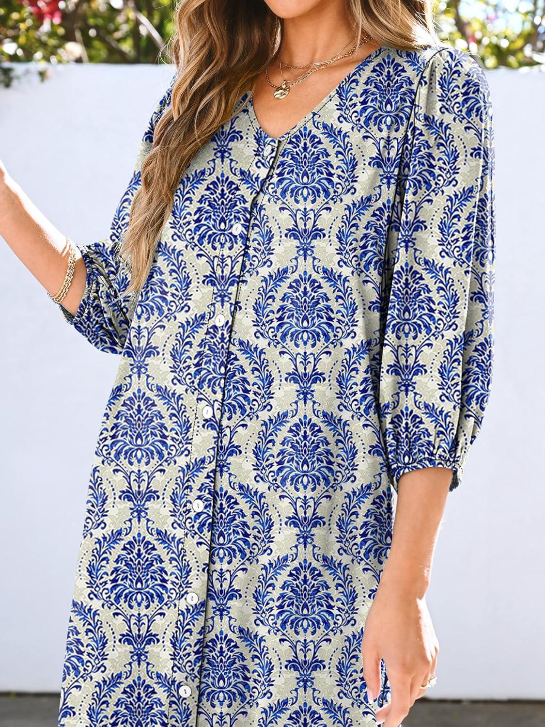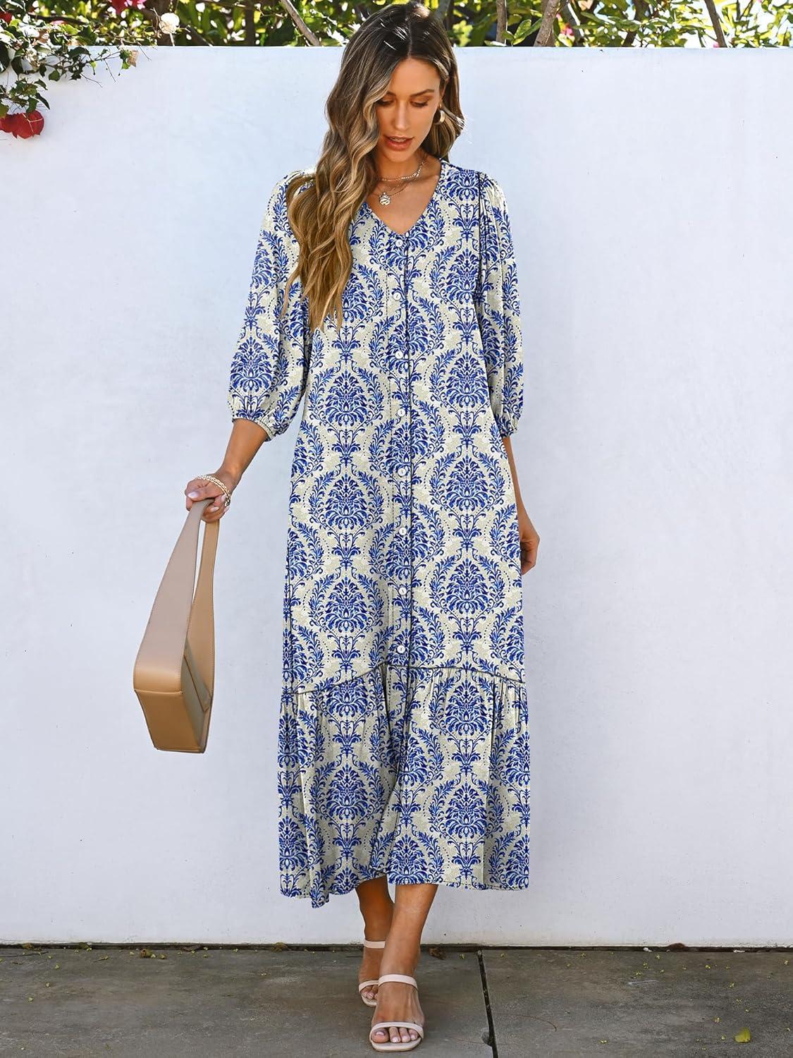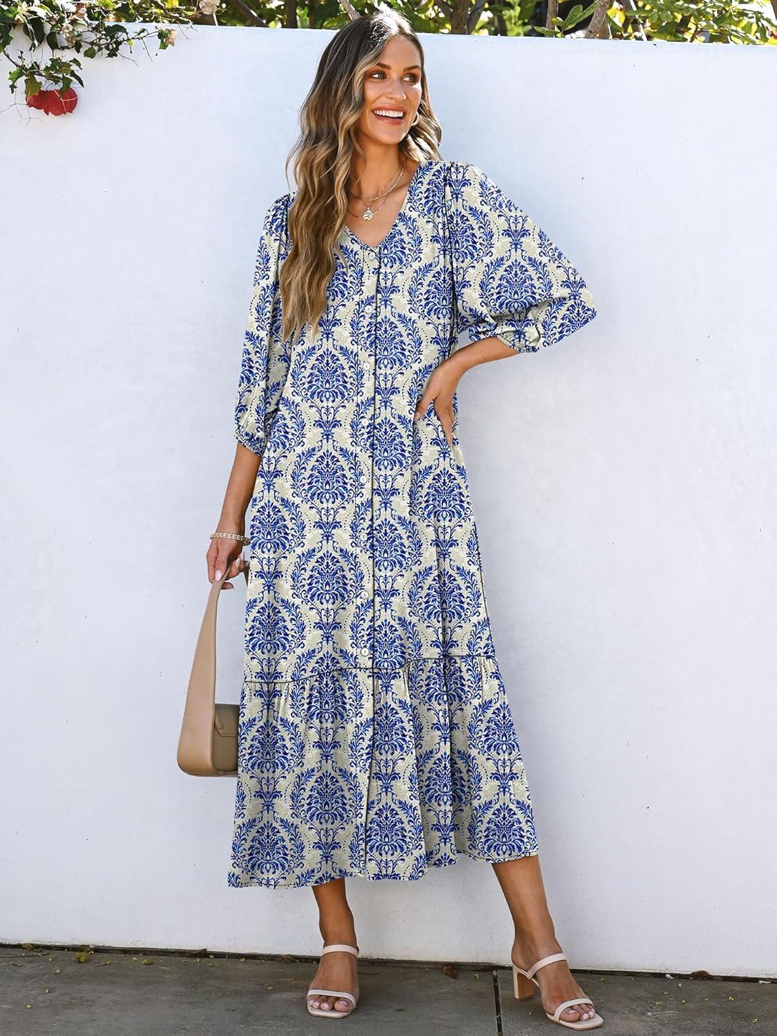 ANRABESS Boho Maxi Dresses for Women Summer Puff Sleeve V Neck Flowy Long Casual Dress with Pockets 2026 Vacation Clothes(Floral Blue Khaki)