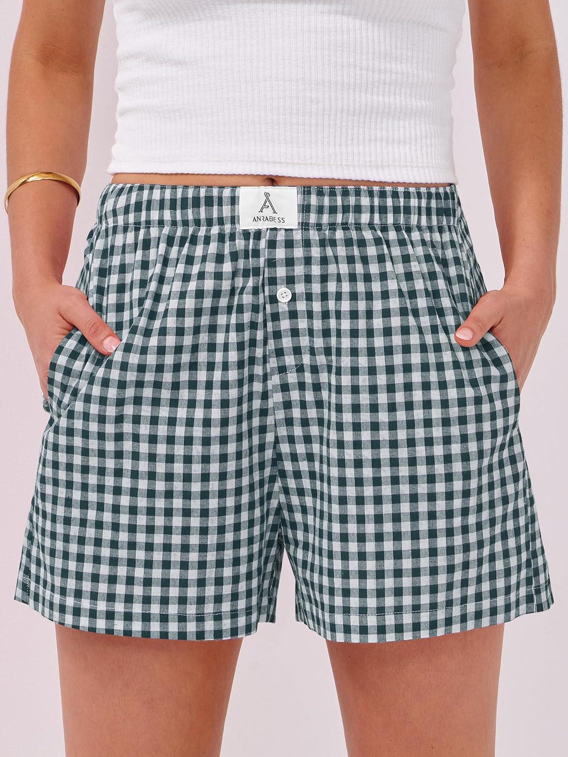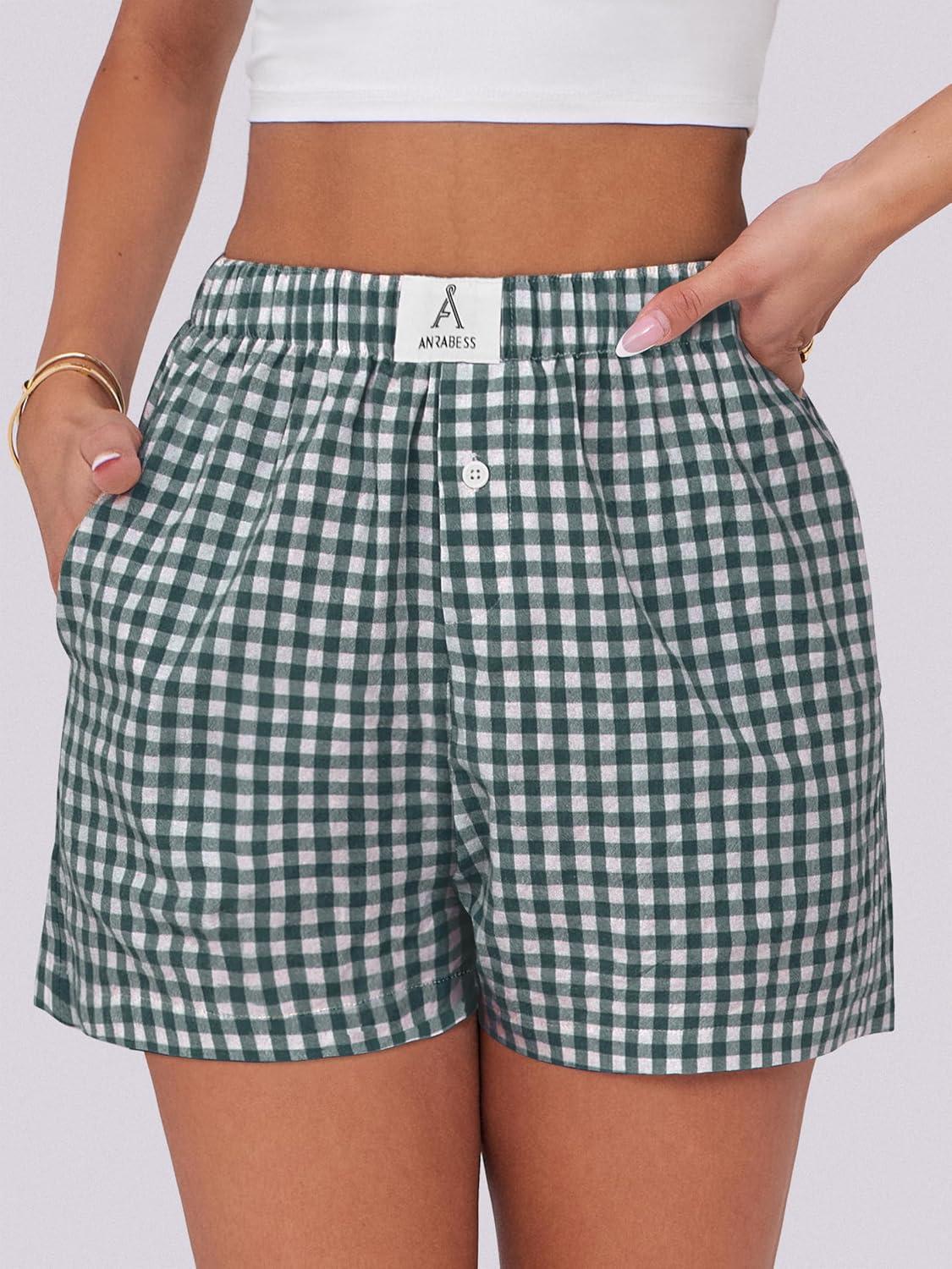 ANRABESS Boxer Shorts for Women Gingham Pajama 2025 Summer Casual Lounge Sleep Plaid Shorts Y2K Beach Bottoms(Deep Green White Plaid)