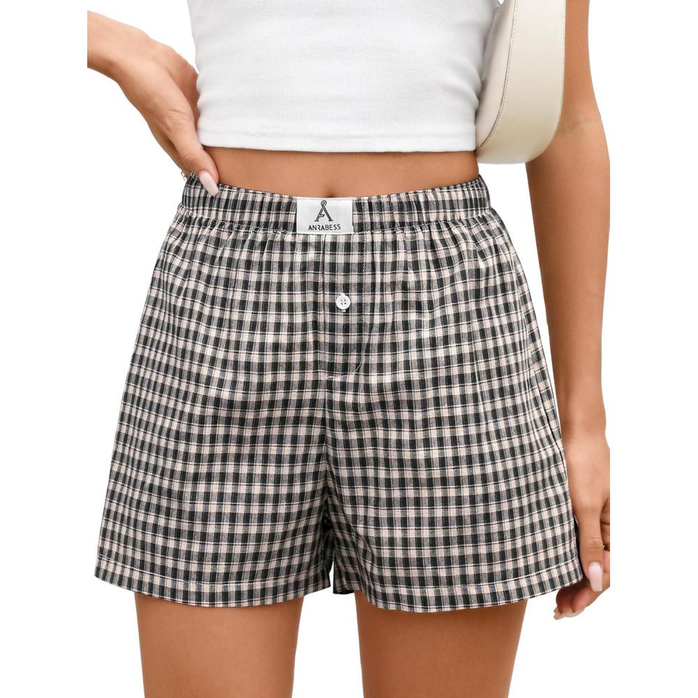 ANRABESS Boxer Shorts for Women Gingham Pajama 2026 Summer Casual Lounge Sleep Plaid Shorts Y2K Beach Bottoms(Multi Black Apricot Plaid)