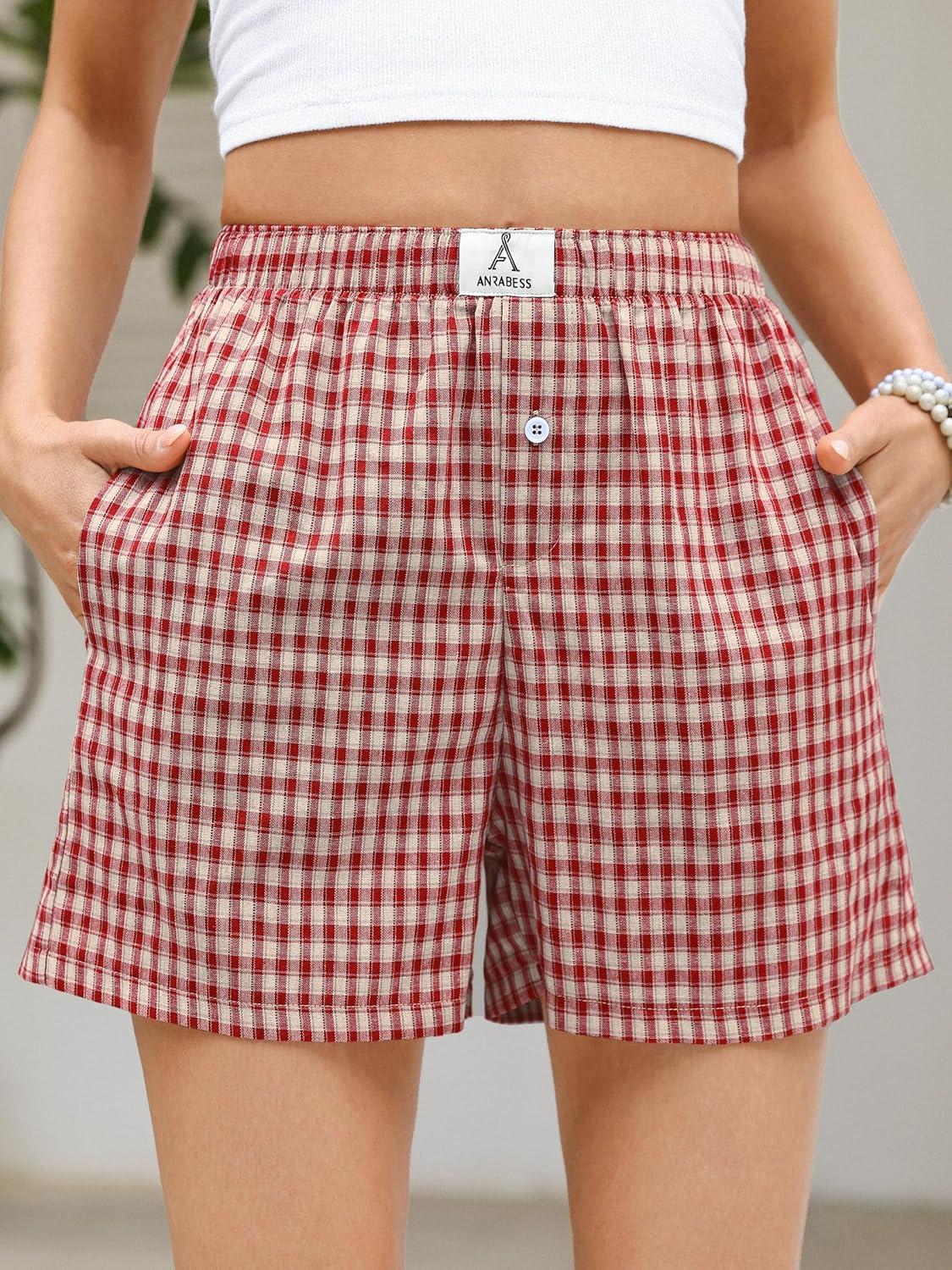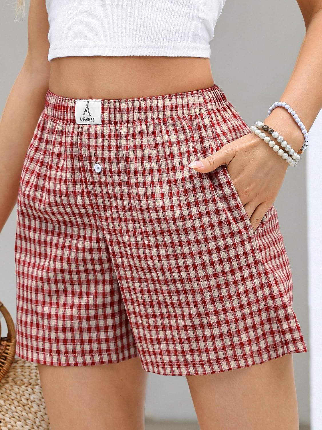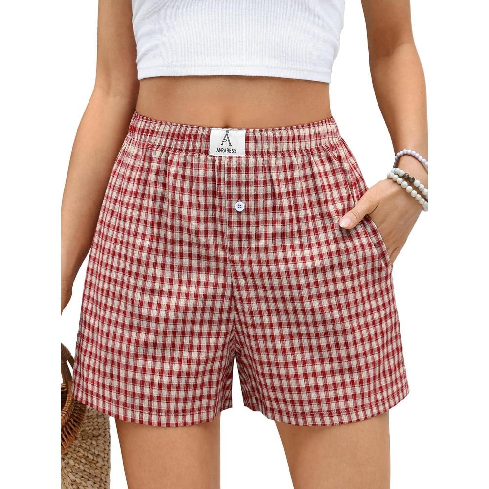ANRABESS Boxer Shorts for Women Gingham Pajama 2026 Summer Casual Lounge Sleep Plaid Shorts Y2K Beach Bottoms(Multi Red Apricot Plaid)