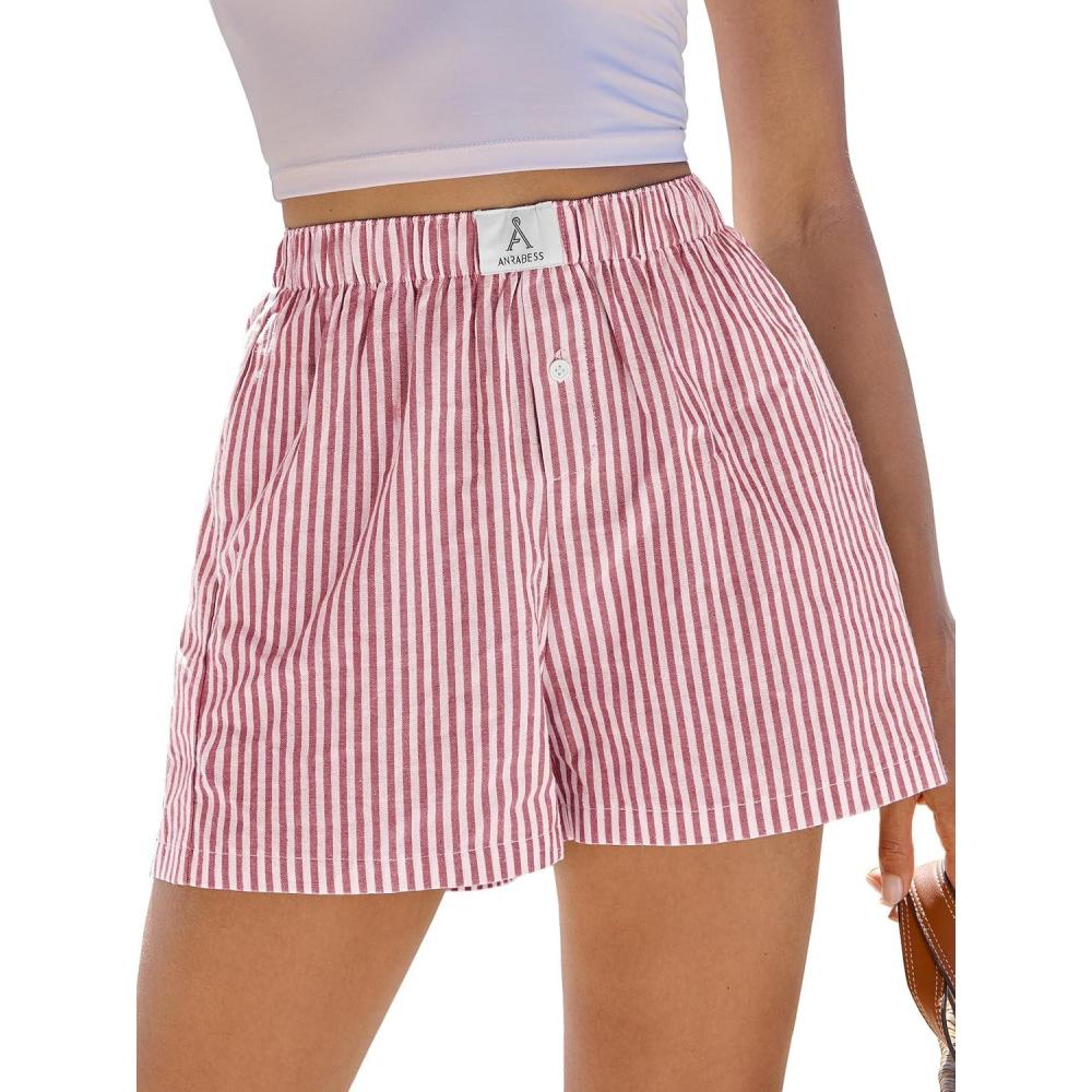 ANRABESS Boxer Shorts for Women Gingham Pajama 2026 Summer Casual Lounge Sleep Plaid Shorts Y2K Beach Bottoms(Red White Stripe)