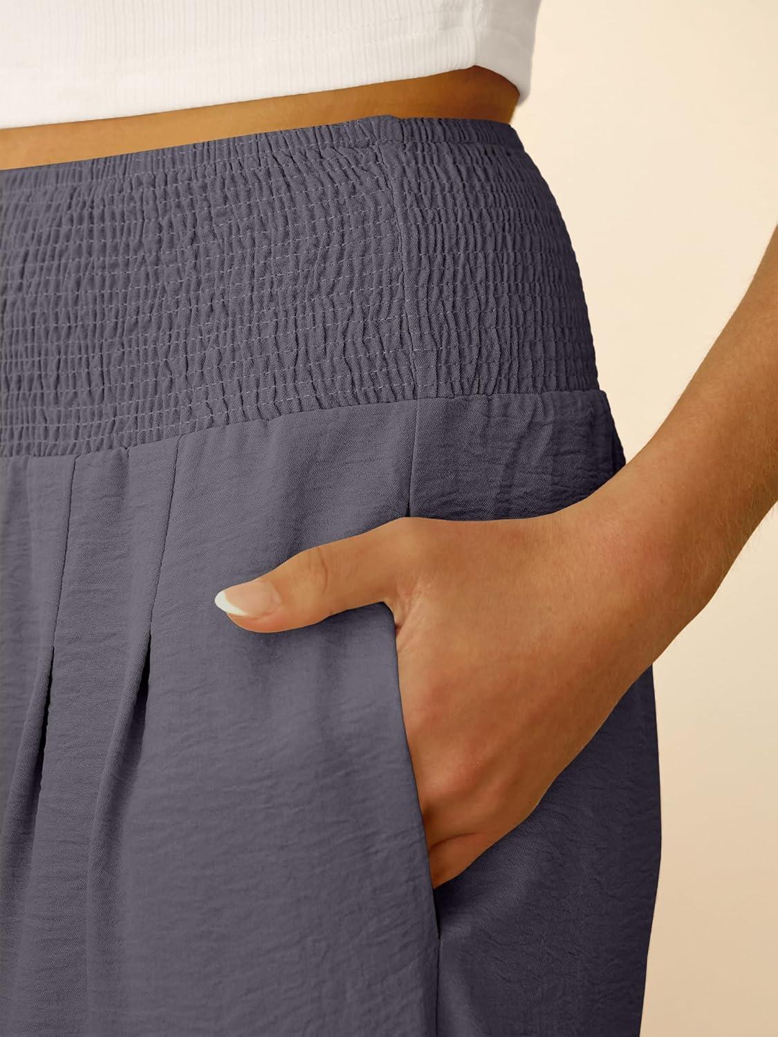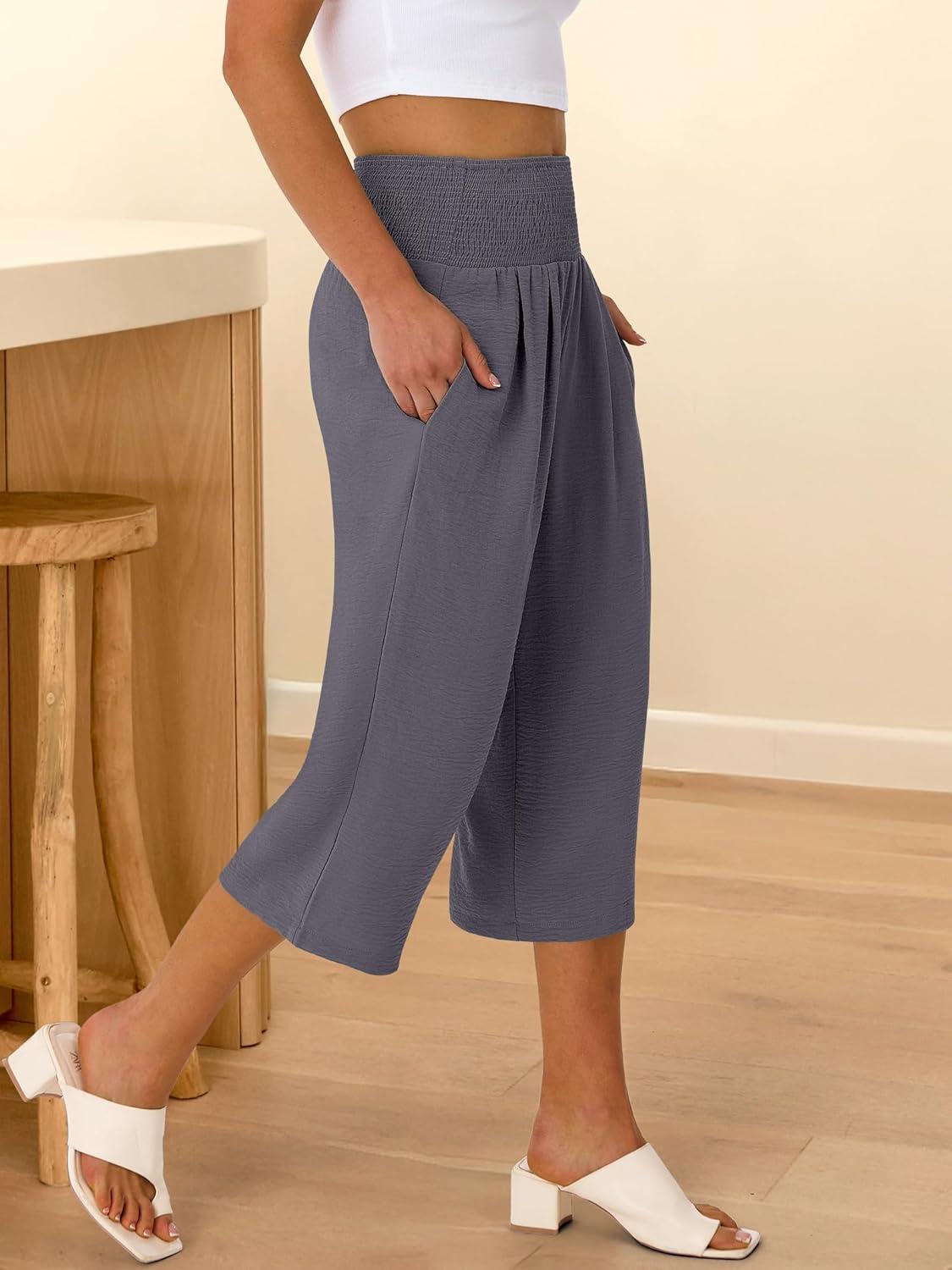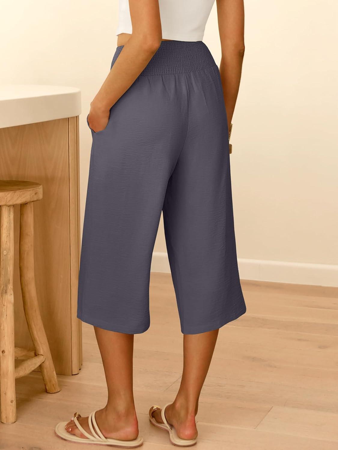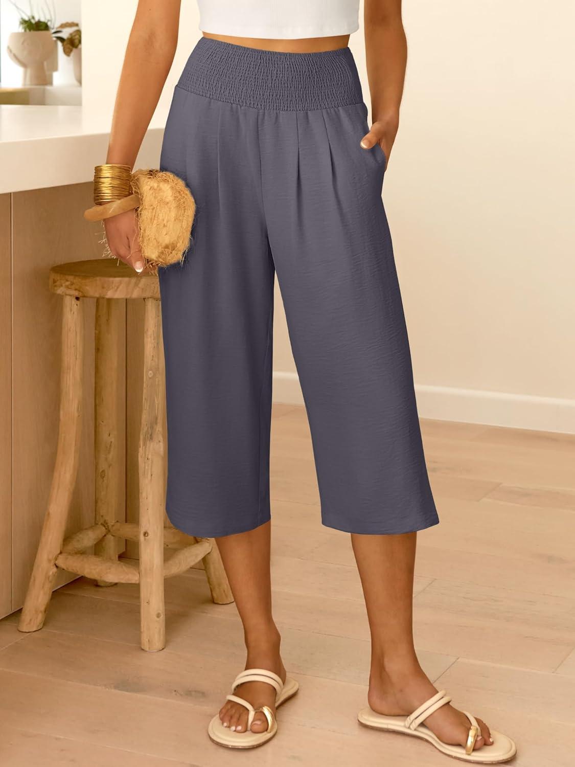 ANRABESS Capris Pants for Women Summer Casual Loose Flowy High Waisted Smocked Palazzo 2026 Lounge Beach Cropped Trousers(Dark Gray)