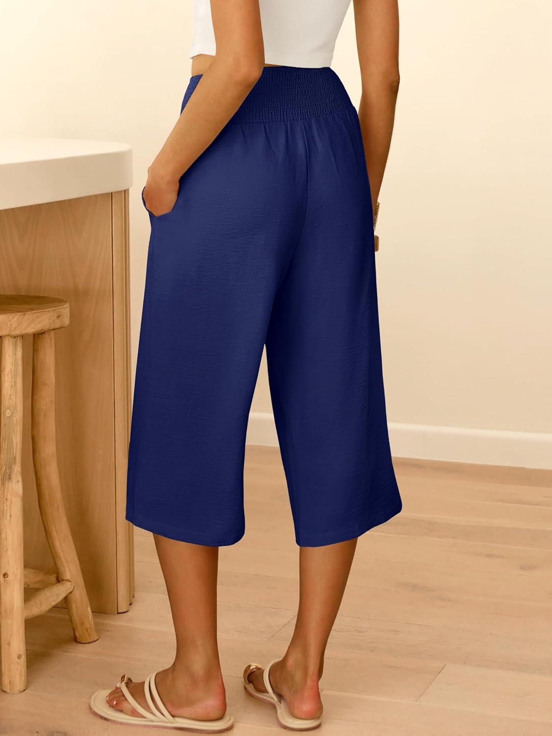 ANRABESS Capris Pants for Women Summer Casual Loose Flowy High Waisted Smocked Palazzo 2026 Lounge Beach Cropped Trousers(Navy Blue)