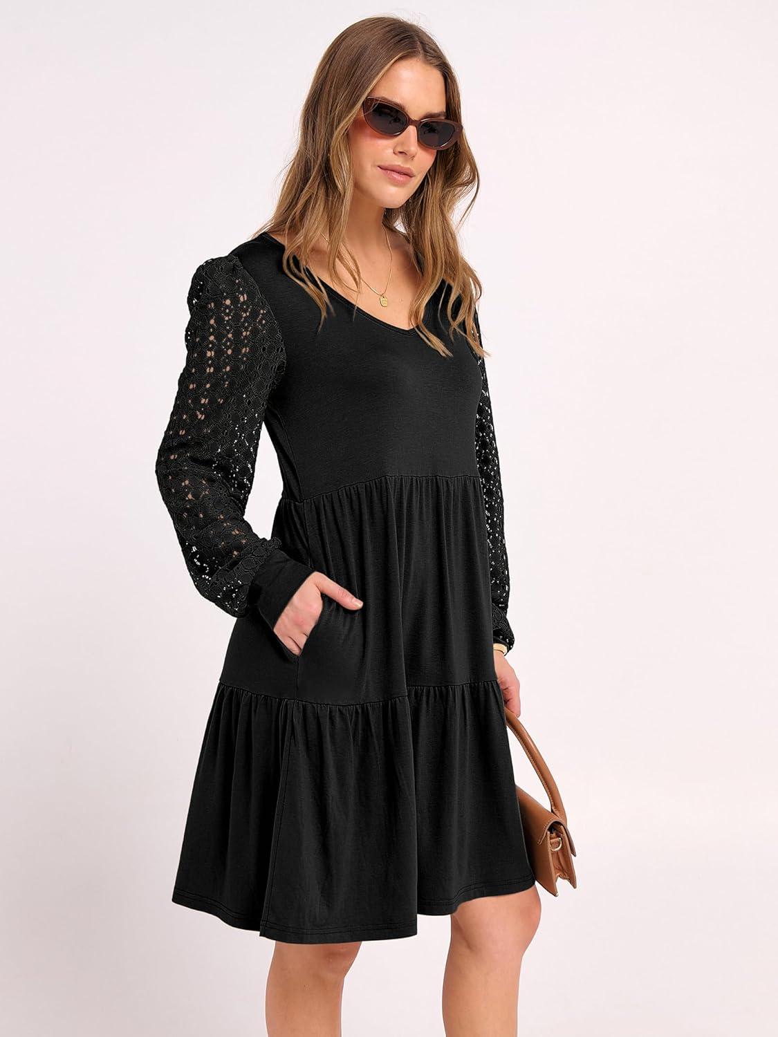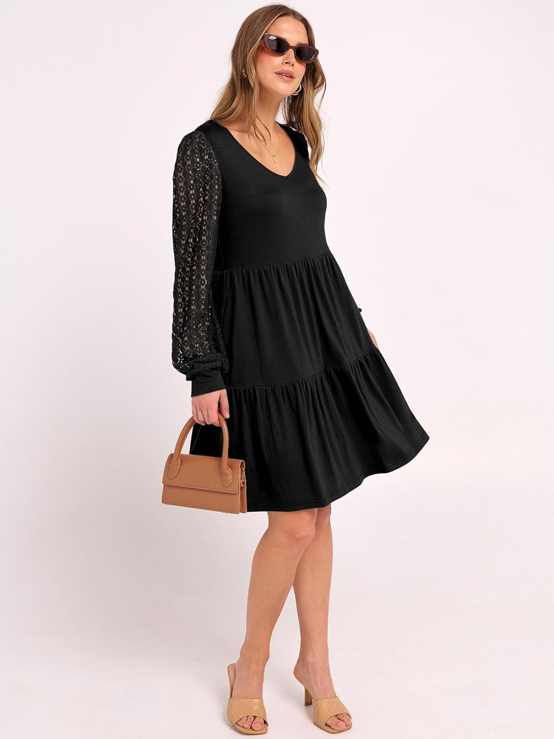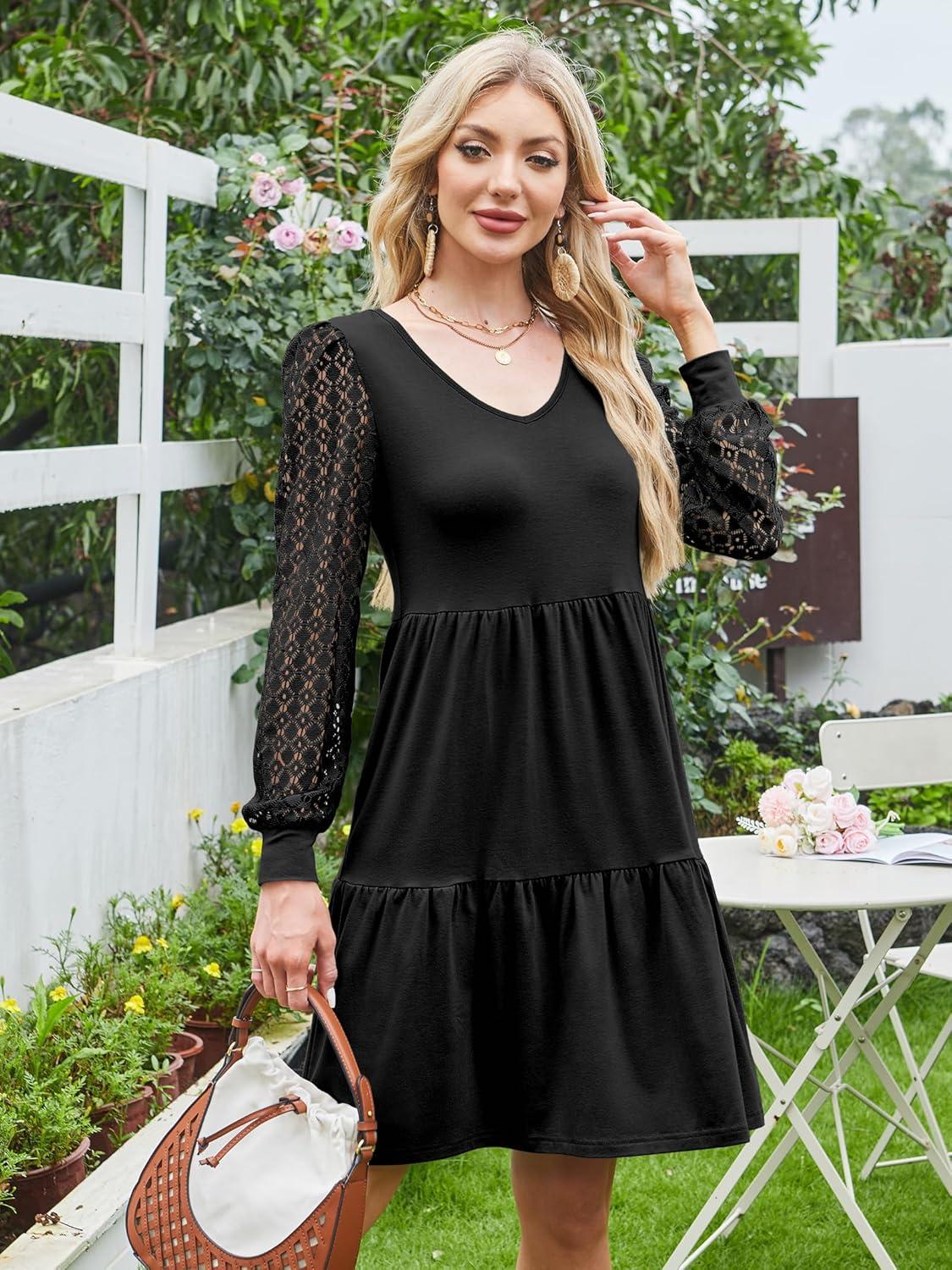 ANRABESS Dresses for Women Casual Lace Long Sleeve V Neck Tiered Swing Flowy Loose A-line Mini Short 2025 Fall Vacation Dress(Black)