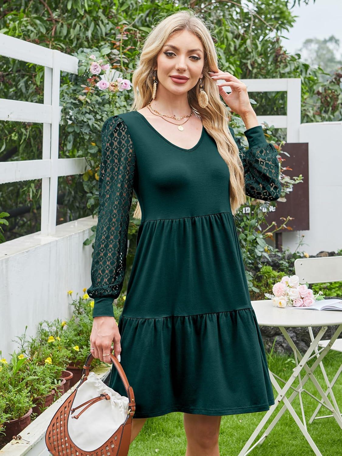 ANRABESS Dresses for Women Casual Lace Long Sleeve V Neck Tiered Swing Flowy Loose A-line Mini Short 2025 Fall Vacation Dress(Deep Green)