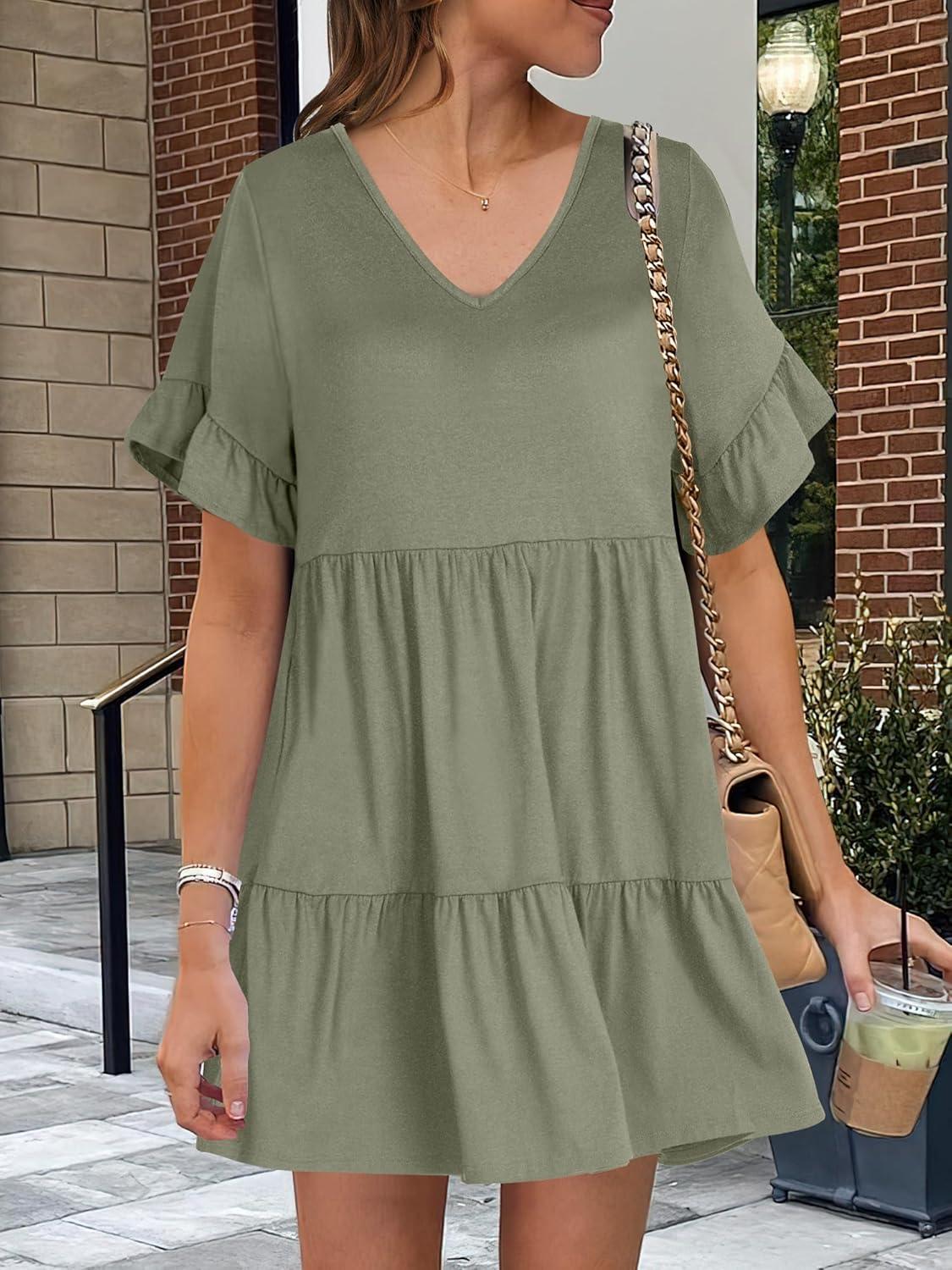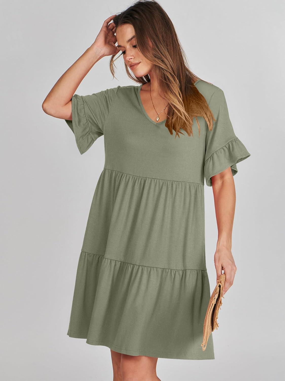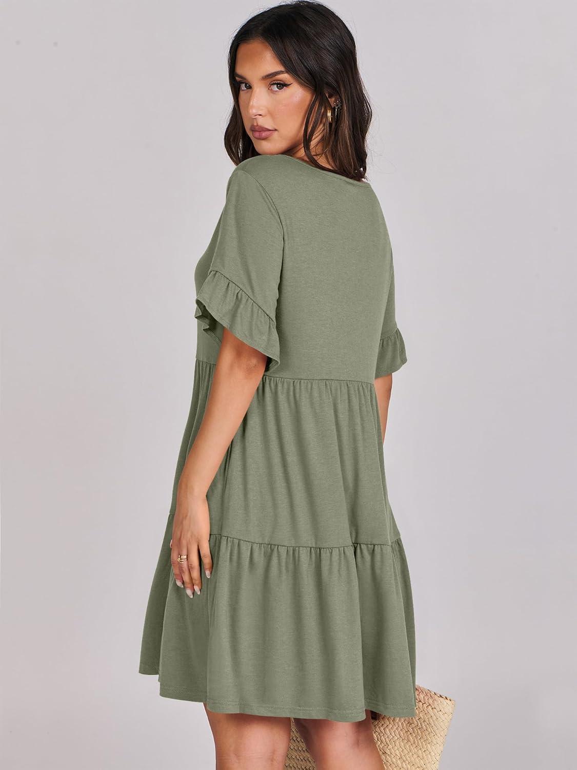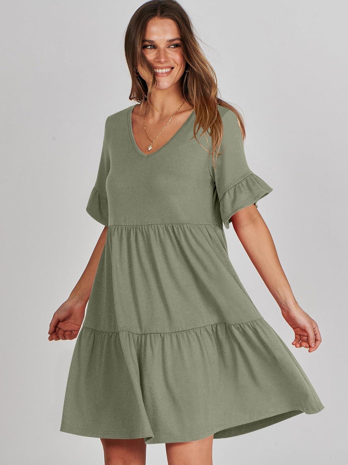 ANRABESS Dresses for Women Summer 2025 V Neck Ruffle Sleeve A Line Tiered Flowy Casual Trendy Mini Beach Dress with Pockets(Army Green)