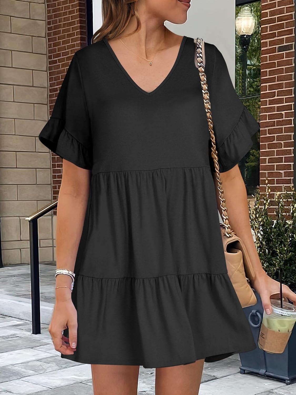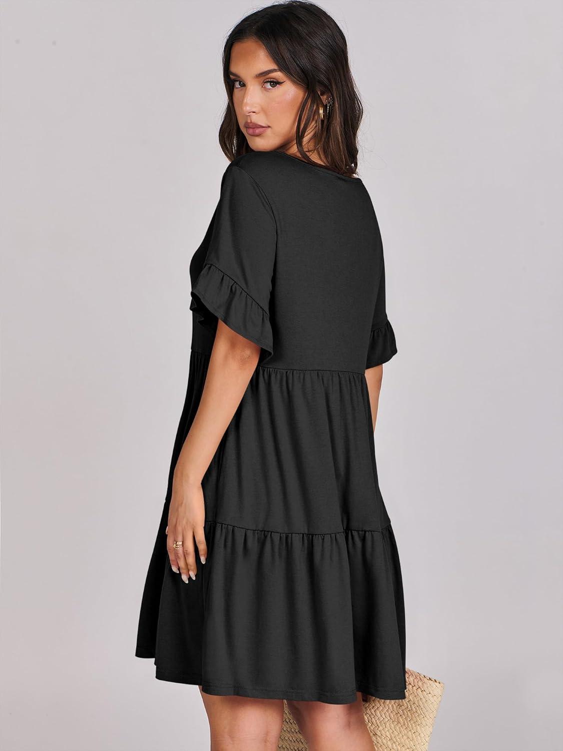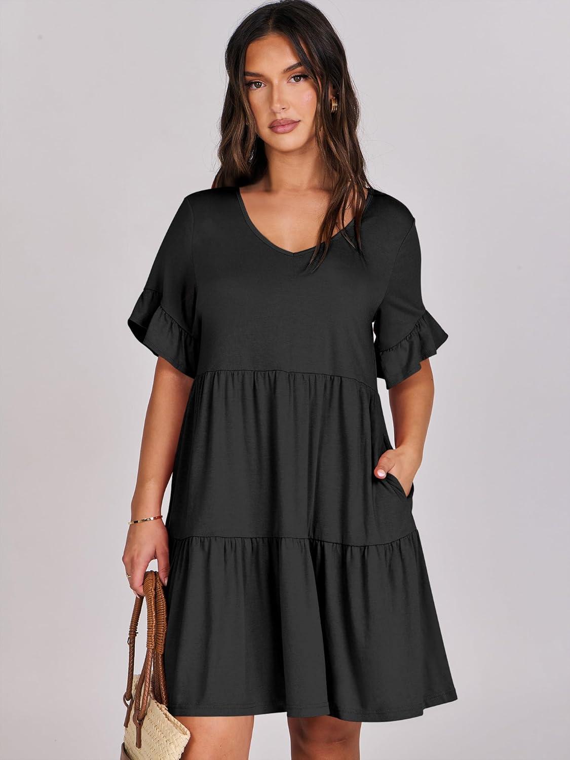 ANRABESS Dresses for Women Summer 2025 V Neck Ruffle Sleeve A Line Tiered Flowy Casual Trendy Mini Beach Dress with Pockets(Black)