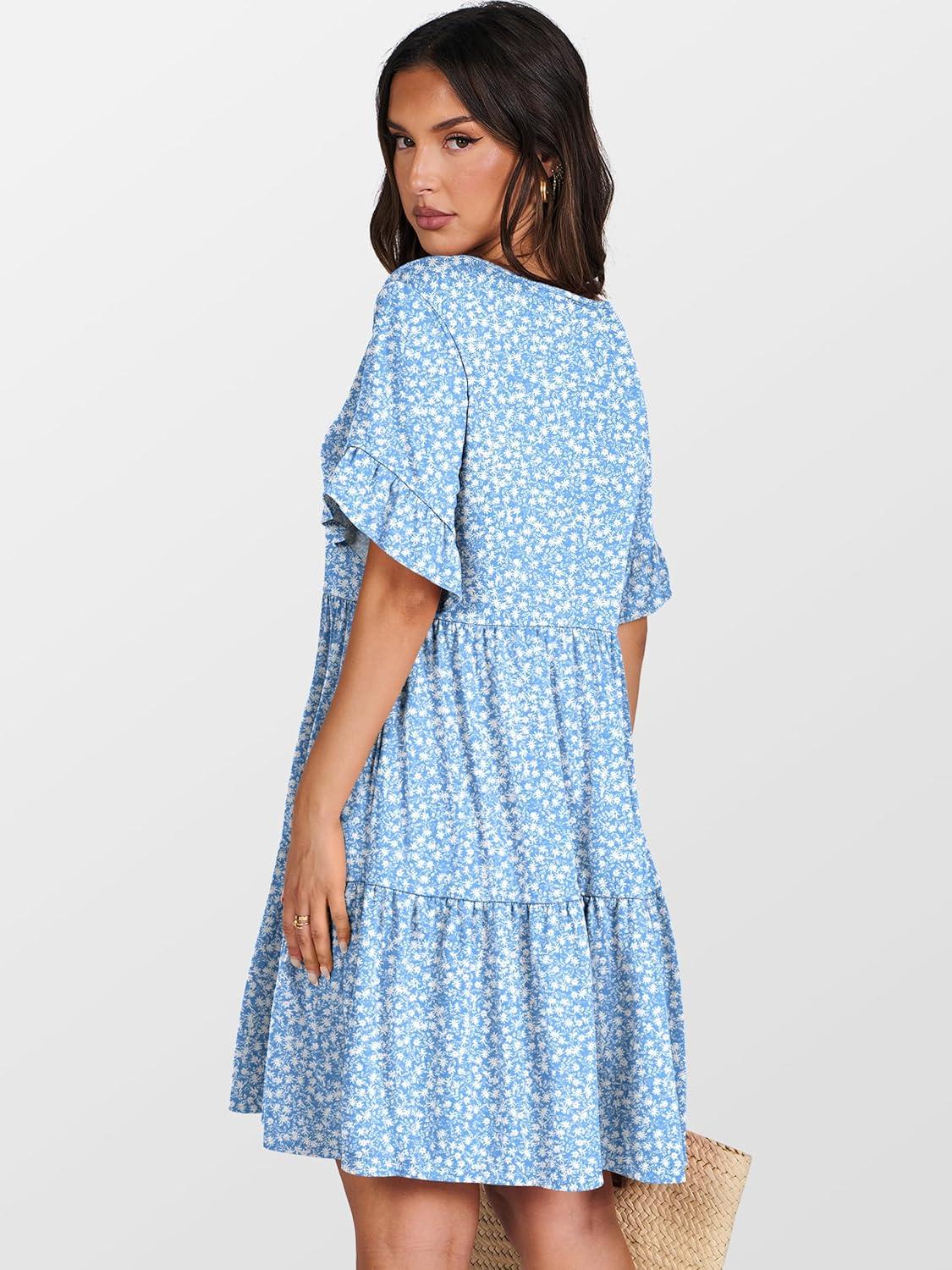 ANRABESS Dresses for Women Summer 2025 V Neck Ruffle Sleeve A Line Tiered Flowy Casual Trendy Mini Beach Dress with Pockets(Blue White Floral)