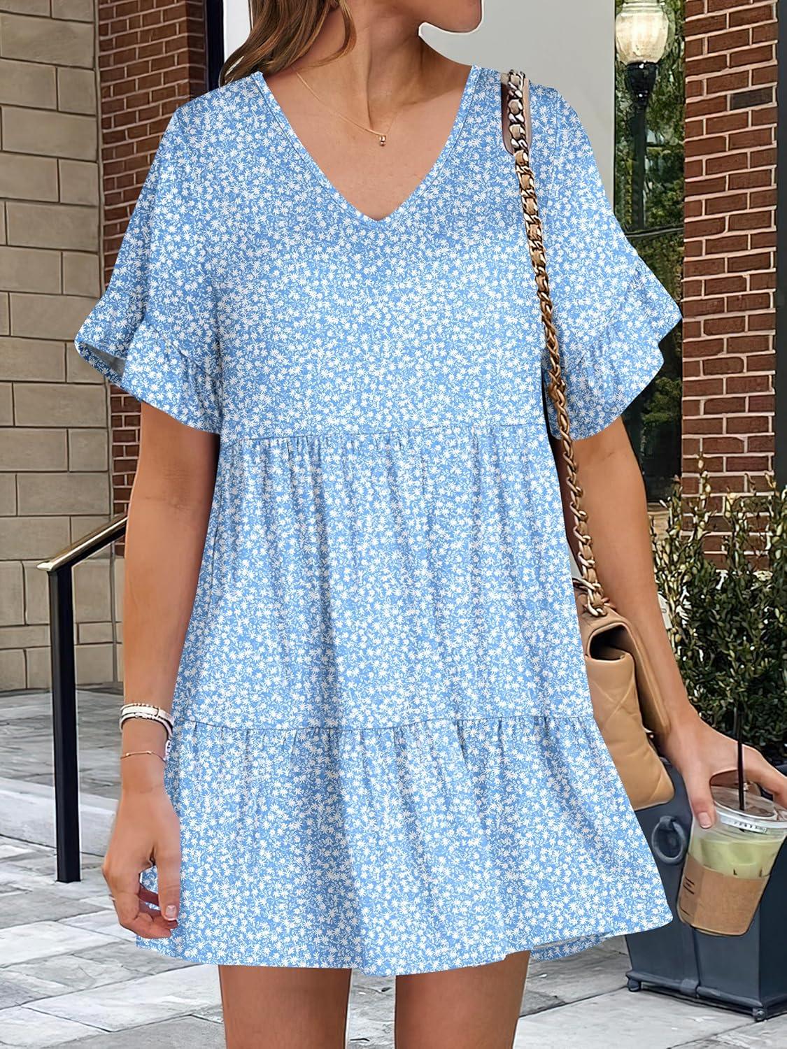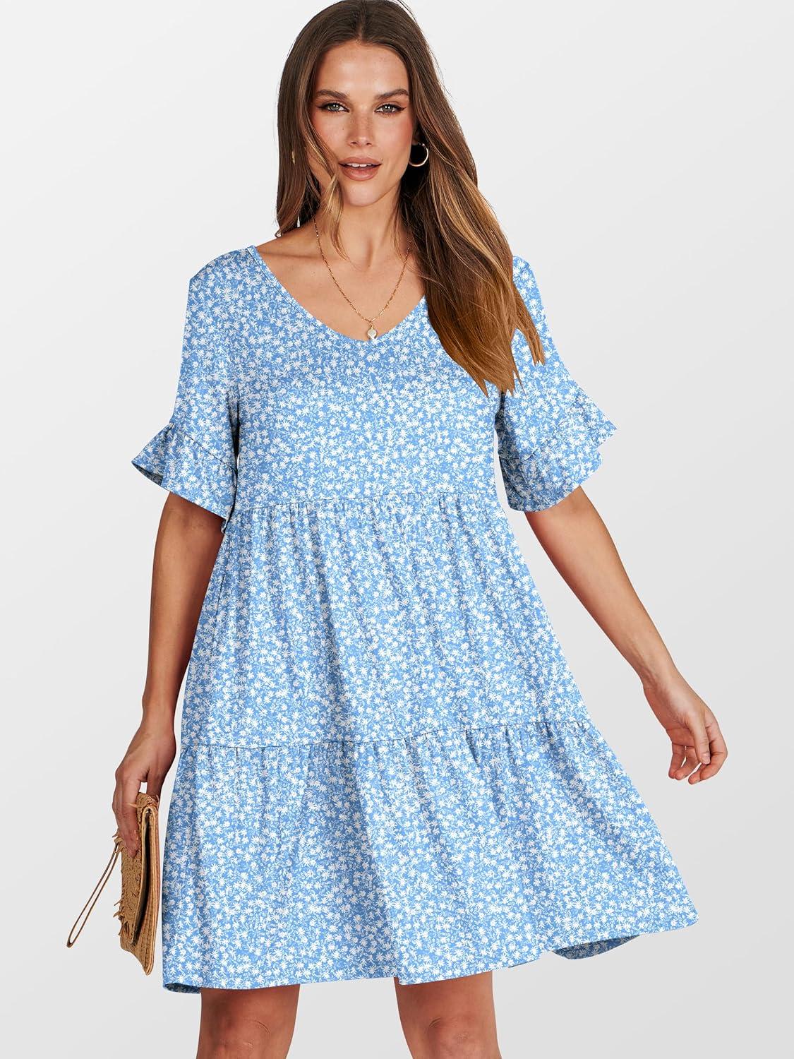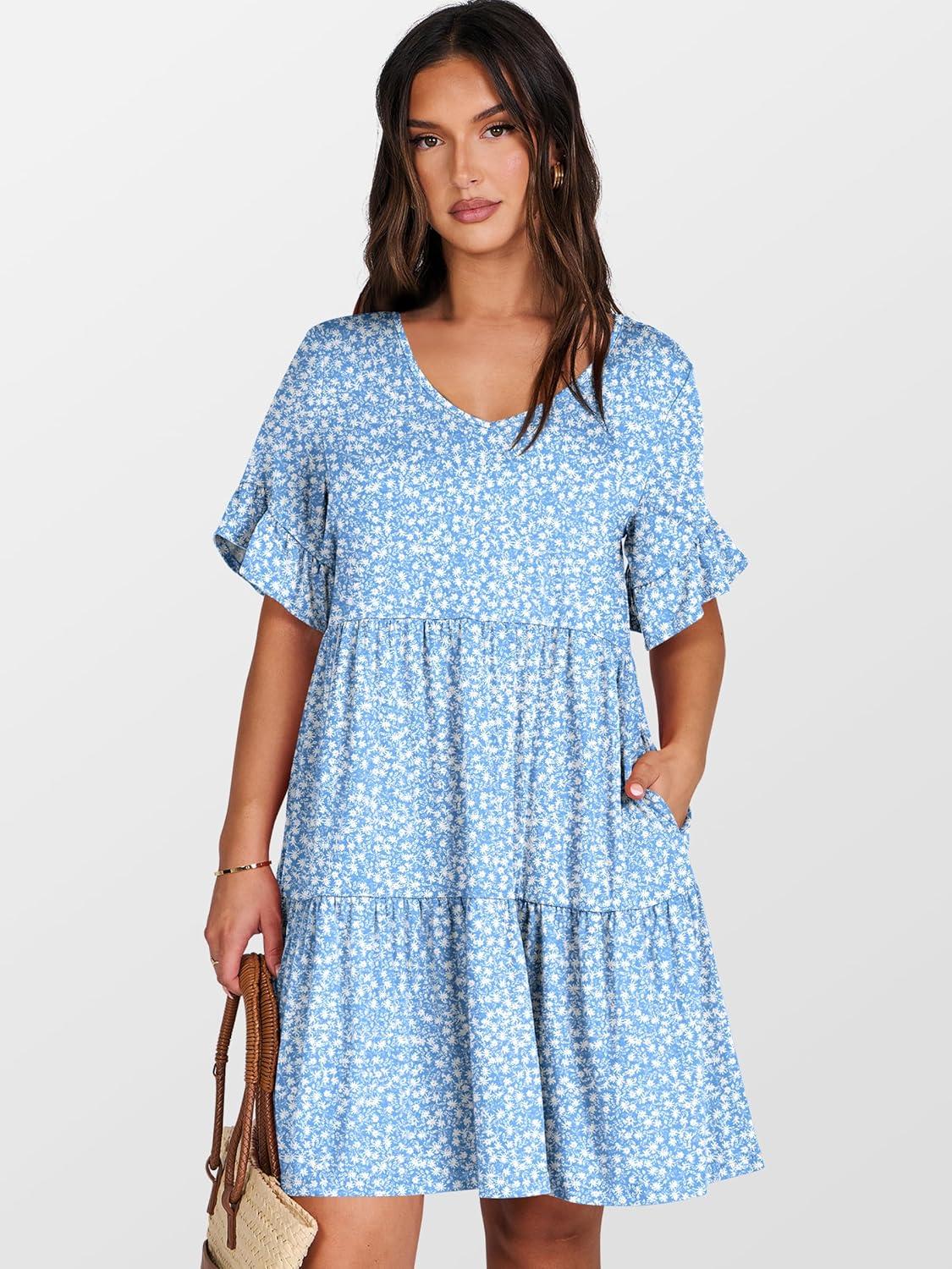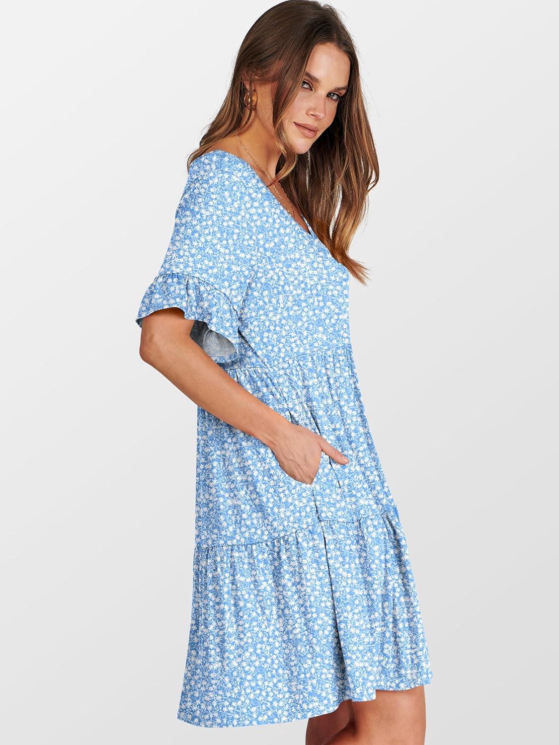 ANRABESS Dresses for Women Summer 2025 V Neck Ruffle Sleeve A Line Tiered Flowy Casual Trendy Mini Beach Dress with Pockets(Blue Pink Floral)