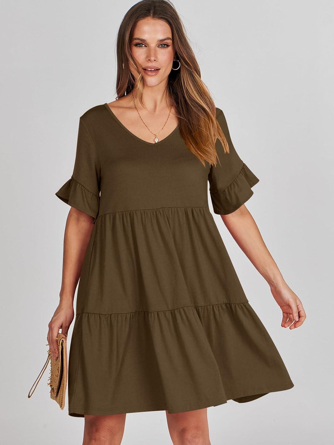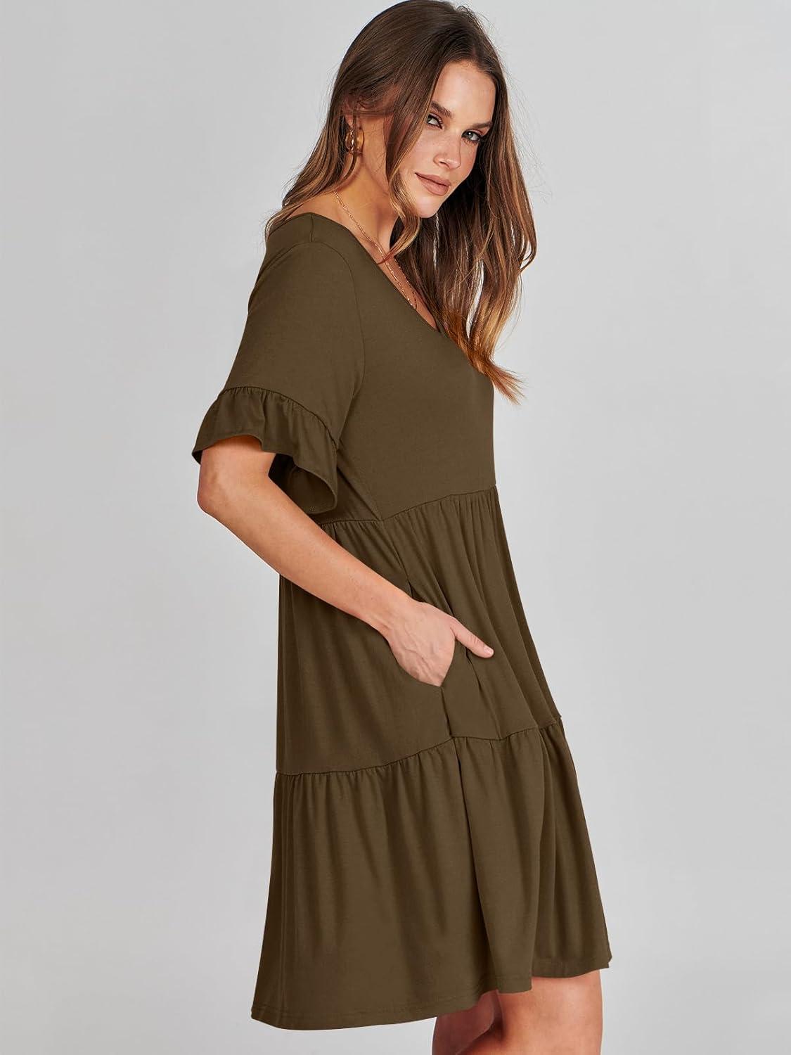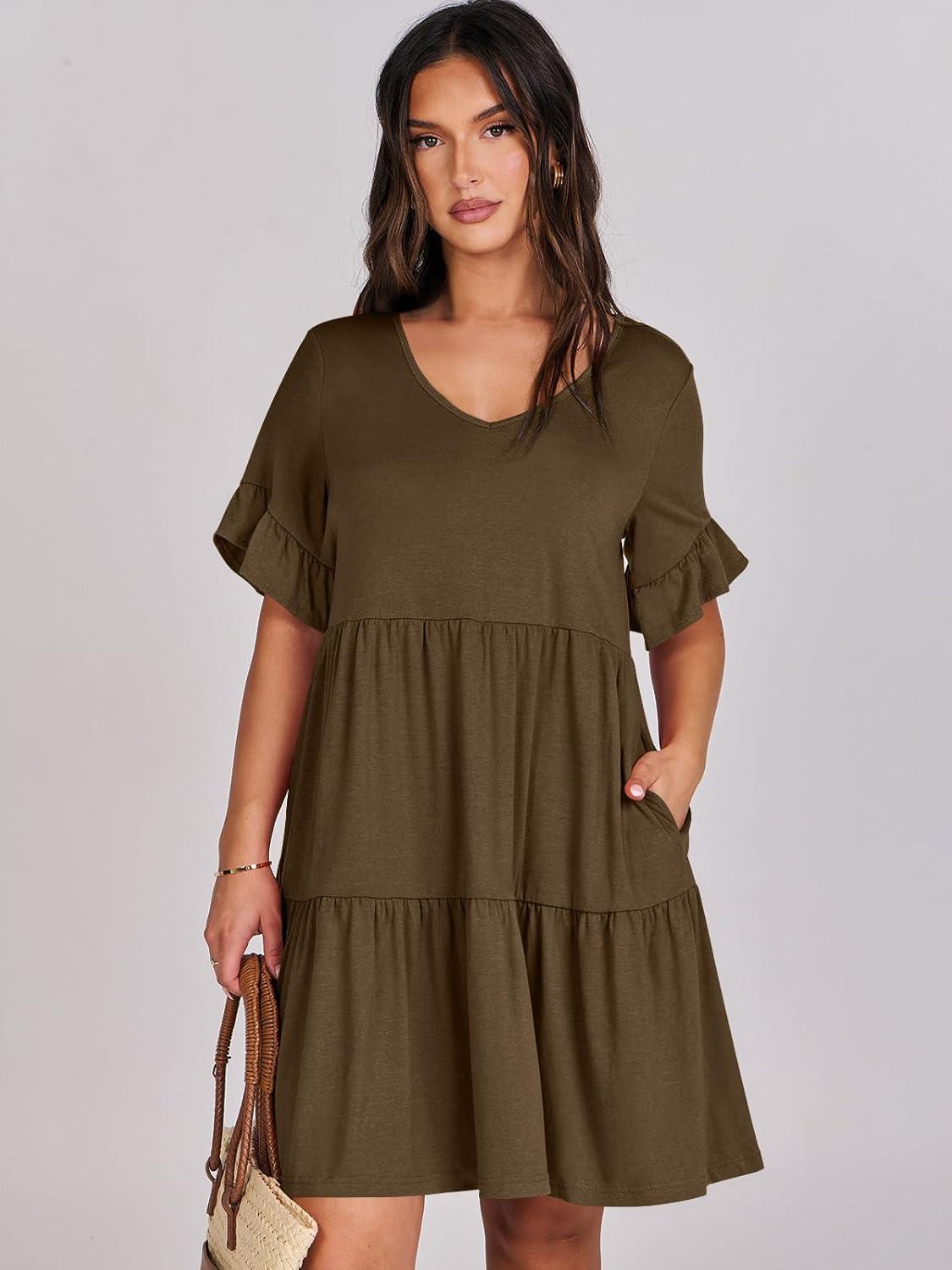 ANRABESS Dresses for Women Summer 2025 V Neck Ruffle Sleeve A Line Tiered Flowy Casual Trendy Mini Beach Dress with Pockets(Coffee)