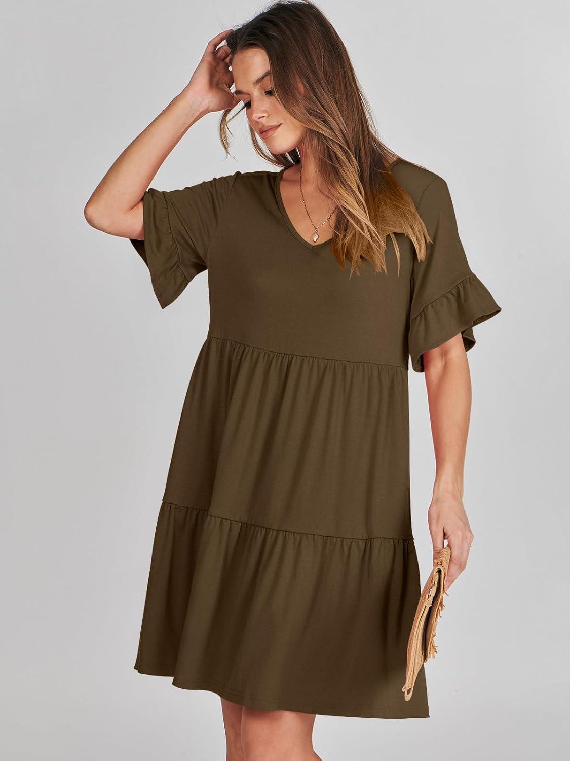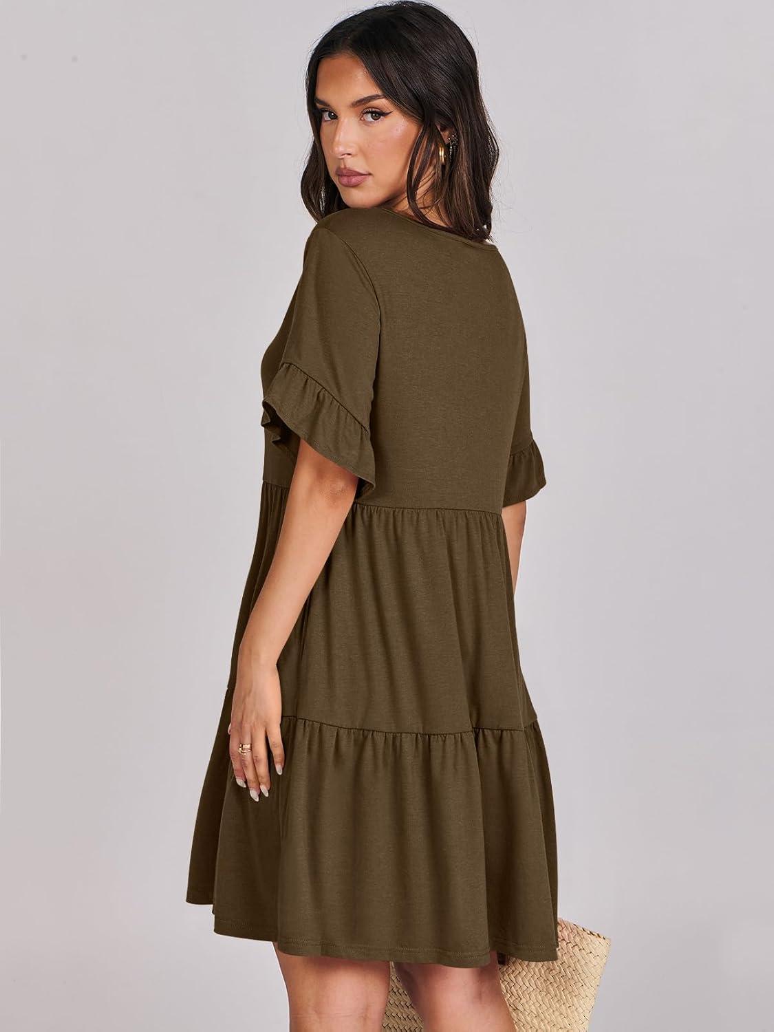 imageANRABESS Dresses for Women Summer 2025 V Neck Ruffle Sleeve A Line Tiered Flowy Casual Trendy Mini Beach Dress with PocketsCoffee