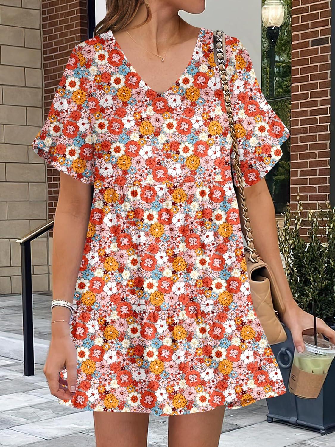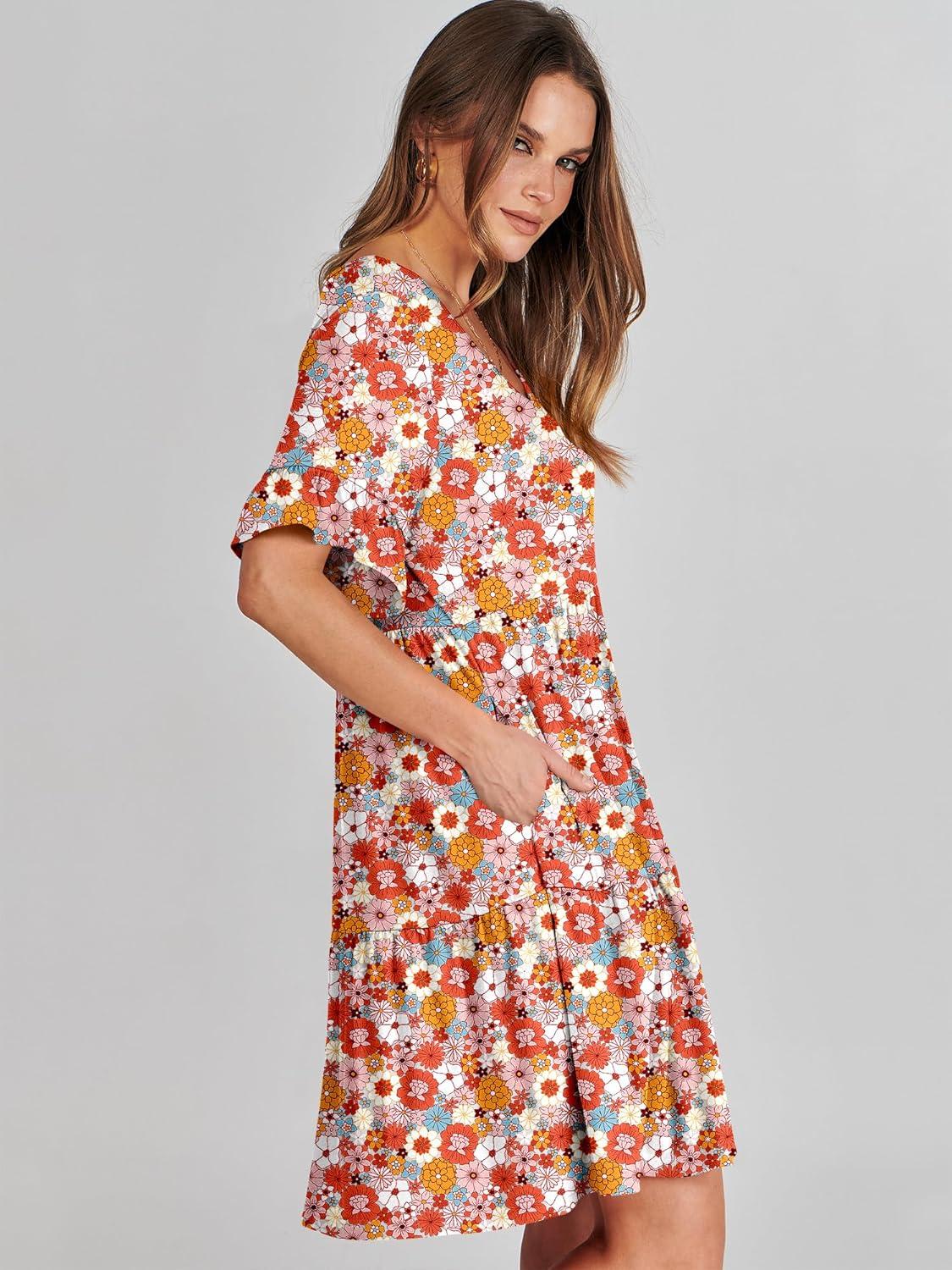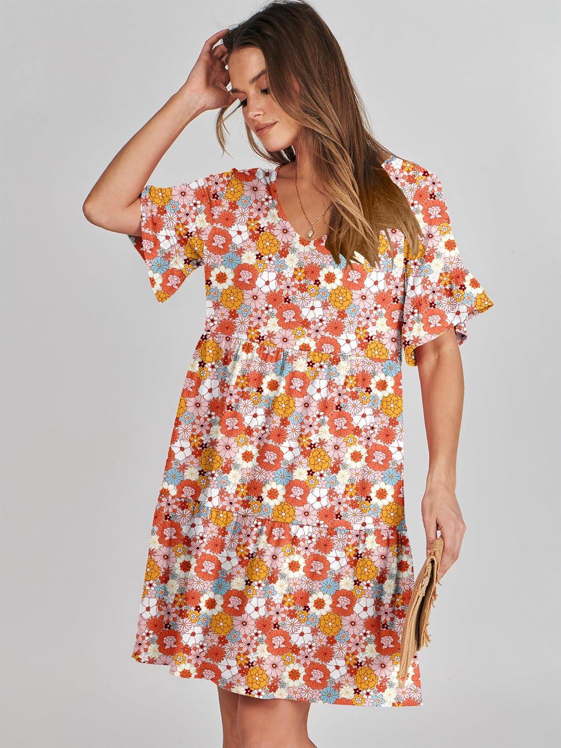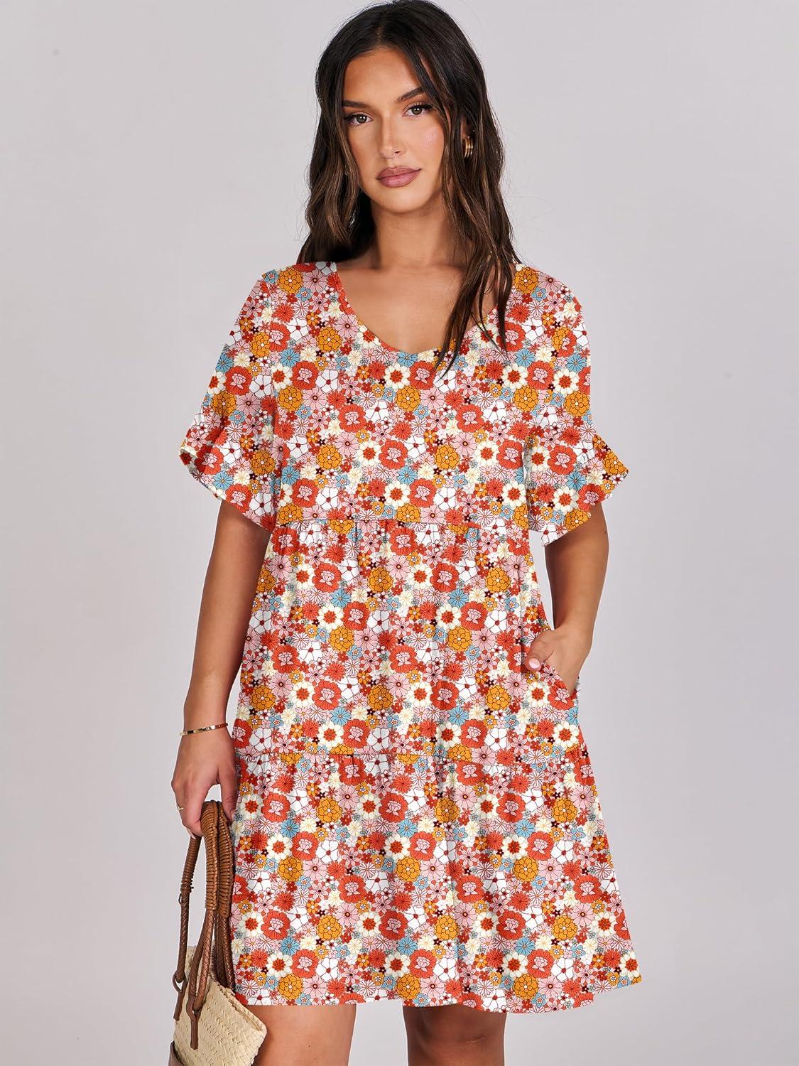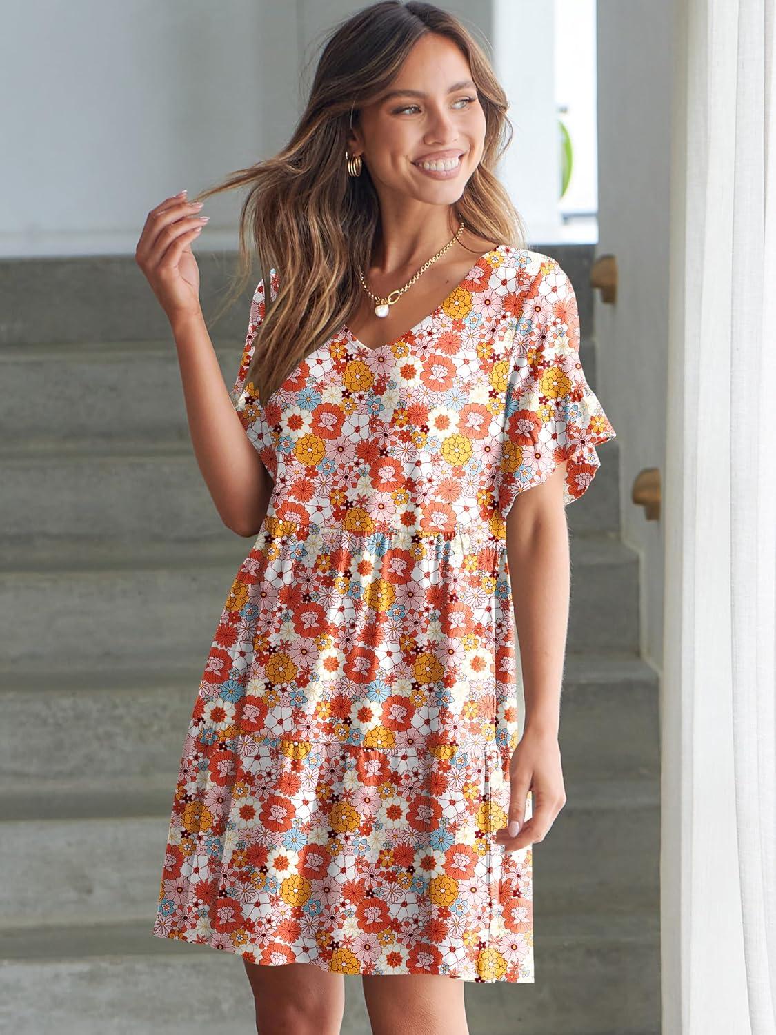 ANRABESS Dresses for Women Summer 2025 V Neck Ruffle Sleeve A Line Tiered Flowy Casual Trendy Mini Beach Dress with Pockets(Orange Floral)