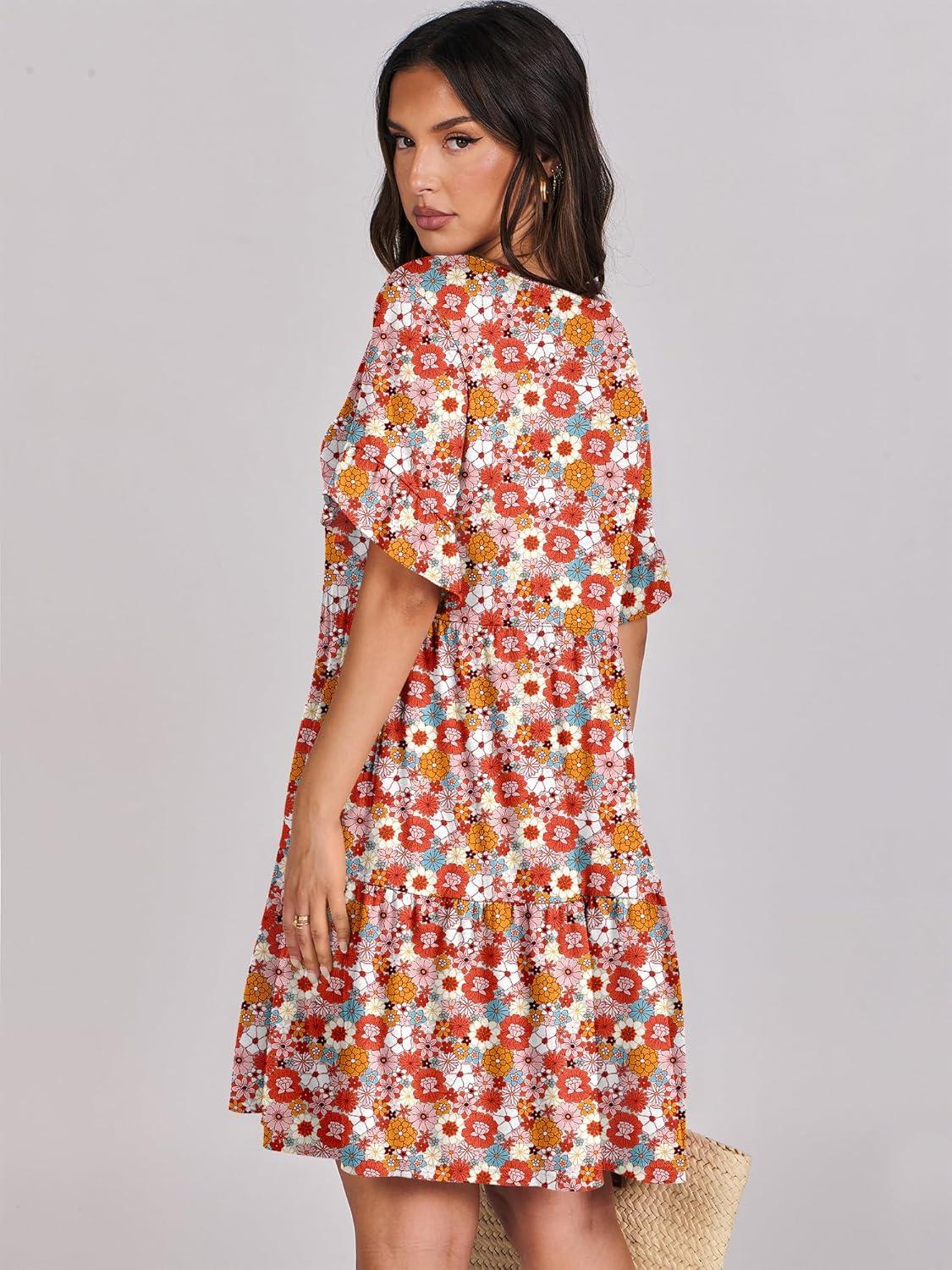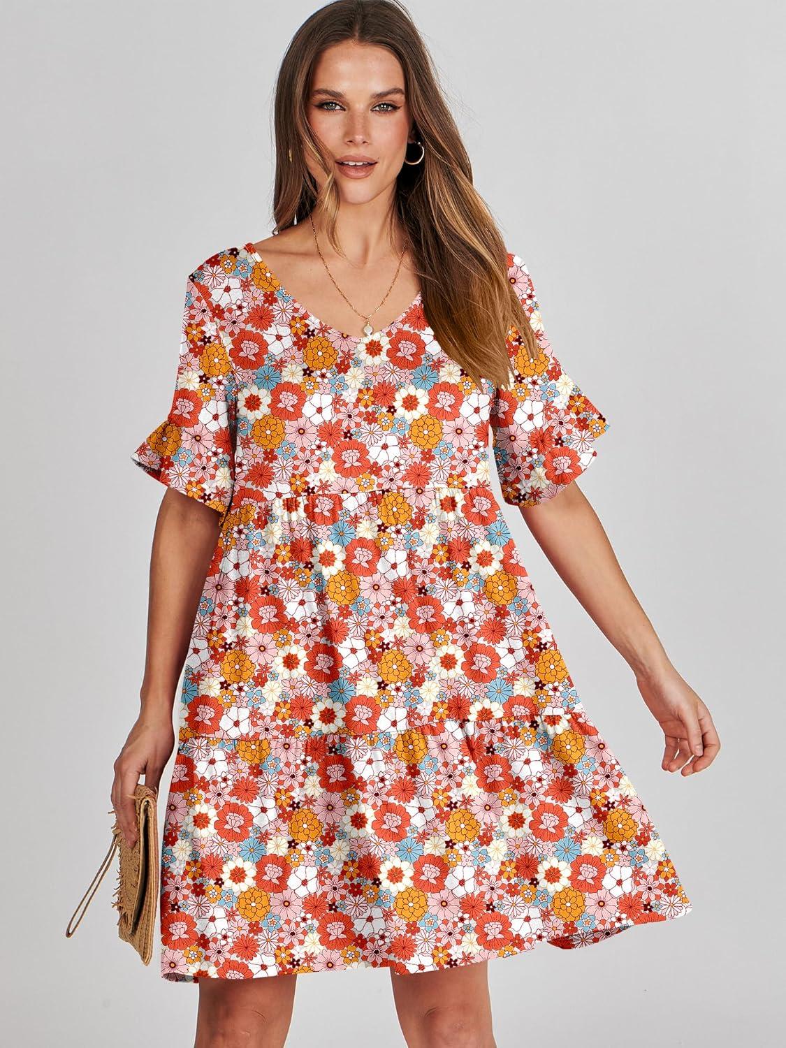 ANRABESS Dresses for Women Summer 2025 V Neck Ruffle Sleeve A Line Tiered Flowy Casual Trendy Mini Beach Dress with Pockets(Multicolour Floral)