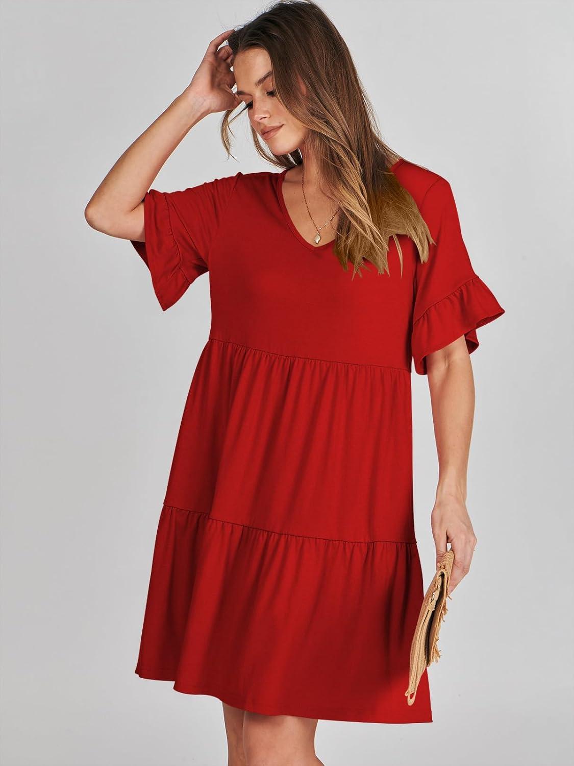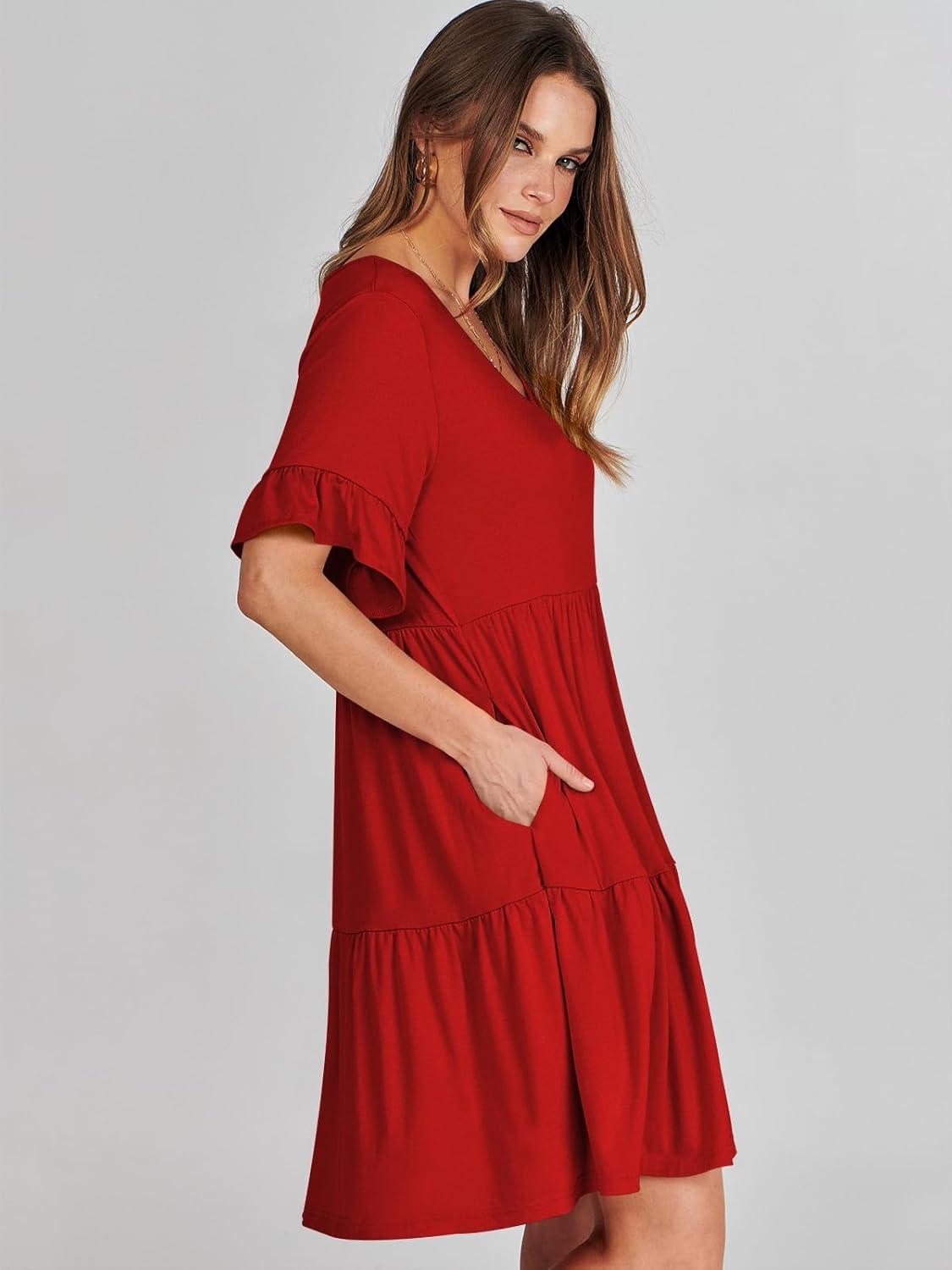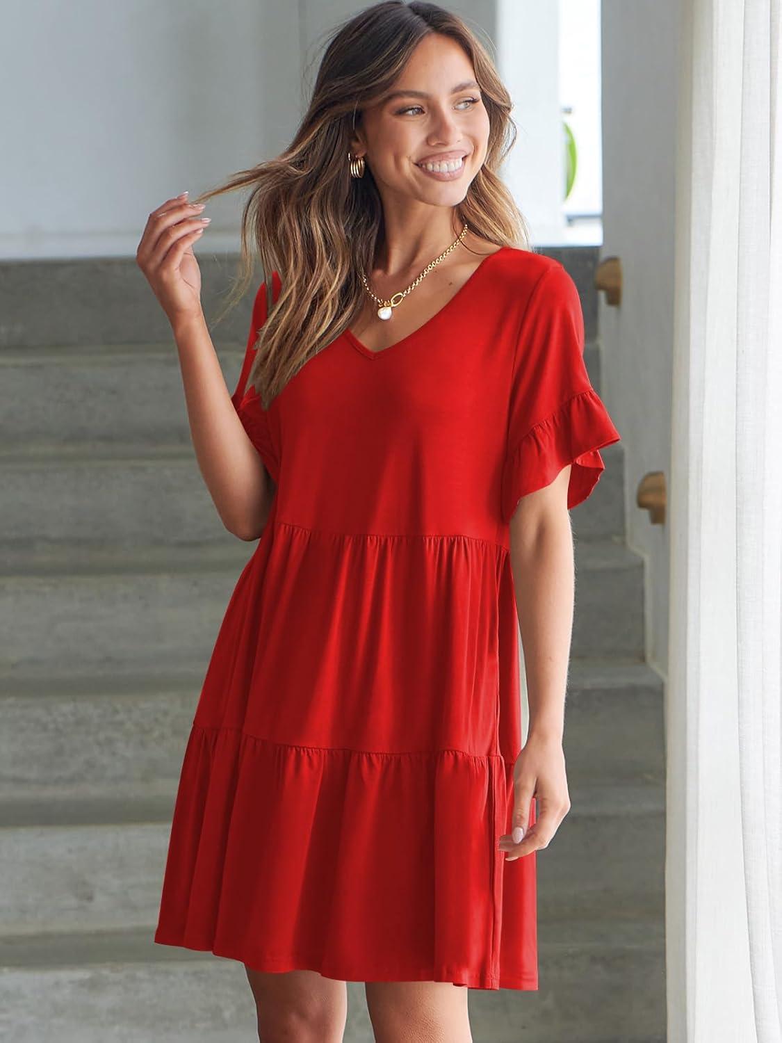 ANRABESS Dresses for Women Summer 2025 V Neck Ruffle Sleeve A Line Tiered Flowy Casual Trendy Mini Beach Dress with Pockets(Red)