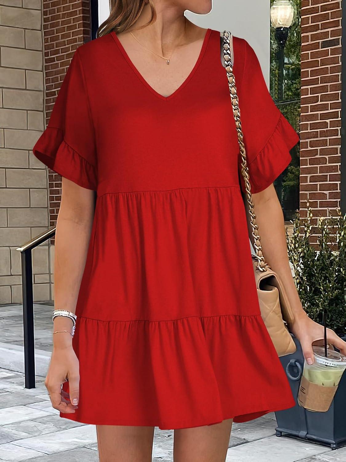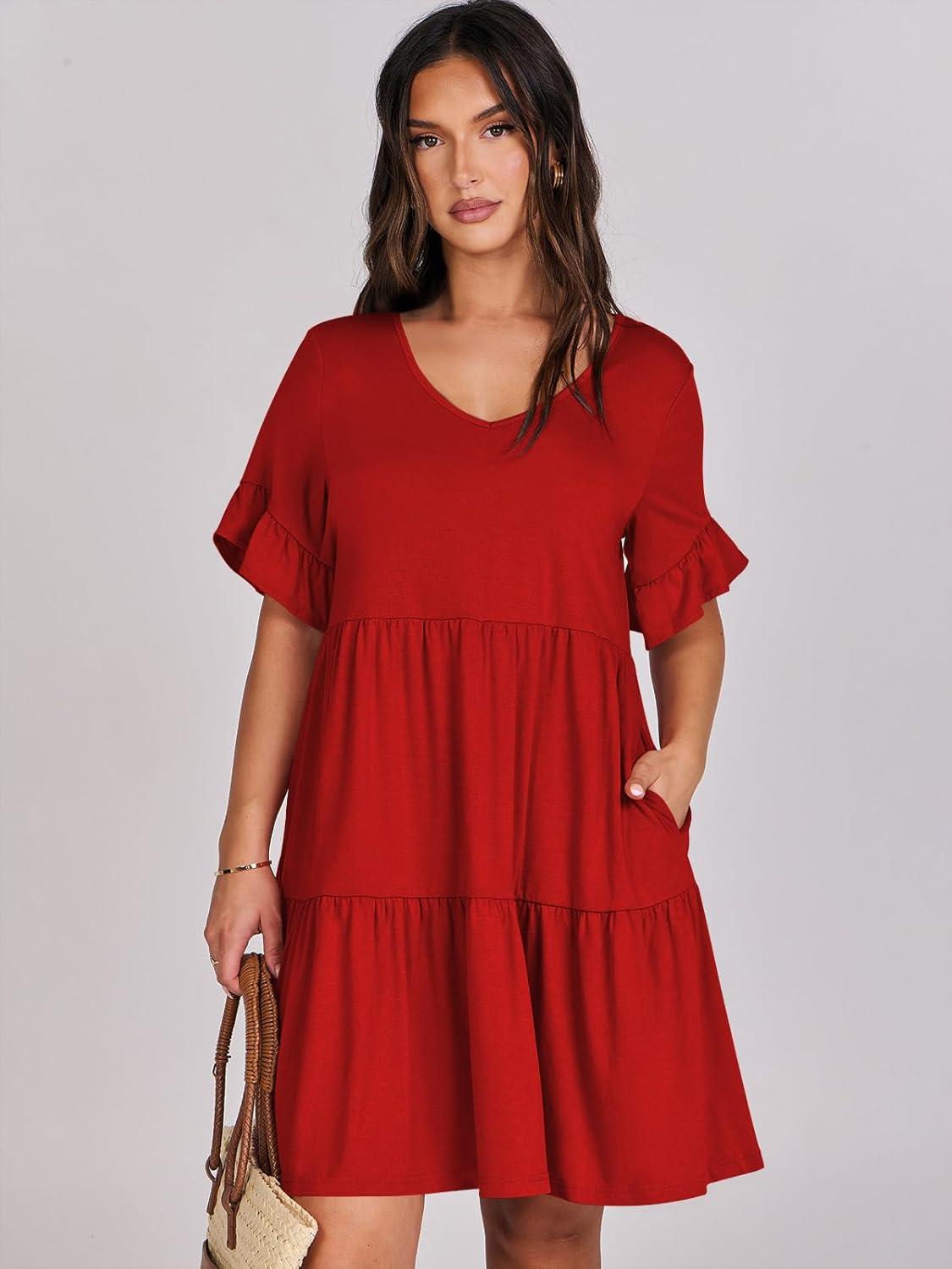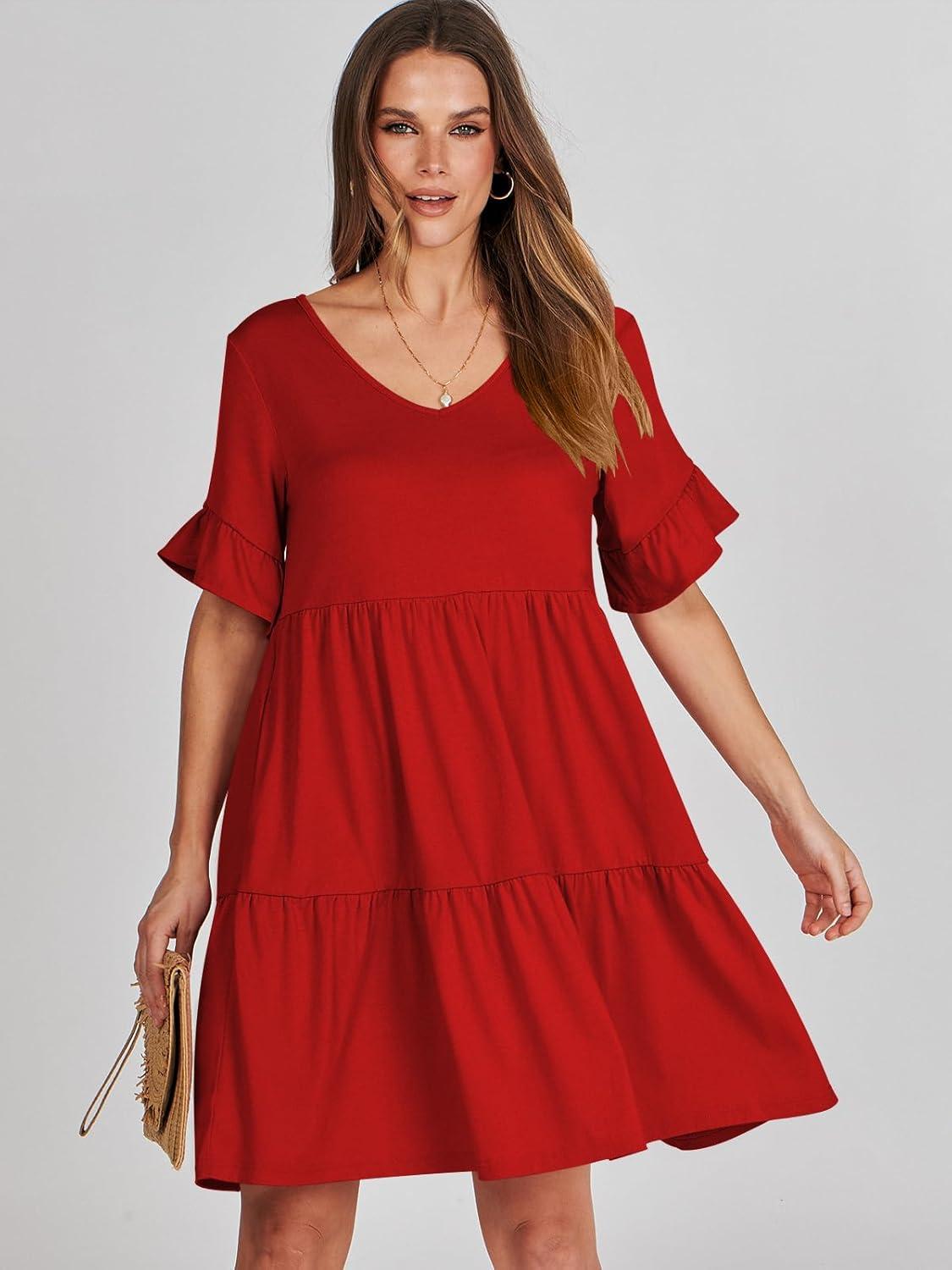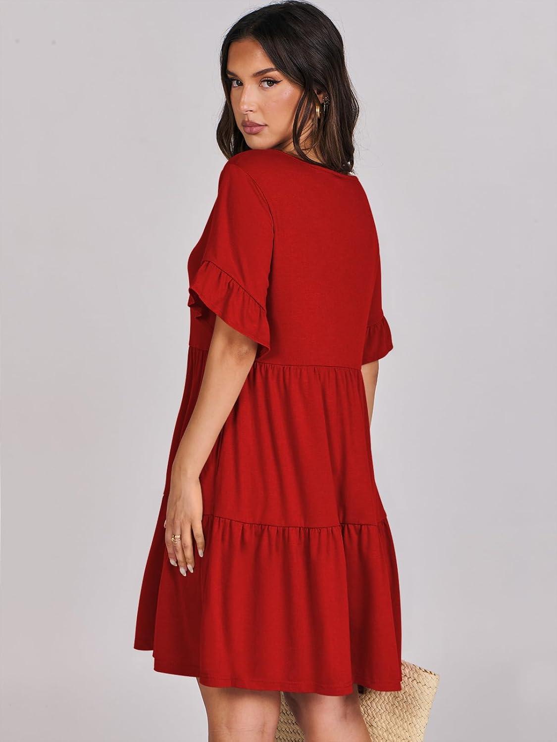 ANRABESS Dresses for Women Summer 2025 V Neck Ruffle Sleeve A Line Tiered Flowy Casual Trendy Mini Beach Dress with Pockets(Red)